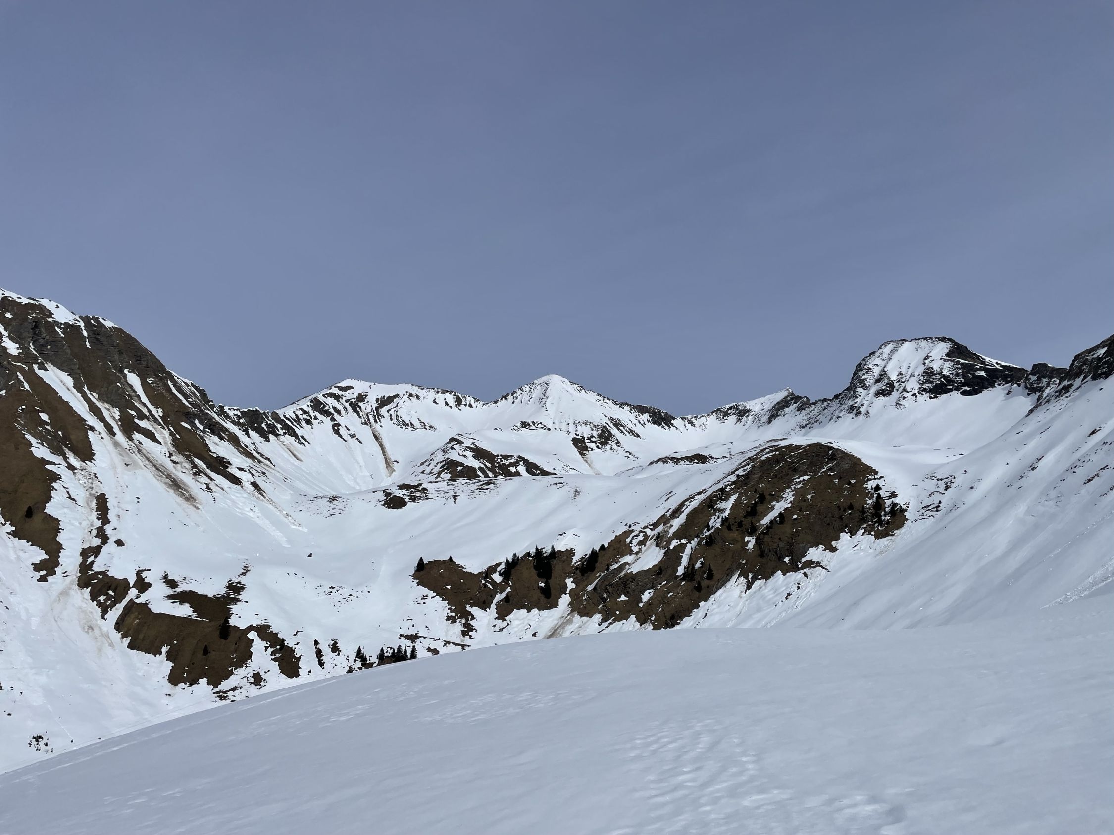 Schnee ab Brücke nach PP Fildrich. Fildrichkessel wie Ende April, kurze einzelne Portagen am Bach/Wald. Schlusshang ruppig, Sulz, zt durchbrechend. Viele Gleitschneelawinen an umliegenden Osthängen.