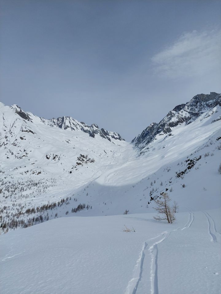 Von dort weiter dem Wanderweg entlang bis Ganderre, ca. 2000 m. ü. M., ist der Schnee noch gefroren. Von da bis ca. 2300 m. ü. M. hat es Bruchharst. Auf dem restlichen Weg bis zum Skidepot hat es Pulver auf harter Unterlage. Im oberen Teil sind Harscheisen hilfreich.