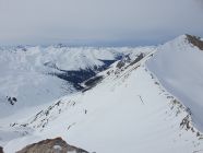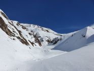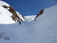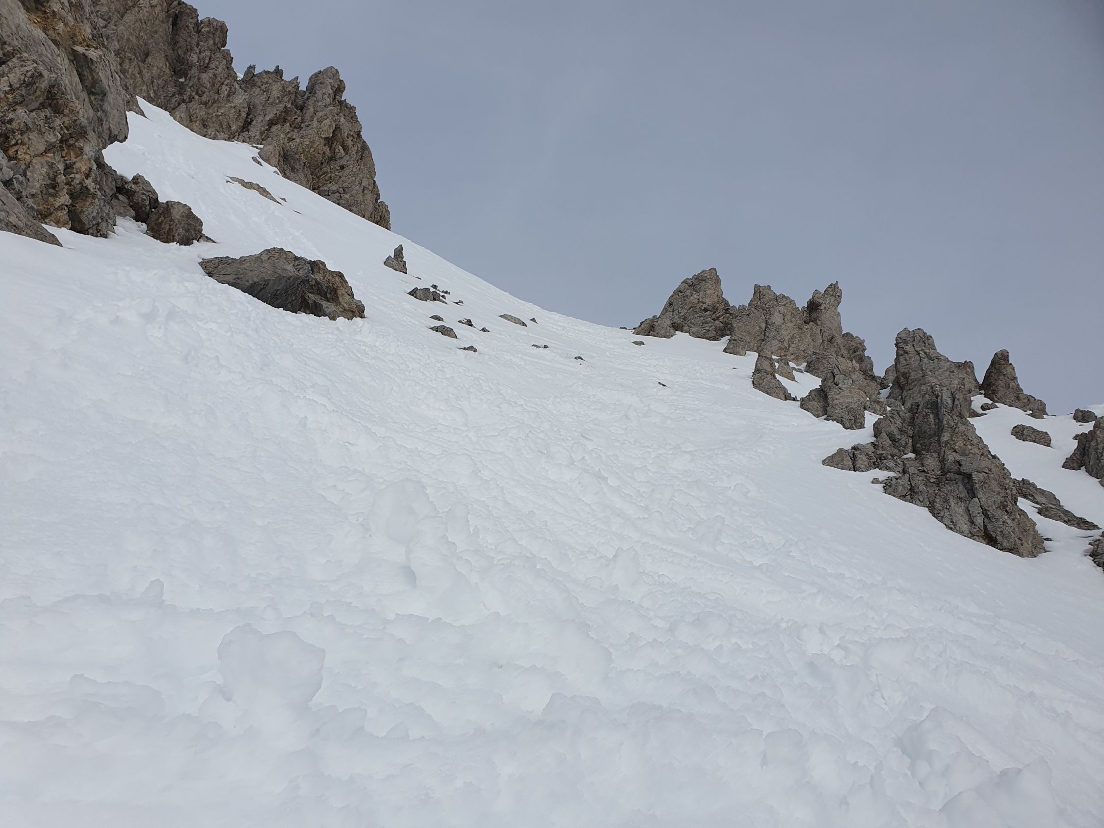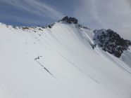 Bei P2804 verführt ein Couloir in östlicher Richtung die Sinnen. Es muss jedoch unbedingt südlich abgefahren werden. Die steilste Passage kann abgerutscht (so wie ich gemacht) oder kurz gelaufen werden. Danach in toller Sulz bis bei ca. 2400, danach Bruchharsch mit Nassschnee.