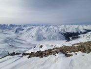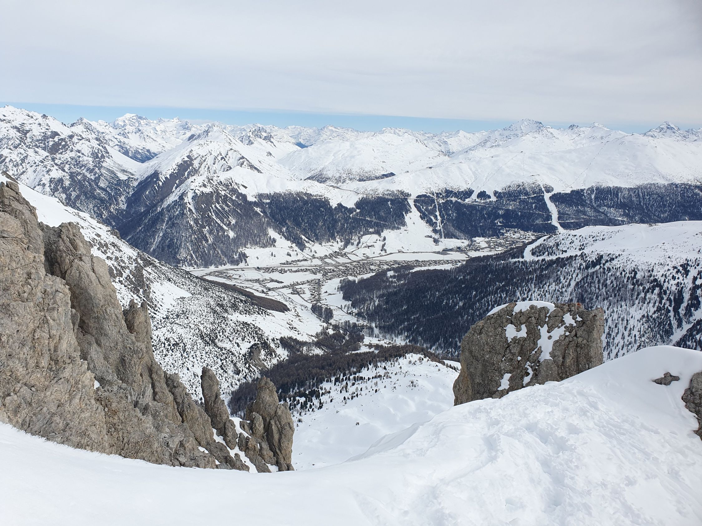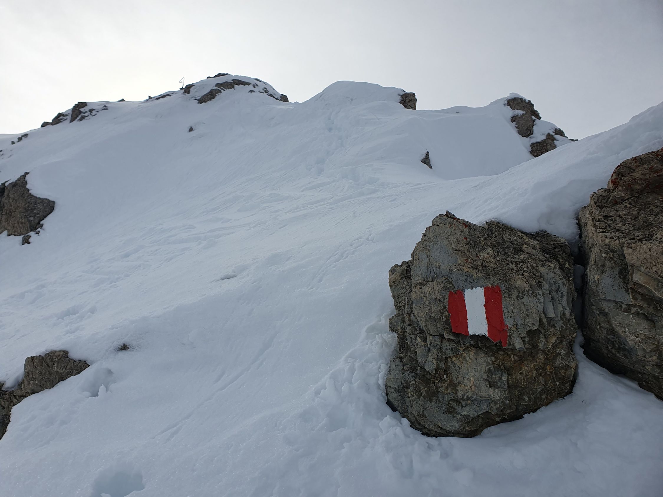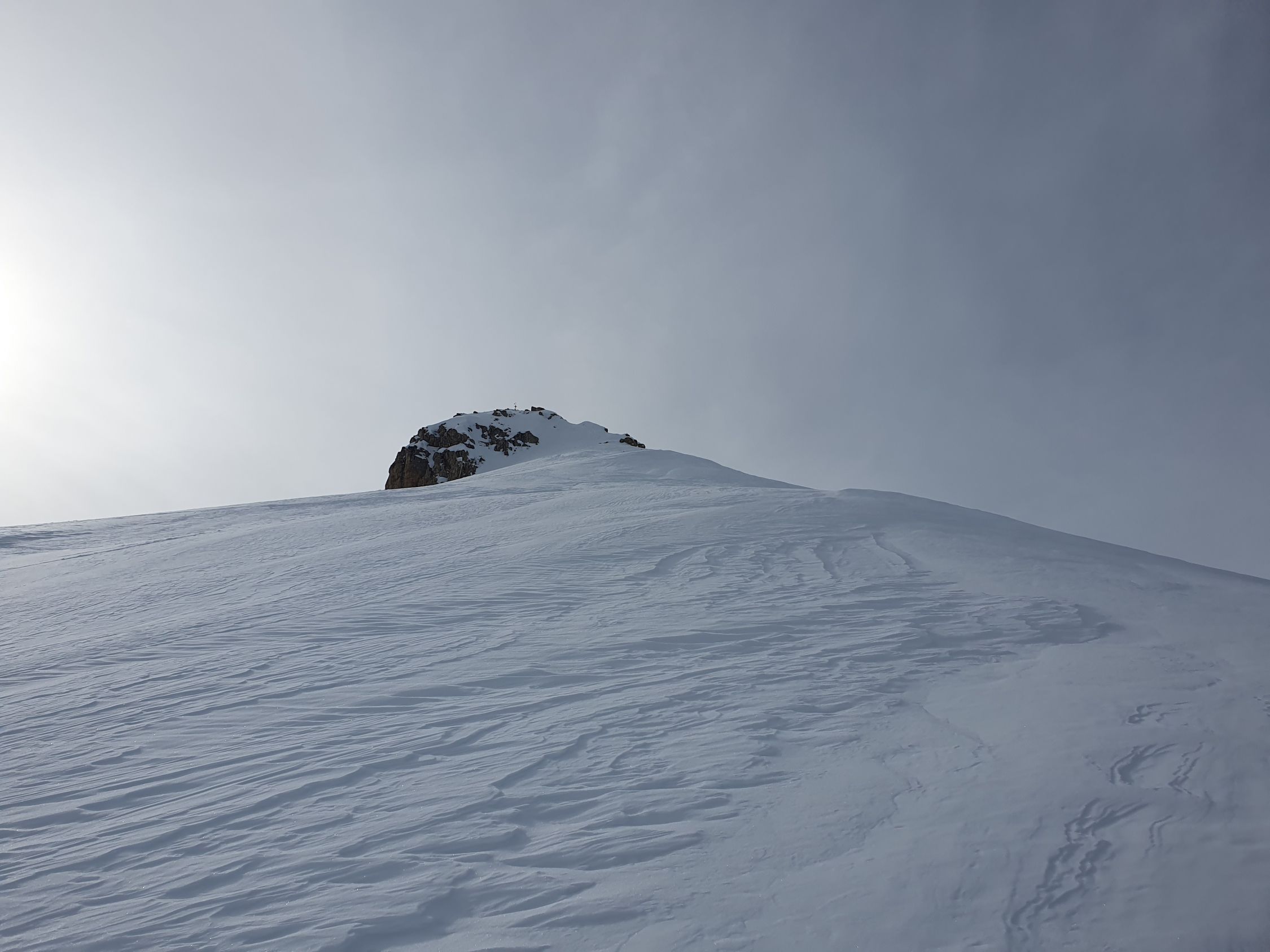 Da ich noch den Piz da Rin anschliessen wollte, und ich nicht ab- und kurz danach nochmals anfellen wollte (da bin ich manchmal etwas zu faul), bin ich bis zu P2896 hinabgelaufen, die angefellten Skis angezogen und den Nordosthang vom Piz da Rim möglichst steil nach oben traversiert (Pulver auf harter Unterlage), damit ich ohne viel Höhenverlust die Ostflanke des Piz da Rim erwischen konnte. Ab hier hatte es Spuren zum Gipfel von Livigno her kommend. Dann immer steiler werdende Spur auf Hartschnee bis zum Skidepot kurz unterhalb des Gipfels. Die letzten Meter unschwiereig zu Fuss bis zum Piz da Rim.