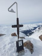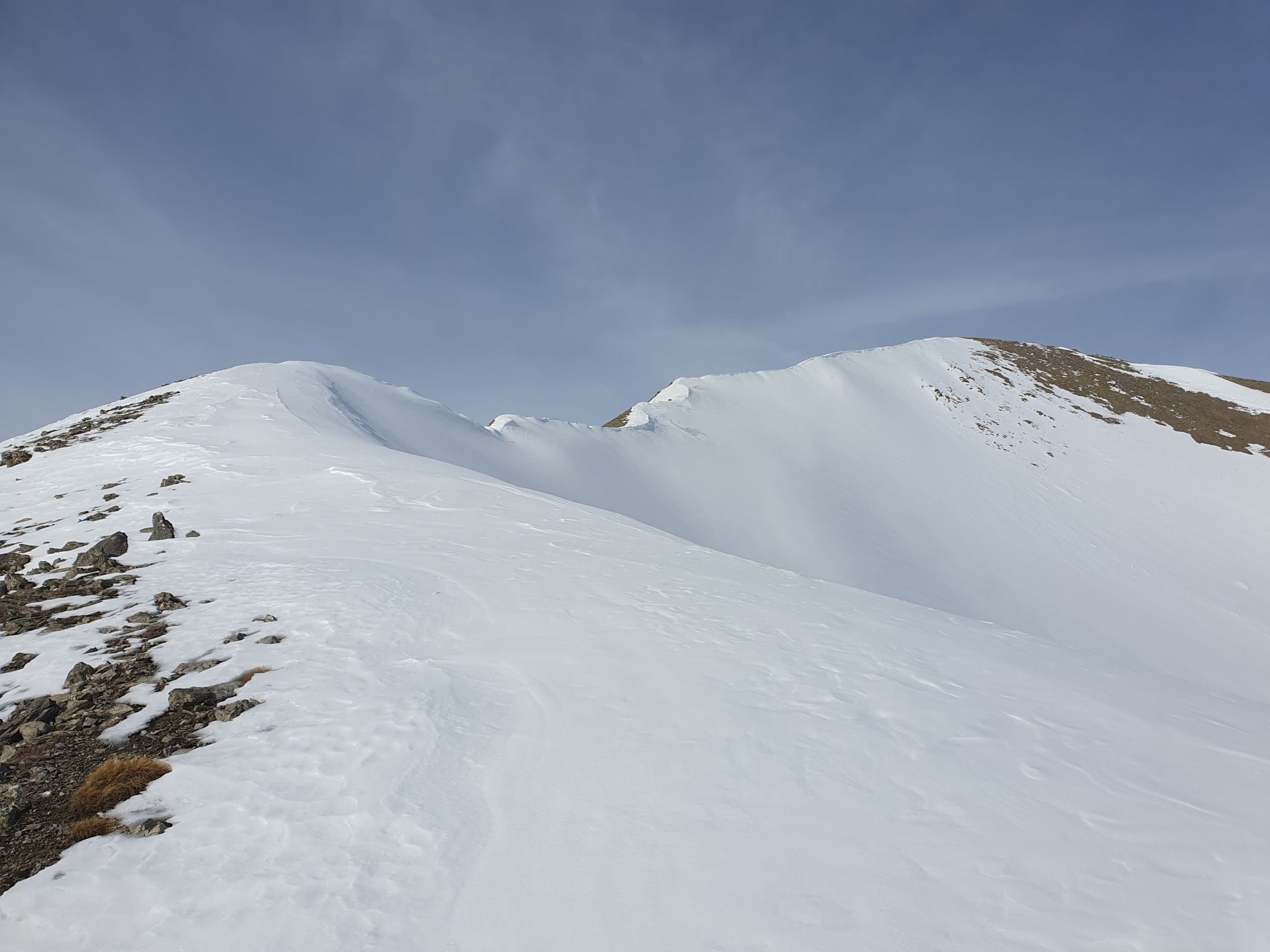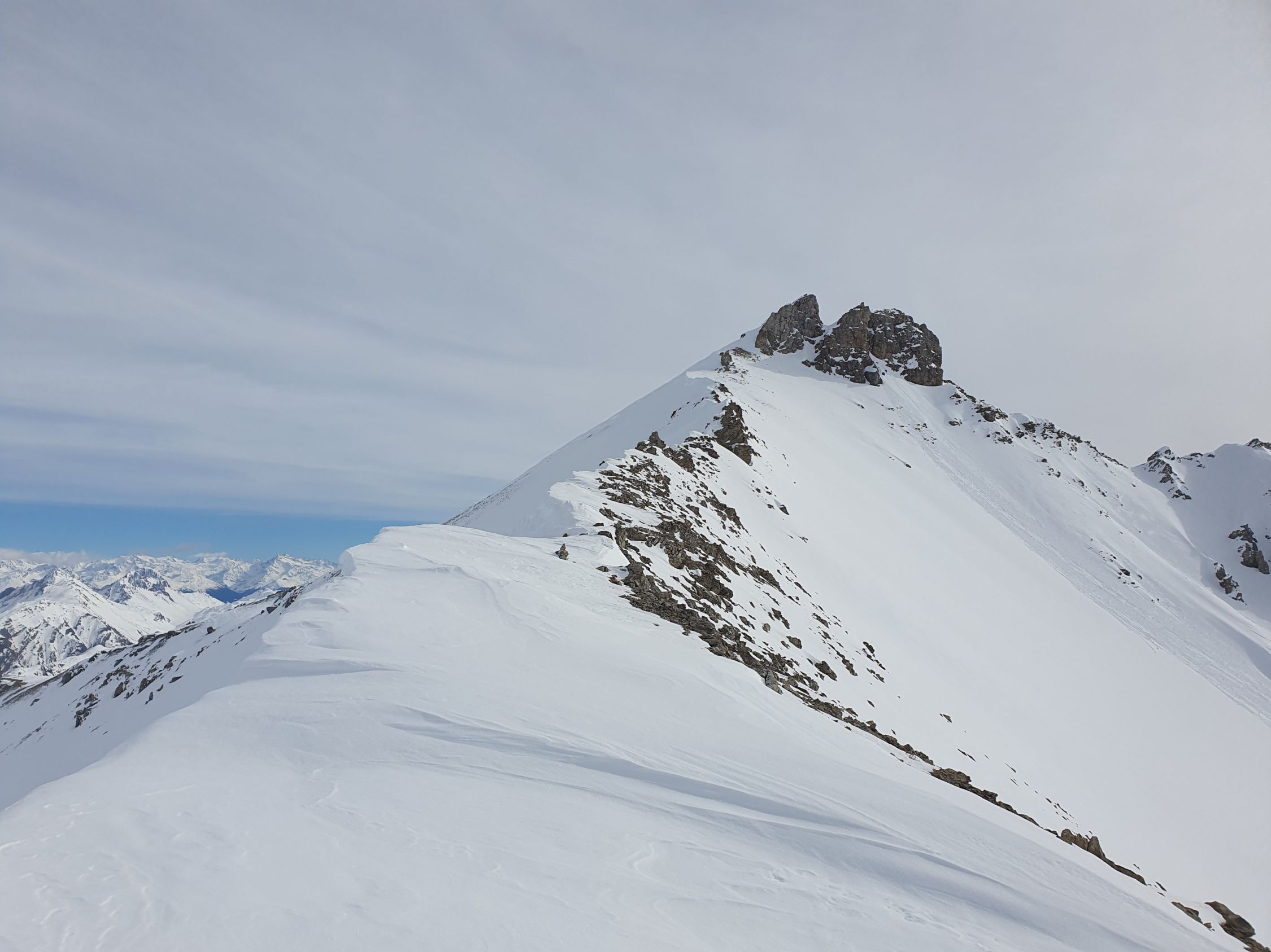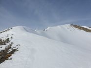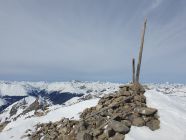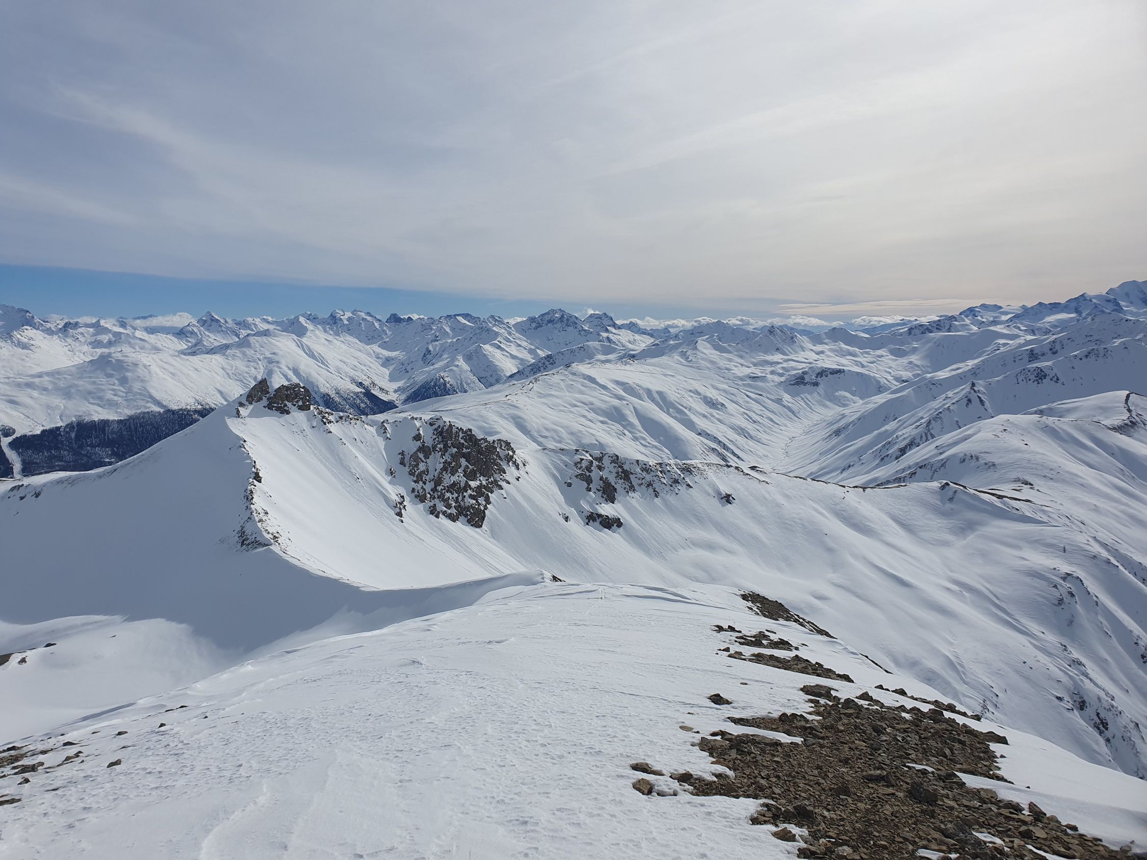 Da ich noch den Piz da Rin anschliessen wollte, und ich nicht ab- und kurz danach nochmals anfellen wollte (da bin ich manchmal etwas zu faul), bin ich bis zu P2896 hinabgelaufen, die angefellten Skis angezogen und den Nordosthang vom Piz da Rim möglichst steil nach oben traversiert (Pulver auf harter Unterlage), damit ich ohne viel Höhenverlust die Ostflanke des Piz da Rim erwischen konnte. Ab hier hatte es Spuren zum Gipfel von Livigno her kommend. Dann immer steiler werdende Spur auf Hartschnee bis zum Skidepot kurz unterhalb des Gipfels. Die letzten Meter unschwiereig zu Fuss bis zum Piz da Rim.