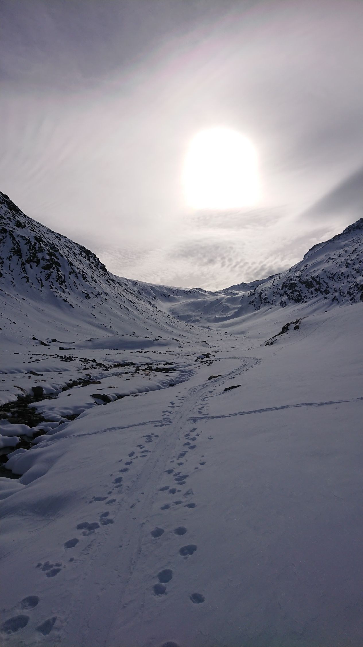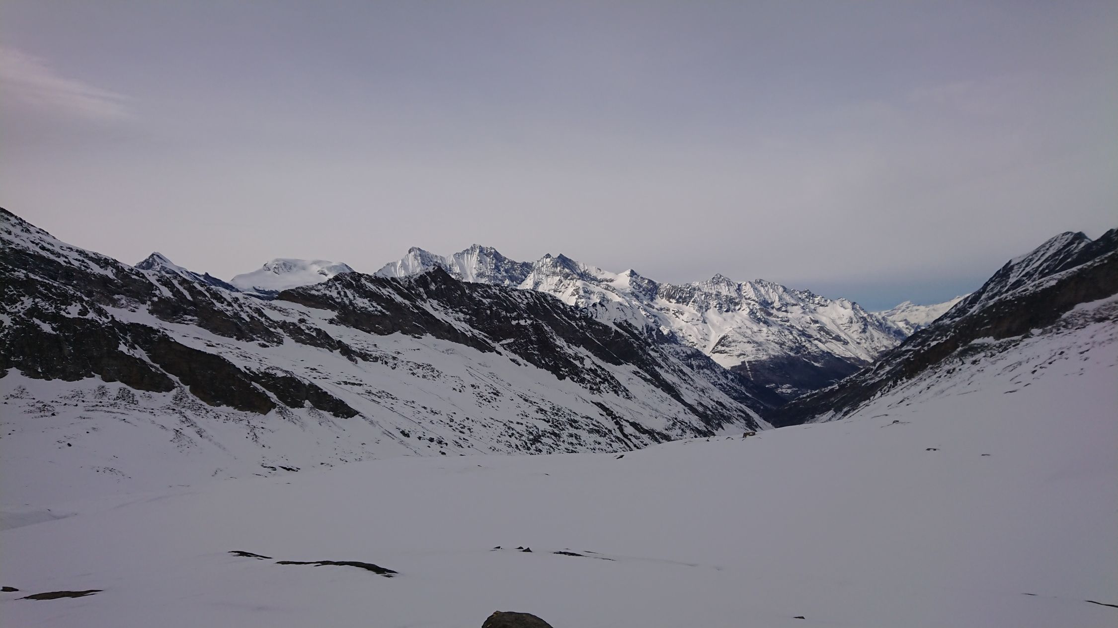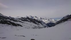 Wenig Schnee. Bis zur Furggalp pickelhart, mit Ski nicht möglich : Sind mit Steigeisen hoch. Dann weiter mit Ski, auch hier wenig Schnee. Gegen den Antronapass wurde es besser...
