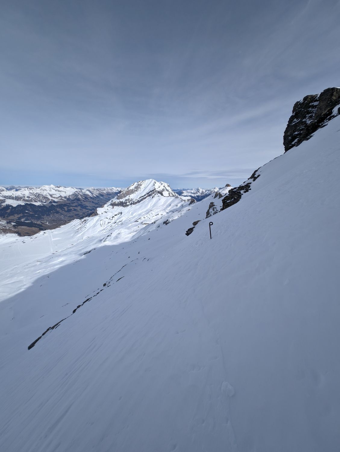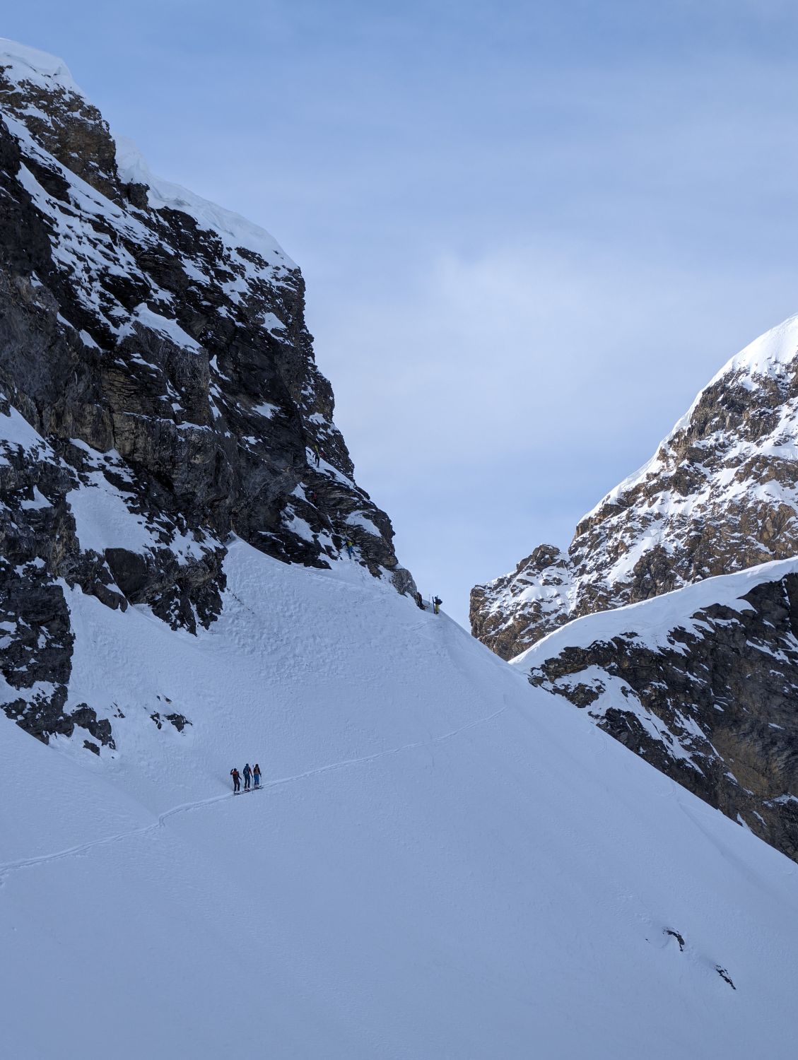 Auch nicht zu unterschätzen ist die Querung zum Strubelgletscher (Frühstückplatz). Passage ist sehr ausgesetzt. Spuren sind schmal. Zudem hat der Wind am Nachmittag Triebschnee im Spuren geblasen. Ich habe mich ab und zu gefragt, ob meinem Fuss auf dem Spur oder nebst dem Spur war. Es war für uns unangenehm. Was für mich gut funktioniert hat sind seitlich Bewegungen mit dem Pickel in die 2 Hände im Bremsposition. Ich habe mich sicherer gefühlt. Steigeisen werden auch hier dringend empfohlen. Nach einem Stück weit auf die Trittspur konnten wir wieder die Ski anziehen und nach Engstligenalp Abfahren.