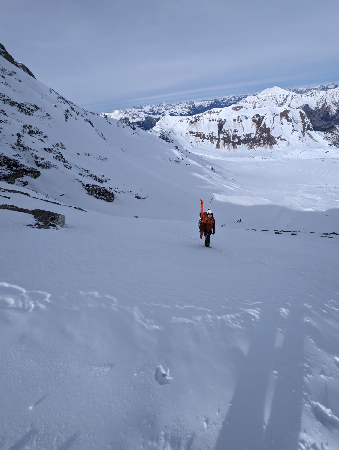 Abfahrt Richtung Frühstückplatz im harten/brüchigen Schnee. Dann kurze Gegenaufstieg zu Fuss bis P.3195 mit dem Ski auf dem Schulter (ca 20-30m). Abfahrt auf dem Ammertegletscher im hart/wenig Pulver Schnee und Querung zum Frühstückplatz auf 2960m zwischen 2 Felsband. Nicht zu unterschätzen. Dieser Passage ist ausgesetzt. Absturzgefahr ist hoch.