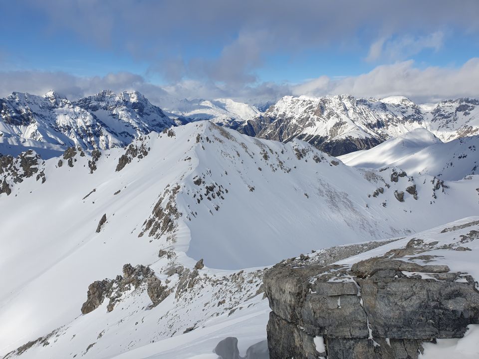 Heute hat sich das Wetter am Nachmittag aufs Mal gebessert, somit eine Mini-Nachmittags-Tour mit Liftunterstützung um 15:00 von der Bergstation Vallatscha in 40 Minuten auf dem Piz Vallatscha. Heute mit zwei kurzen Akrobatik-Übungen auf dem Grat mit Skis bis zum höchsten Punkt geschafft. Im Aufstieg angenehmer Sulz bis oben. Habe eine eigene, etwas steilere, aber dafür direktere Spur hinterlassen. Die alten Spuren vom Morgen waren schon leicht eingeschneit gewesen.
