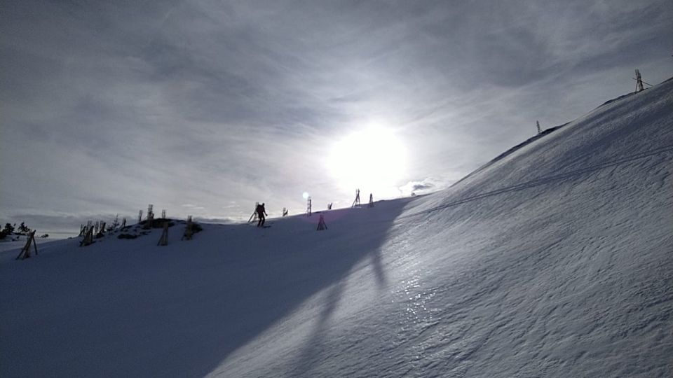 Mit Liftunterstützung ab Golm. Abfahrt über Äussere Golmalpe, Platzisalpe, Gasthof Rellstal - zuerst recht guter Schnee, das letzte Drittel wenig Schnee, aber immer noch machbar. Aufstieg zur Heinrich Hueter Hütte dem Fahrweg entlang ausreichend Schnee. Es ist ein sehr warmer Tag und wir können erst bei der Hütte entscheiden ob ein weitergehen Sinn hat. Juhu, wir gingen weiter. Immer recht weit links gehend (aufwärts gesehen) da vom Zimbajoch schon ein paar lawinen herunter kamen/kommen. Ab Kanzlatäli, wenn sich der Weg dann mehr in westliche Richtung dreht schon passabler Schnee. Dann dreht sich die Aufstiegsroute so dass die letzten ca. 180HM in super Pulverschnee waren.