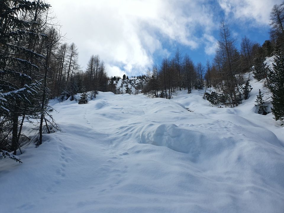 Die Abfahrt war zuoberst ein Traum, doch in der Waldschneise Laviner Gitmot spürte man unter der Pulverschicht ein stark verfahrenes Gelände auf einer Hartschneeschicht, was den Genuss leider einschränkte. Nach der Alp Laisch bin ich auf dem Alpweg hinab zu P1566 gefahren (Schneeschuhspuren gesichtet). Kurz vor Tarasp Fontana wurde es auf der Forststrasse knapp mit dem Schnee.
