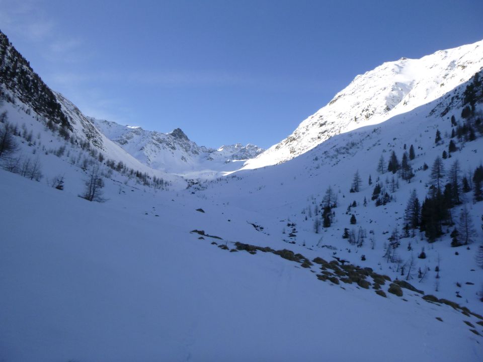 Tourenbeginn um 07:25 Uhr bei -2°C unter klarem Himmel. Der Schnee war überfroren und trug. Dadurch leichtes Fortkommen am Morgen und Abend unterhalb 2400 m. Darüber war der Schnee noch pulvrig, wo die Sonne nicht hinkommt (Nordseite). Aufgrund der Temperaturerwärmung mittags bot der Schnee auf dem steilen Westgrat gute Trittverhältnisse. Er war gespurt von Skitourengängern, die über die Südseite (Laschadura) kamen. Eine kühne (!) Abfahrtskispur war sichtbar durch das nordseitige Steil-Couloir am Felszahn des Clucher da Nuna vorbei und durch ostseitige Steilrinne zum Schuttrichter hinab.