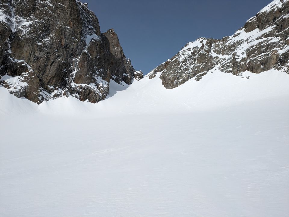 Wir kehrten auf zirka 2'730m um und konnten die tolle Abfahrt voll auskosten, denn im unteren Teil gab es bereits um ca. 11:30 Uhr an den sonnenbeschienenen Stellen lokal leichten Deckel.