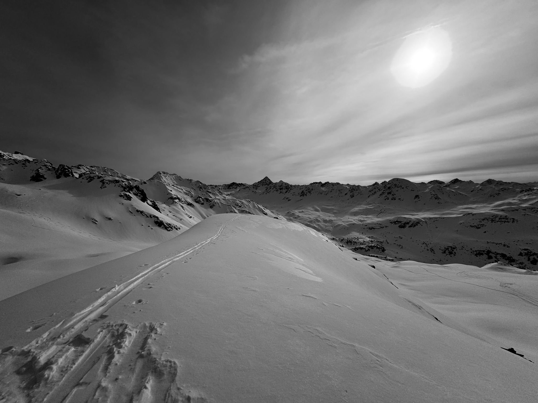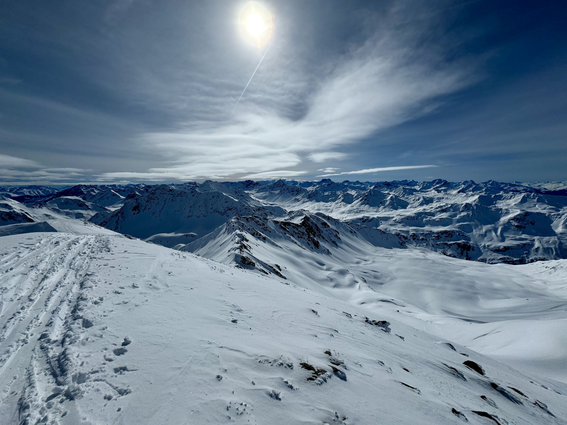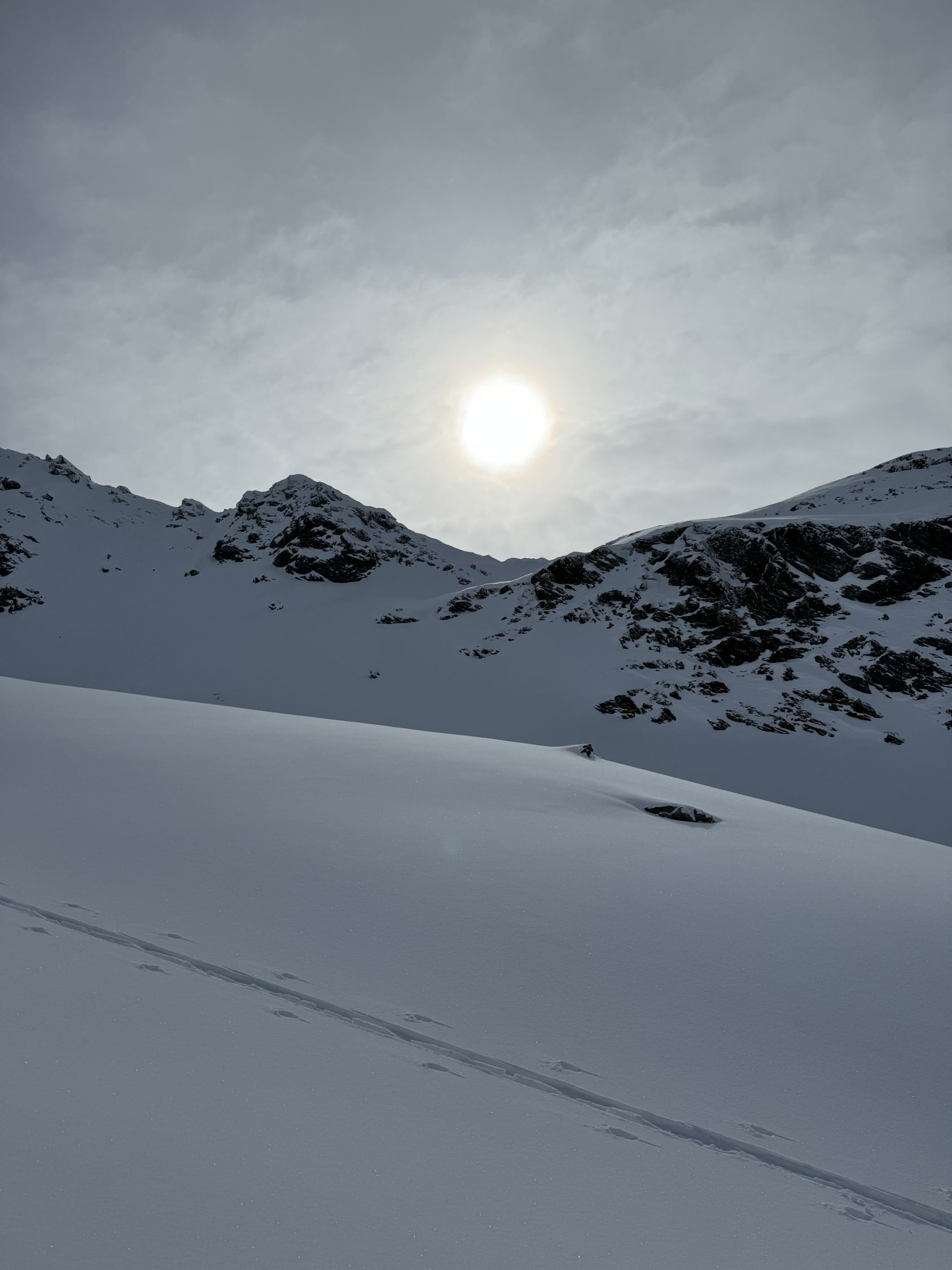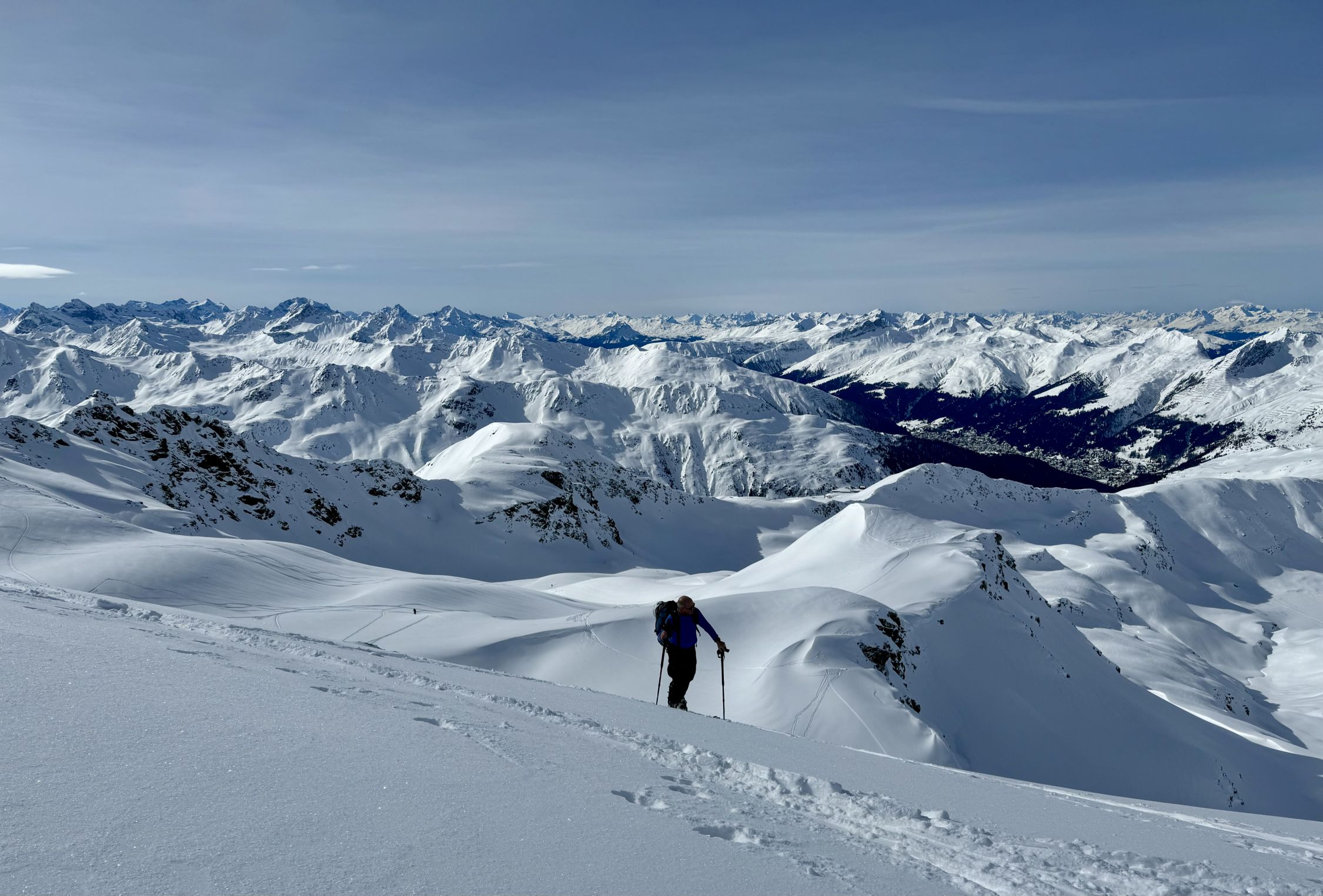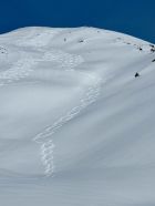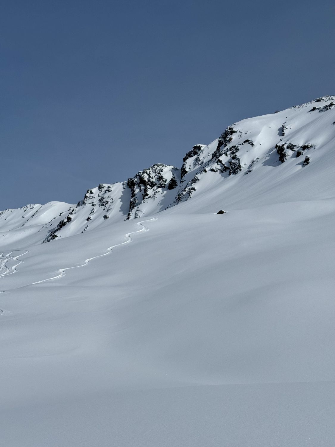 In den Südhängen ist der Neuschnee bereits etwas angefeuchtet. Gute, tragende Unterlage.