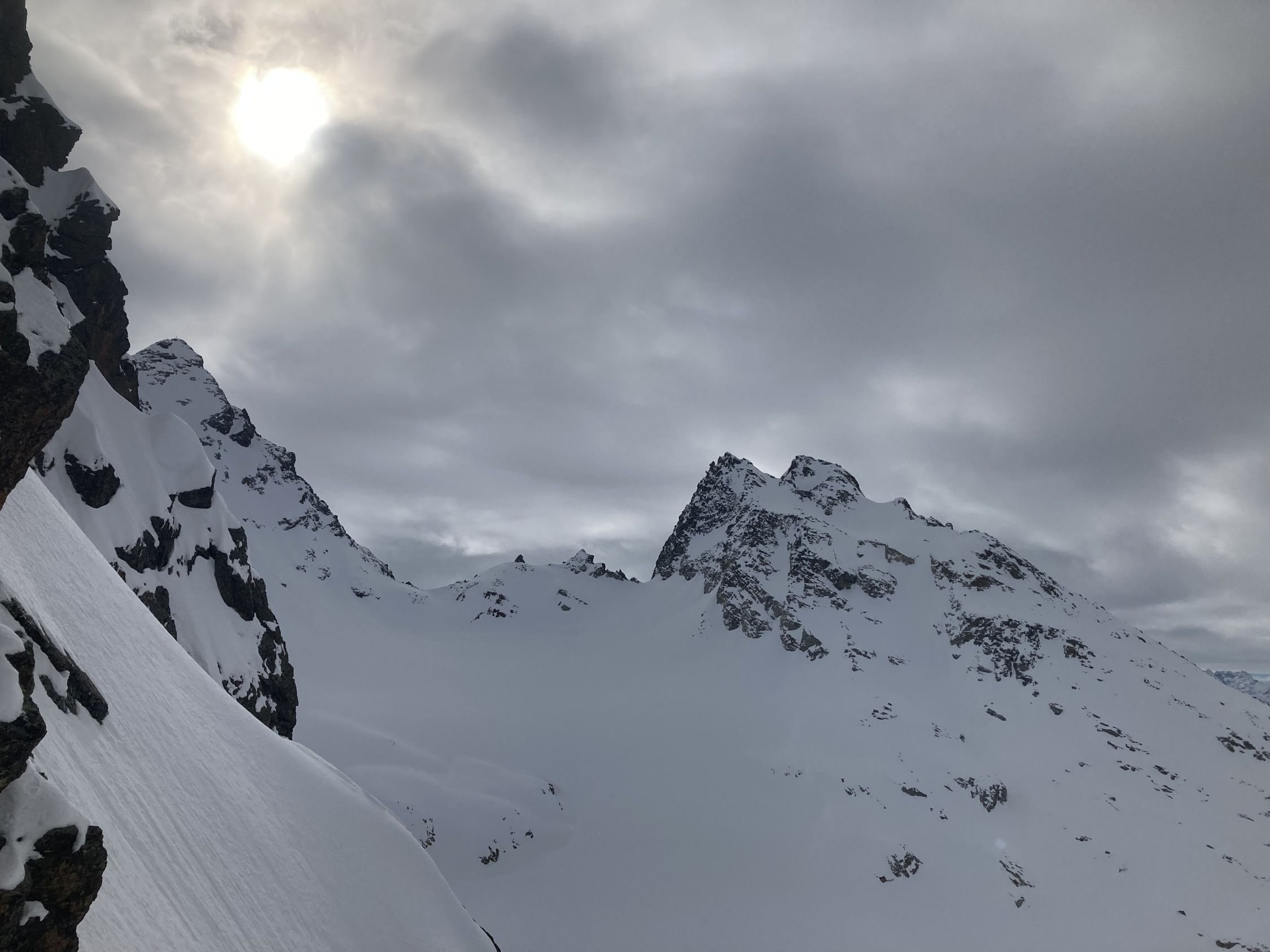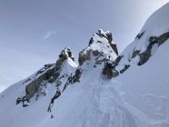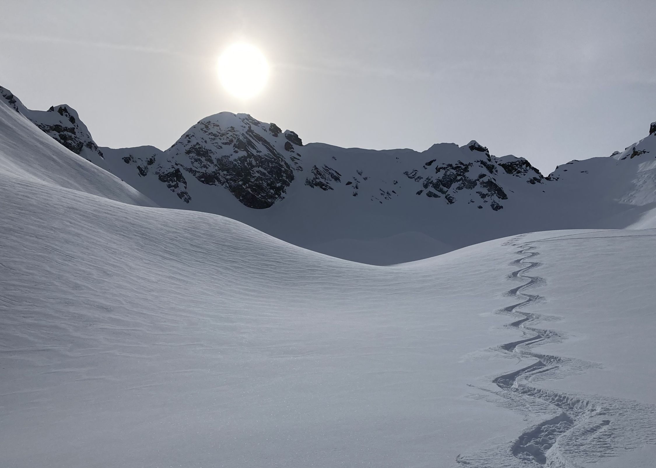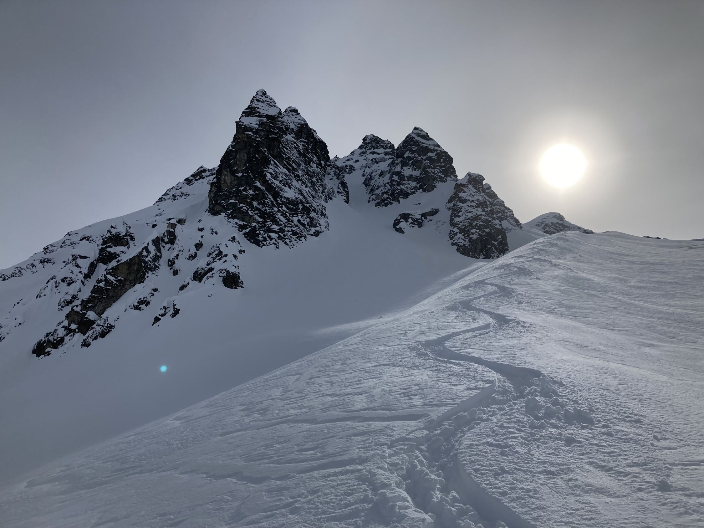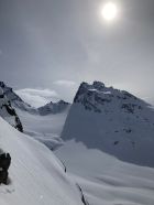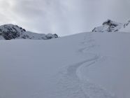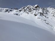 Oben gesetzter Pulver auf weichem Untergrund, unter ca. 2300m auf hartem Untergrund. Im unteren Teil schwerer Schnee, zum Teil Deckel. Bei den guten Bedingungen den Gipfelhang noch zweimal aufgestiegen (jeweils 550 Hm).