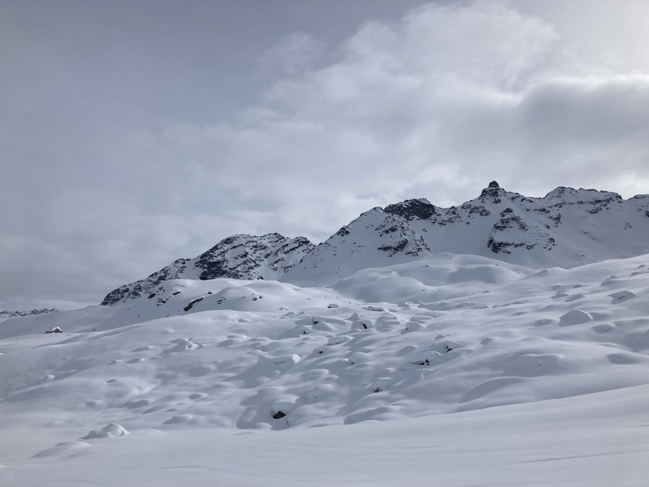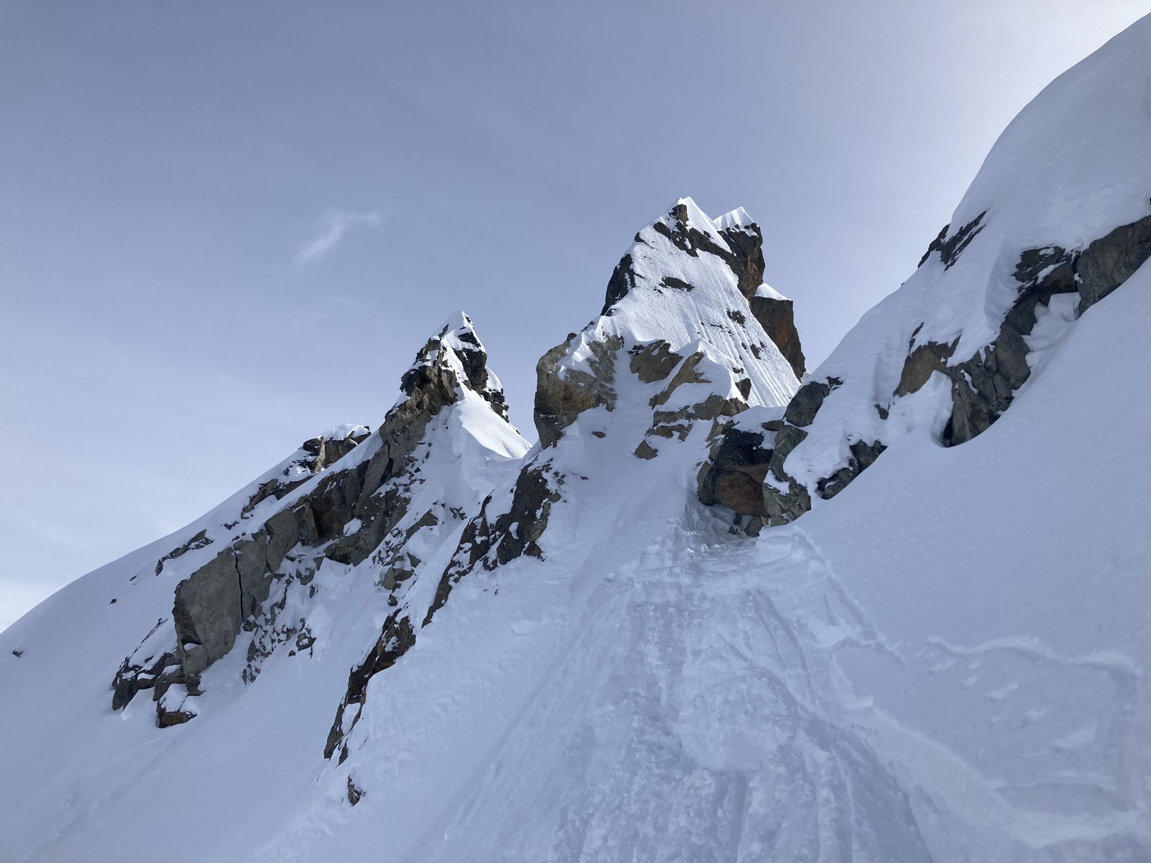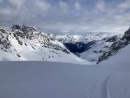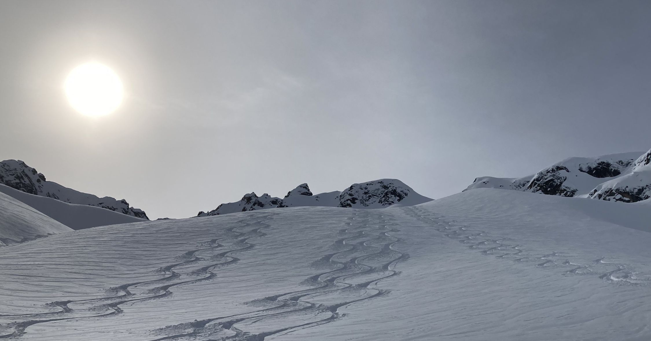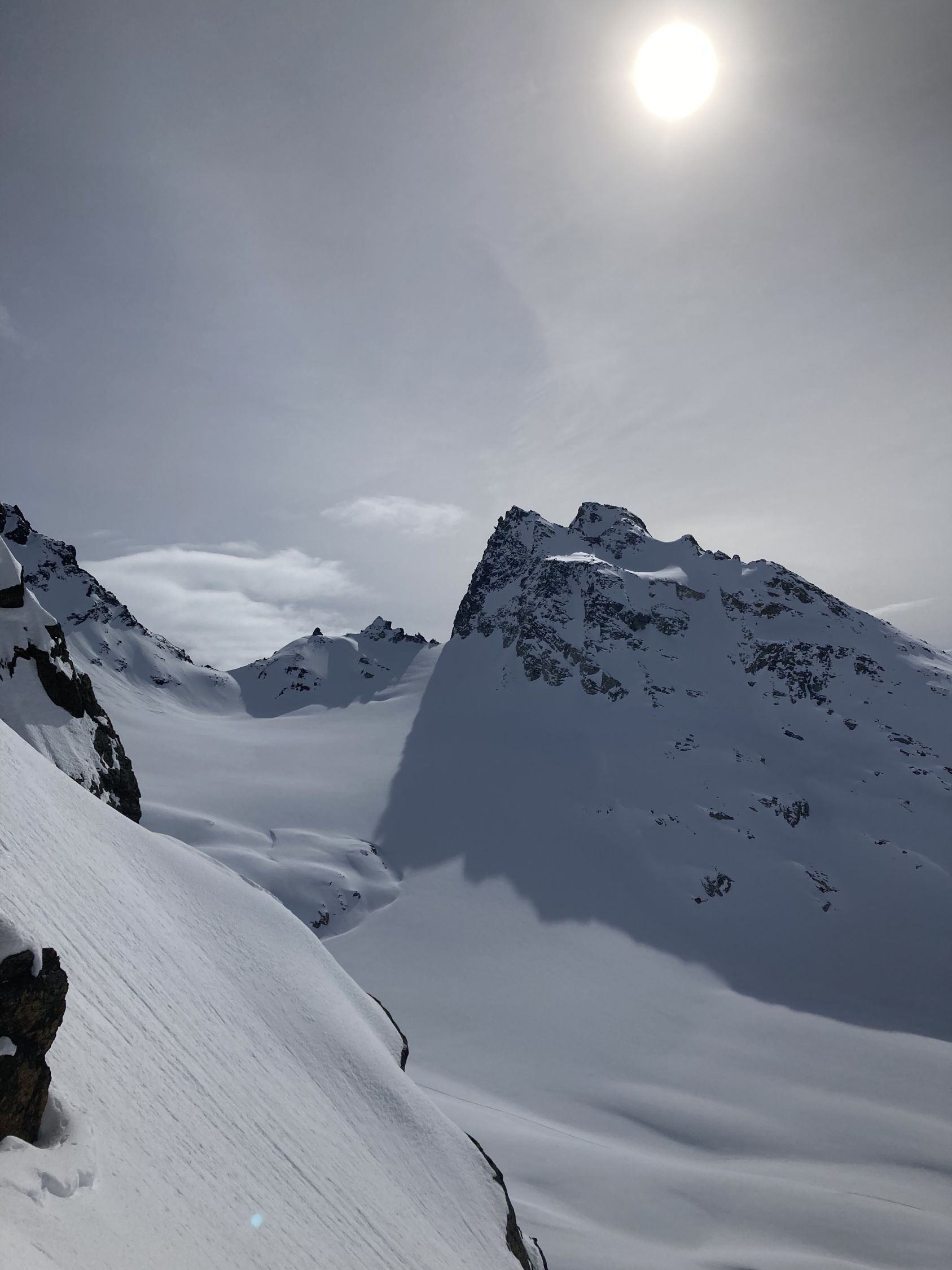 Oben gesetzter Pulver auf weichem Untergrund, unter ca. 2300m auf hartem Untergrund. Im unteren Teil schwerer Schnee, zum Teil Deckel. Bei den guten Bedingungen den Gipfelhang noch zweimal aufgestiegen (jeweils 550 Hm).