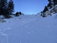 Das Pistenband besteht noch, ist aber sehr eisig, daher Aufstieg mit Harscheisen. Querung zum Homadlift teils Ski tragen. Ab 1300 m lagen die ersten Flocken, bis 1600 m max. 3 cm gefallen, dorthin noch auf Pistenunterlage. Ab 1600 m bis 2000 m etwas mehr Schnee, im Wald aper mit Ski tragen. Ab 2000 m eisige Verhältnisse, es hat bis zum Gipfel reingeregnet und der nachfolgende Schnee wurde verblasen. Daher alles wieder mit Harscheisen bis nach oben.