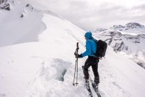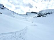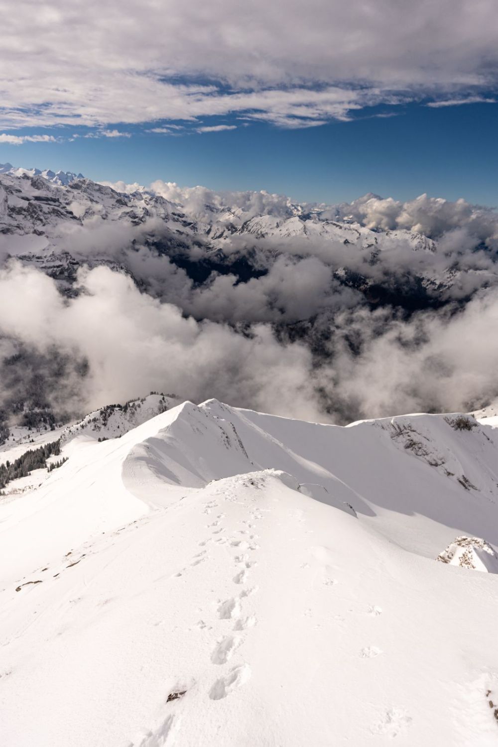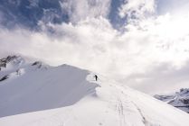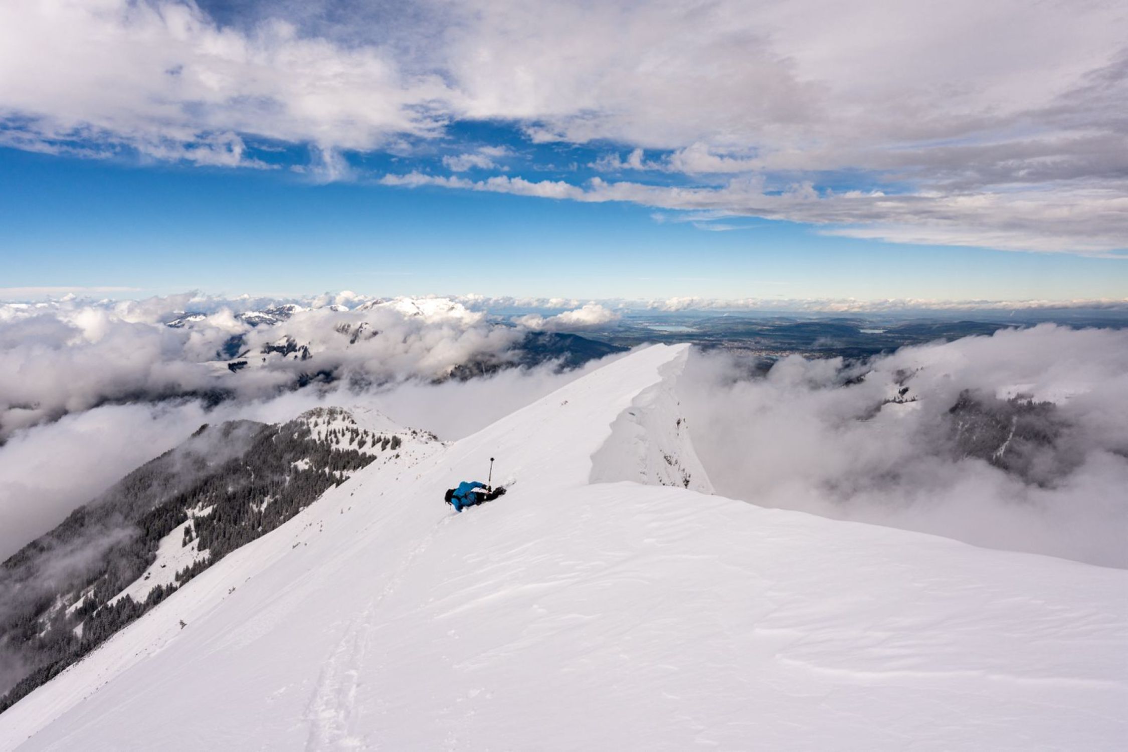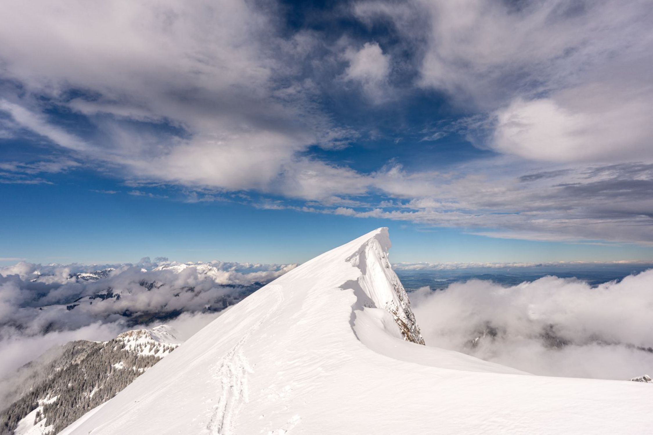 Wir waren allein am Berg bei bestem Wetter und toller Fernsicht. Die Wechten am Grat sind gross und tückisch, mein Kollege ist eingebrochen, konnte sich zum Glück aber halten (siehe Fotos).