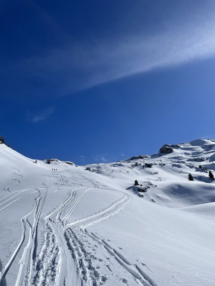 Die dünne Schneedecke unterhalb der Fronalp wird bei den warmen Temperaturen schnell wieder weg sein. Morgen sicher noch bei gleichen Verhältnissen machbar.