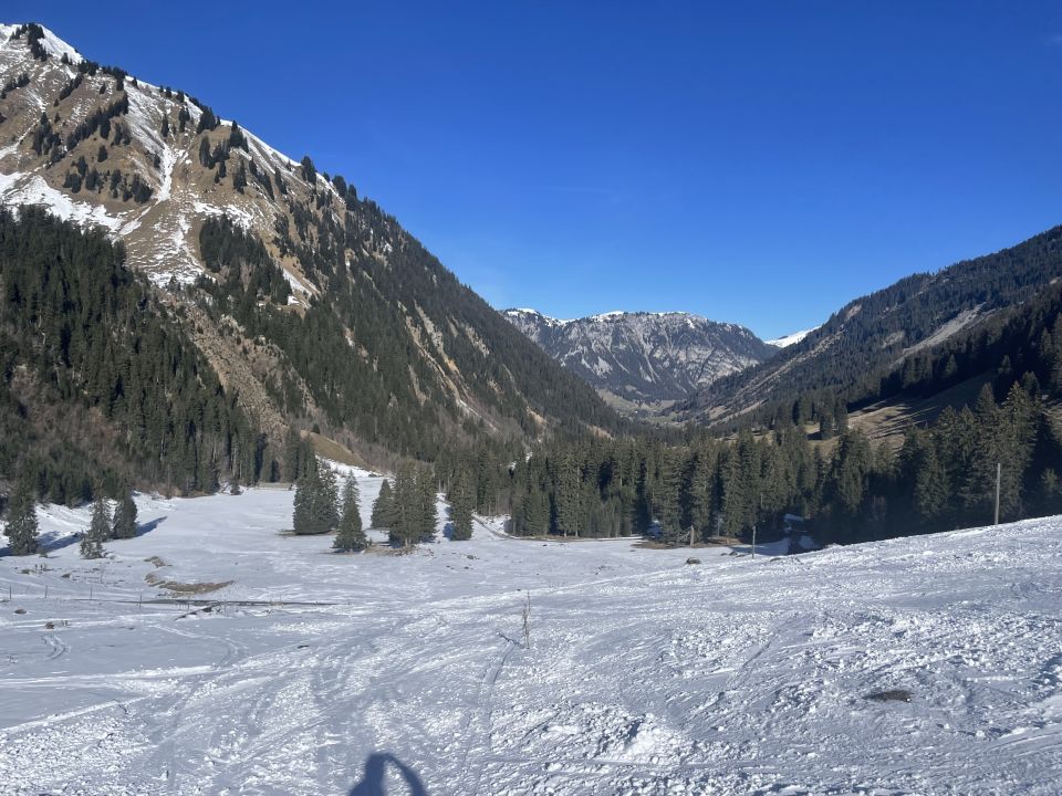 Abfahrt war dann sehr gut, nur oben etwas gepresst/hart. Bin in den Hang nordwestlich von P. 2417, nur eine Spur von gestern drinnen, sonst schön zu fahrender Pulver. Auf ca. 2000 m noch etwas Sulz erwischt, weiter unten wieder Pulver, der natürlich abnimmt, aber bis 1500m spürbar ist. Habe mich über der Alpstrasse gehalten und bin erst kurz vor der Brücke drauf, um die aperen Stellen zu vermeiden.