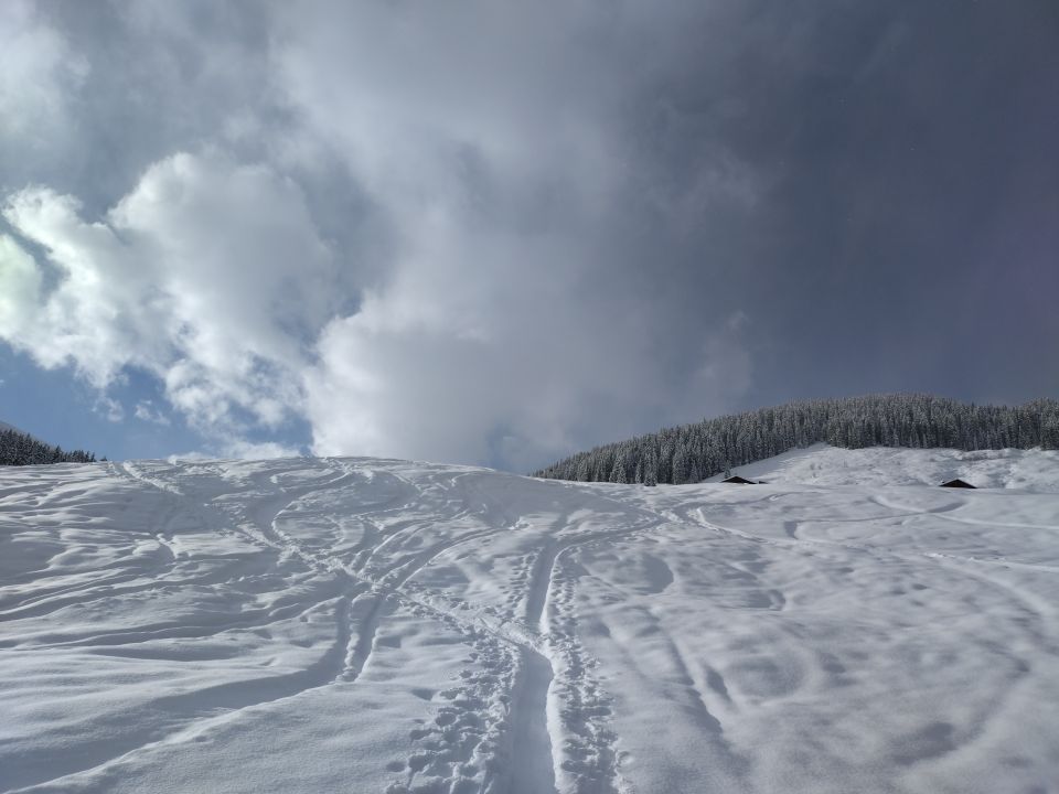 Genügend Schnee ab Start. Es lag etwas frischer Pulverschnee, im Gipfelbereich ca. 30 cm. Im unteren Bereich wurde der Schnee schnell feucht.