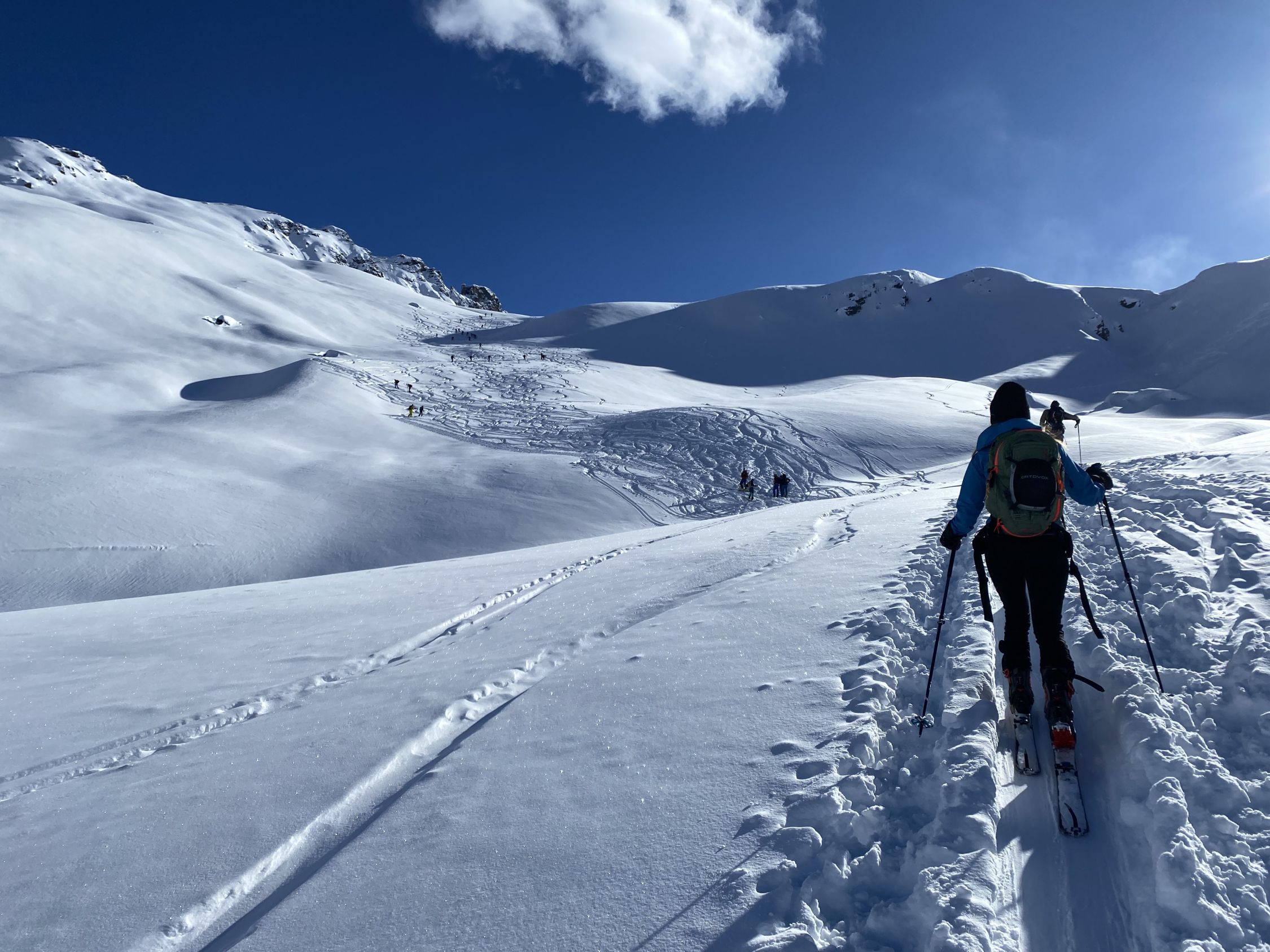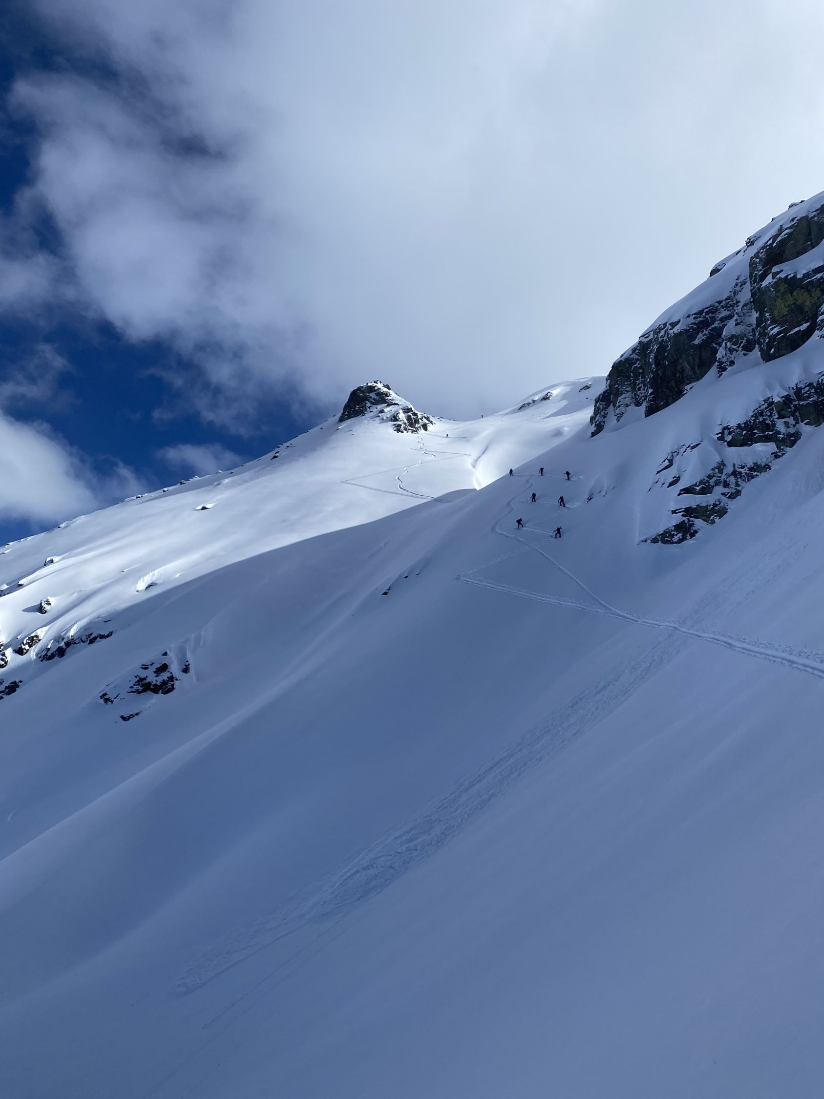 Morgens zum Start sehr kalt und winterlich verschneit. Es hat ca. 40-50 cm Neuschnee gemacht. Aufstiegsspur bis Gipfel vorhanden - dieses Mal keine Spurarbeit erforderlich :-) im oberen Drittel oft sehr windig und der Schnee leicht verfrachtet, aber noch sehr gut zu fahren. Heute sehr viele Tourengeher im Gebiet unterwegs.