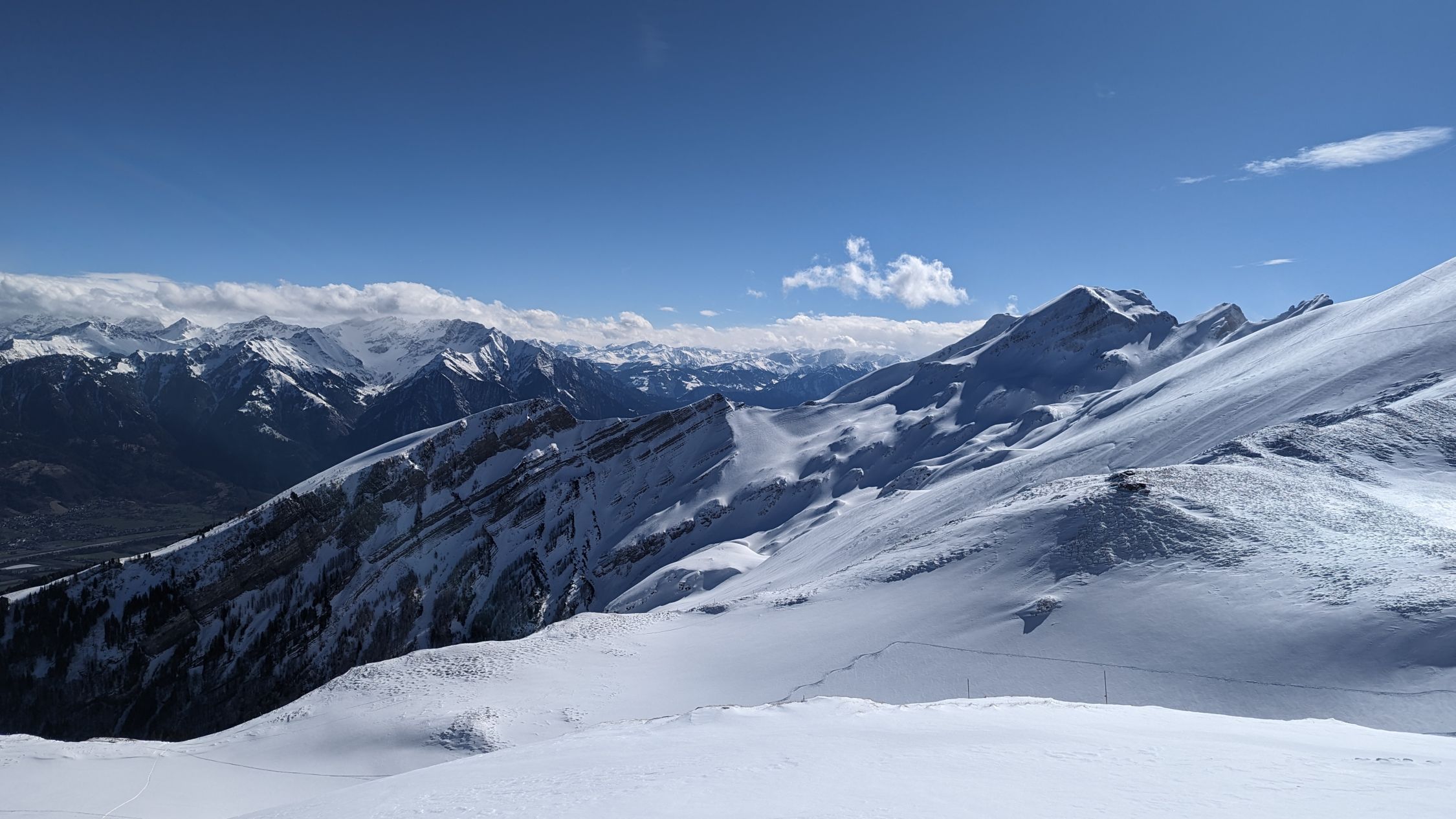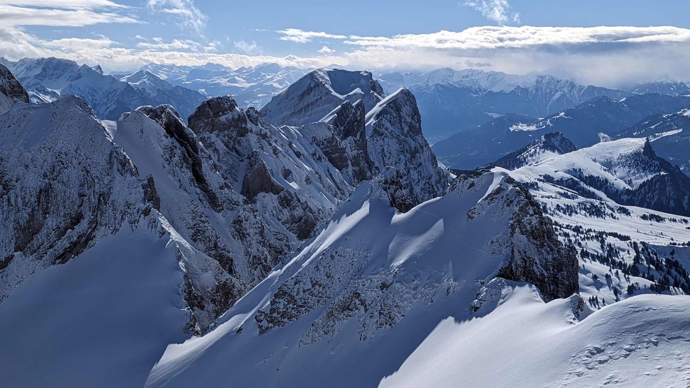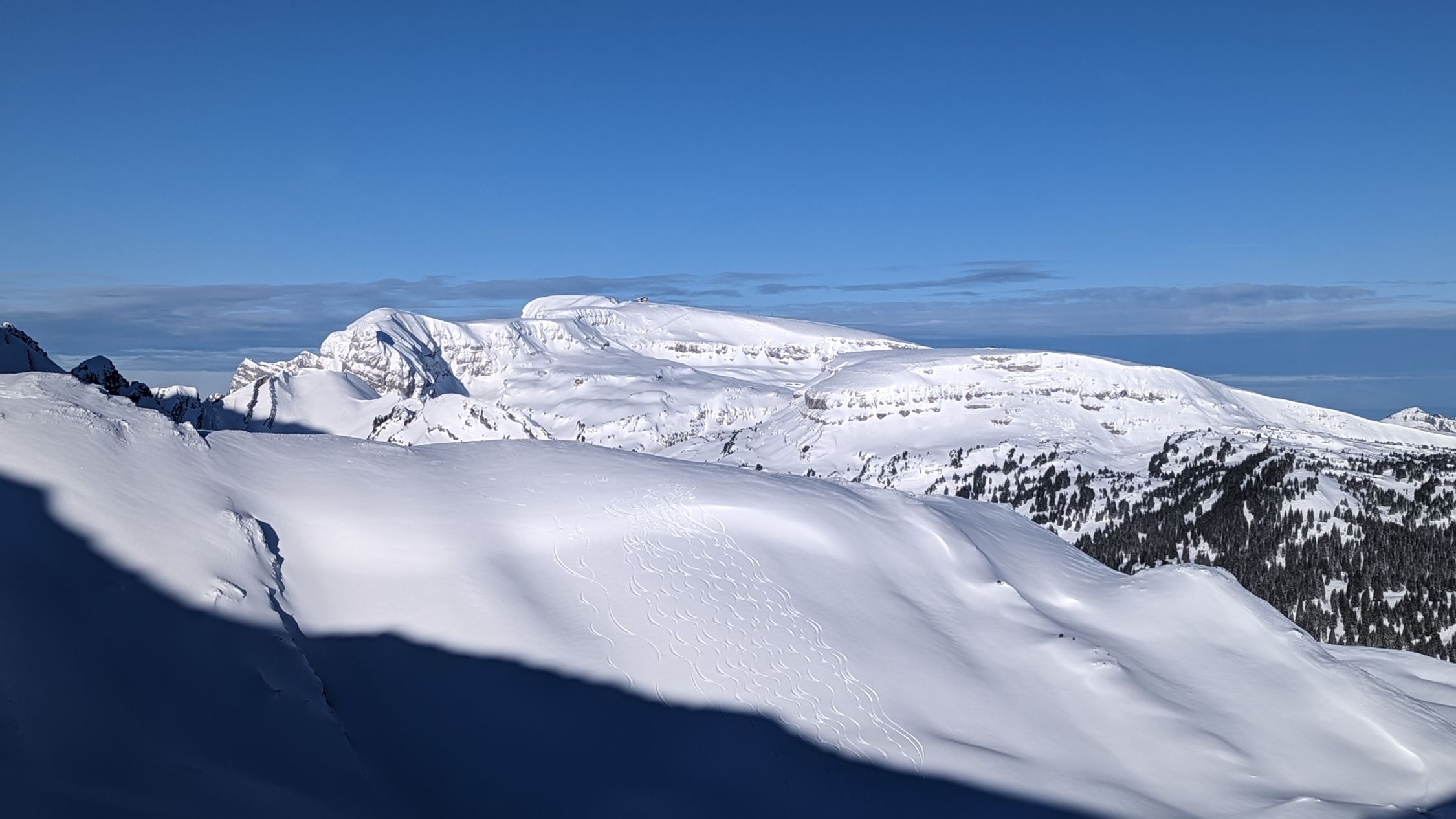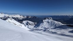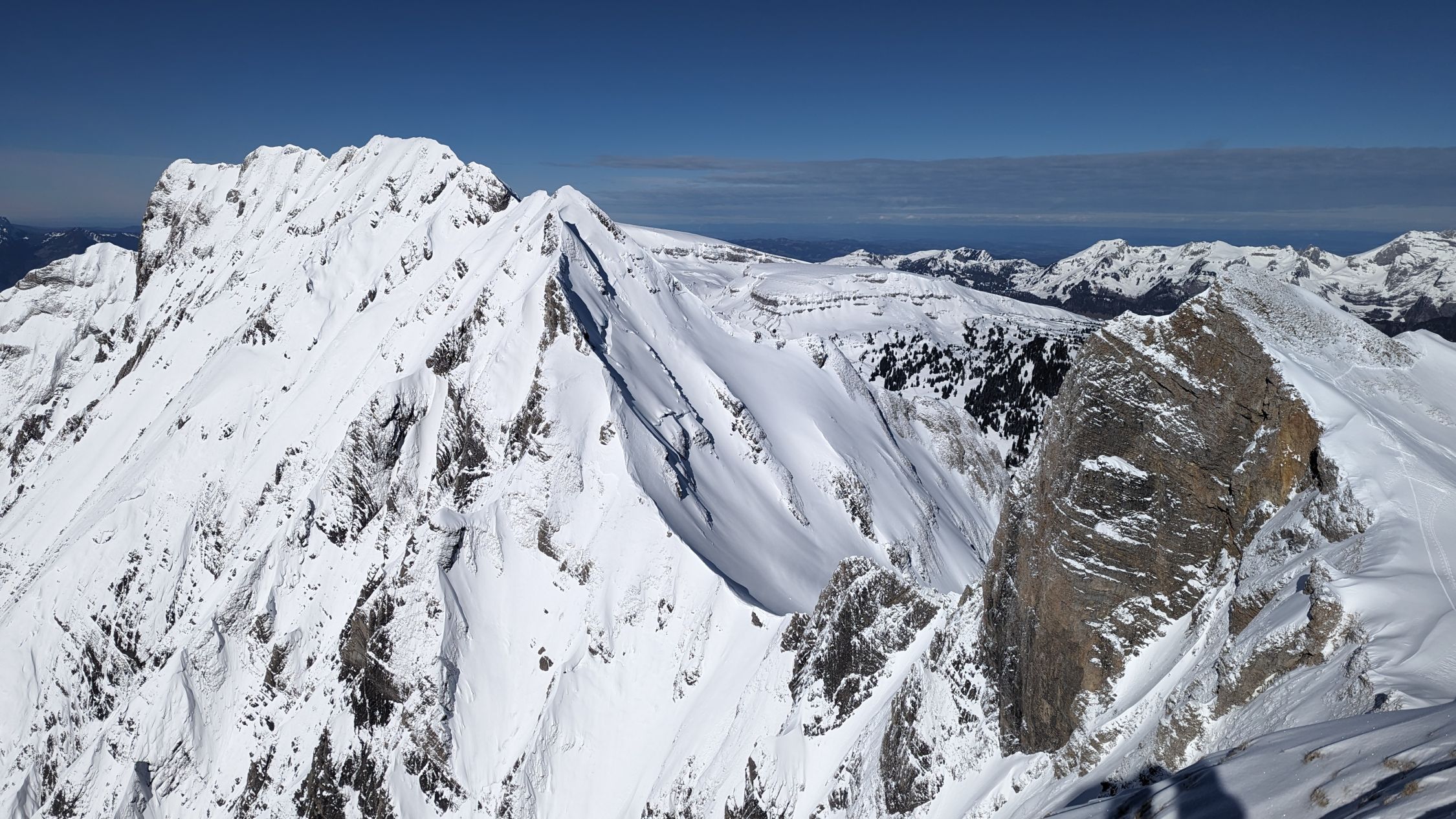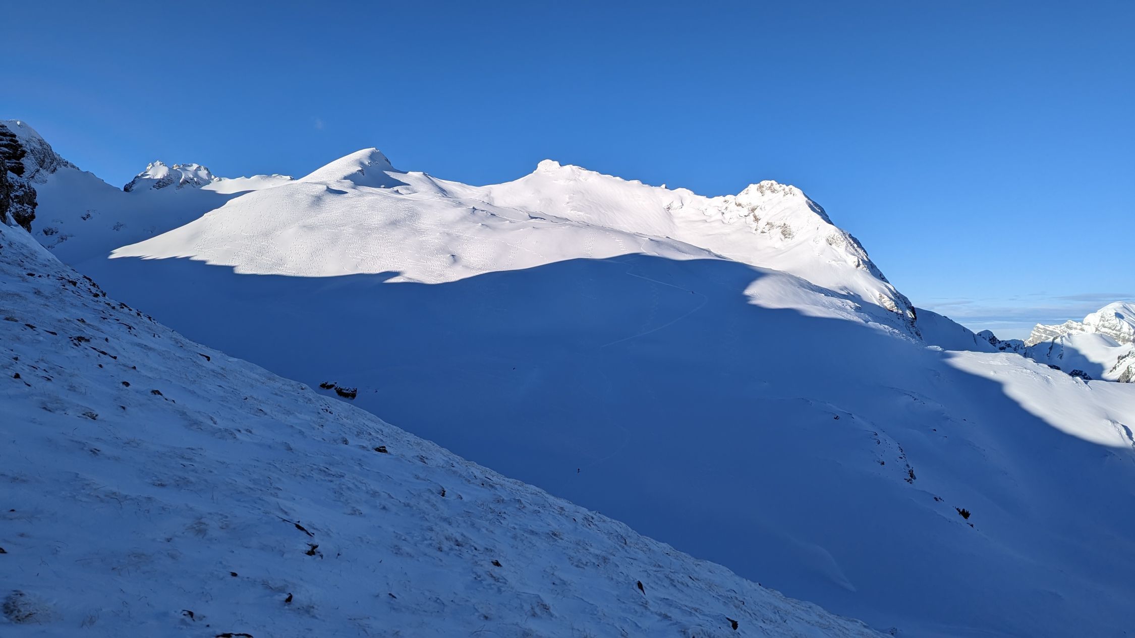 Habe noch versucht das Sichli zu besteigen, nachdem jemand freundlicherweise rüber gespurt hat. War recht aper am Gipfelaufbau, der Untergrund aus Schneeauflage, Eis, gefrorenem Boden und mühsamem Stufenschlagen ließen mich ohne Steigeisen scheitern.