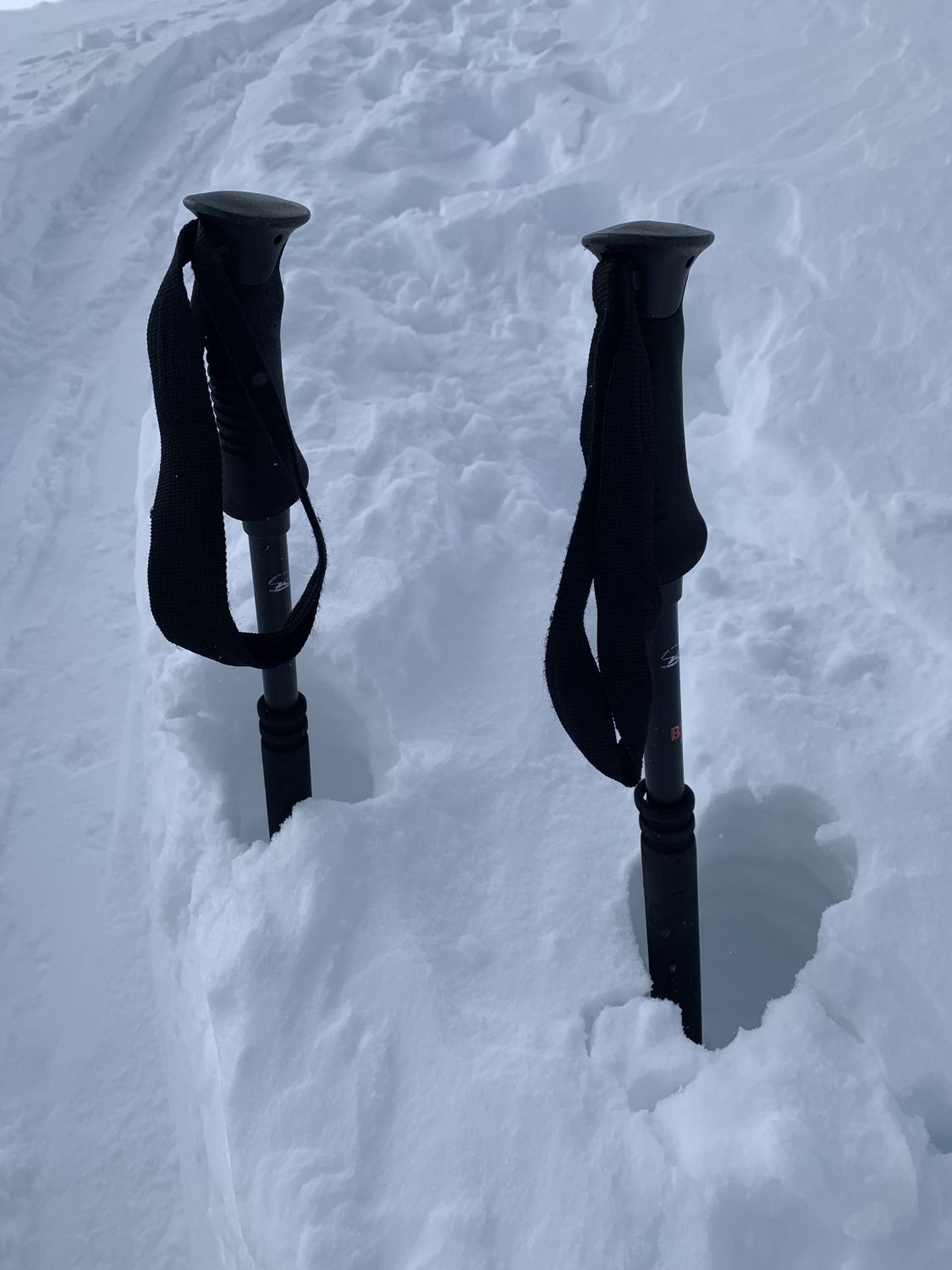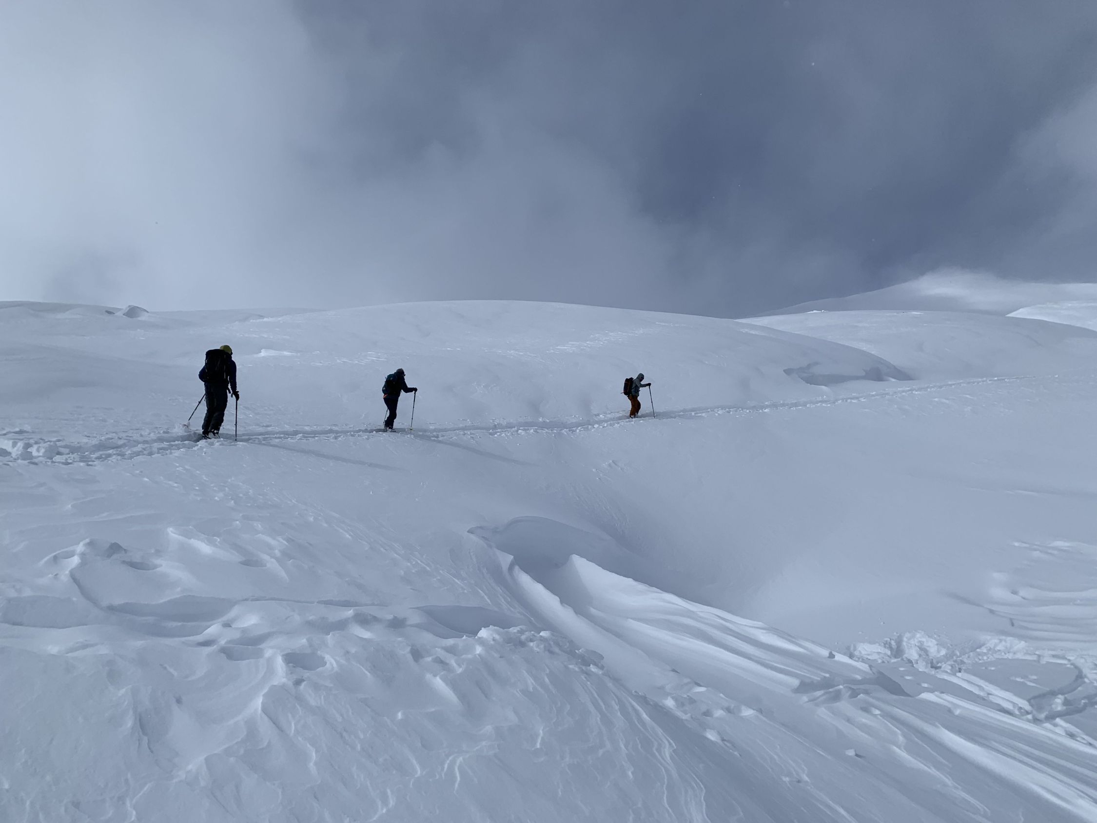 Sicht zum Glück immer recht gut trotz Wolkenfetzen der Südstaulage. Aber vor allem oben starker Wind, weshalb wir nicht ganz rauf sind. Steile Hänge mit dem vielen Schnee und Wind geladen,