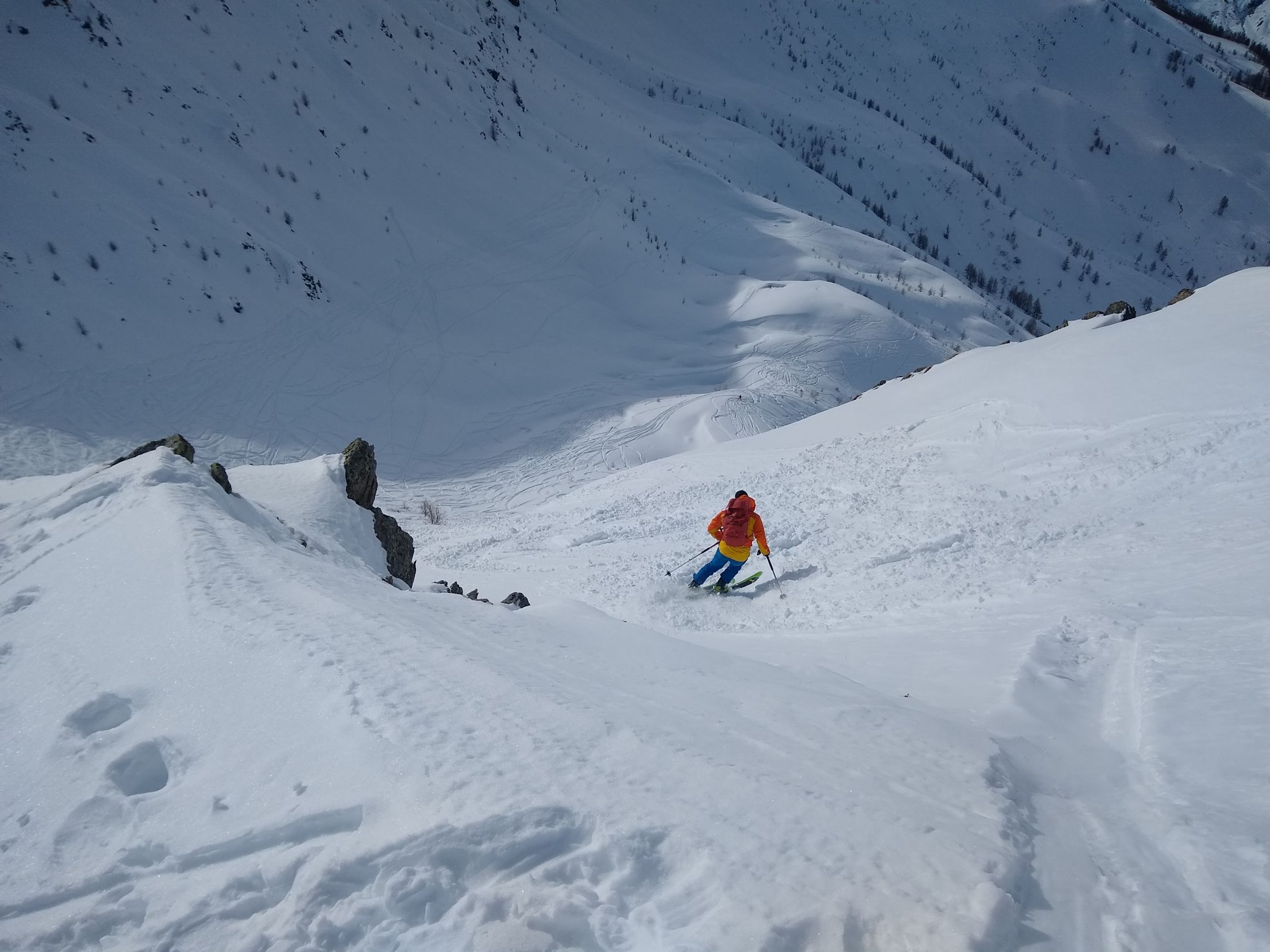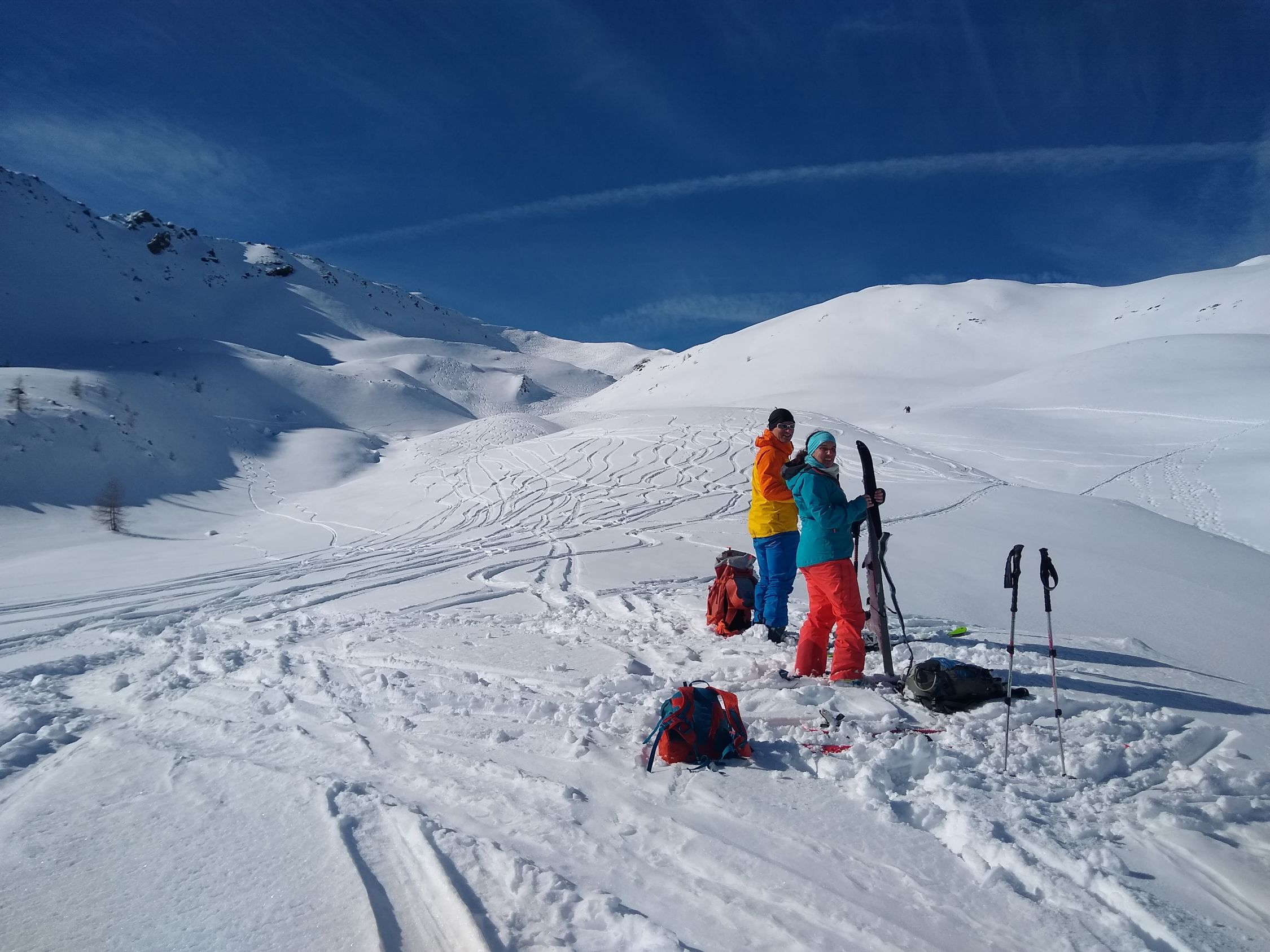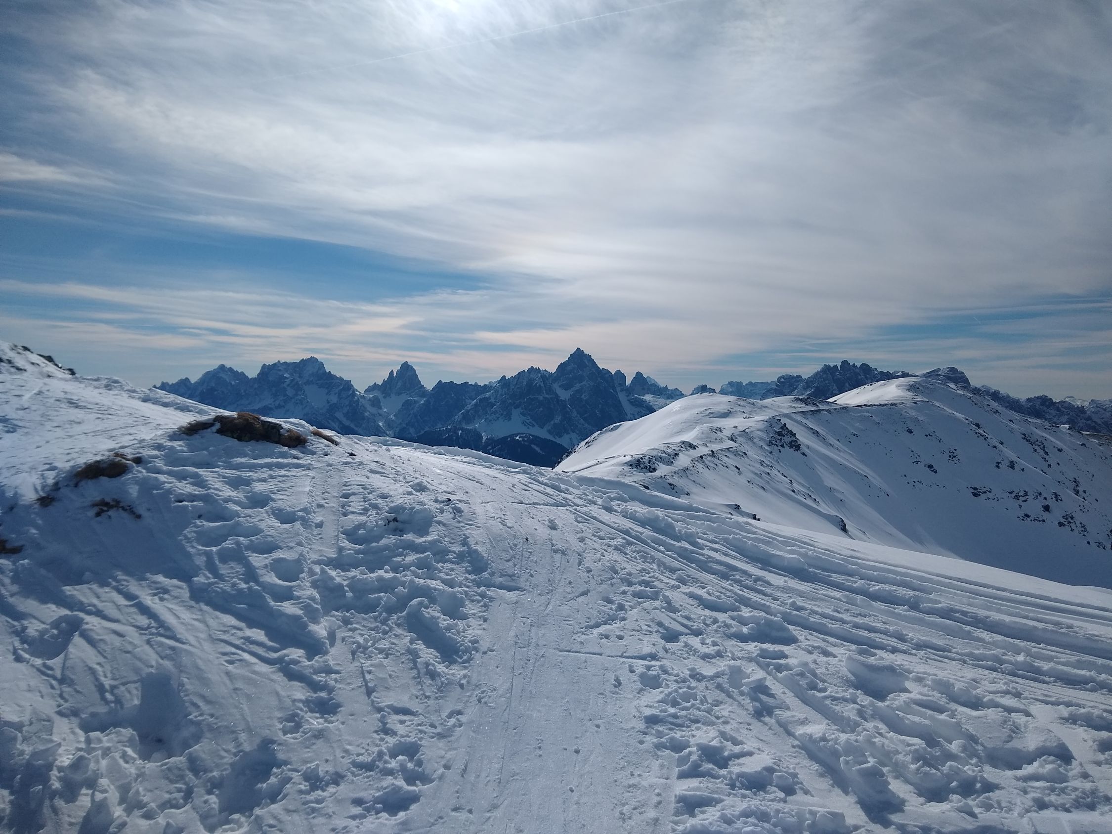 Bei der Abfahrt Richtung Oberhoferalm noch schöner Pulver in den Schattenhängen. Aufstieg zur südseitig Scharte und noch ca. 100hm Richtung Gannekofel dann Abfahrt wie Aufstieg zurück zum Marchenbach und nach Kalkstein. Dort zerfahren und unten schon sehr schwer. Im unteren Bereich gerade noch ausreichend