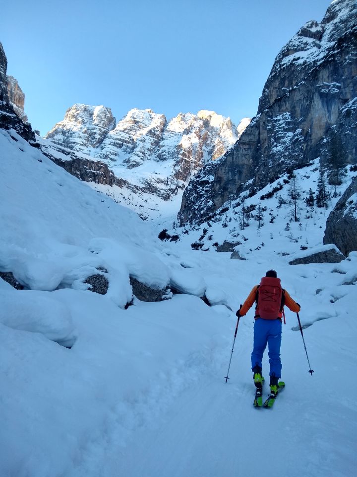 Im unteren Bereich recht wenig Schnee, Durchschlupf im Aufstieg ohne Steigeisen machbar- Abstieg mit Steigeisen. Im oberen Bereich schöner Pulver . Wir sind noch Richtung Cristallino Scharte hoch um diese Pulverhänge noch mit zunehmen