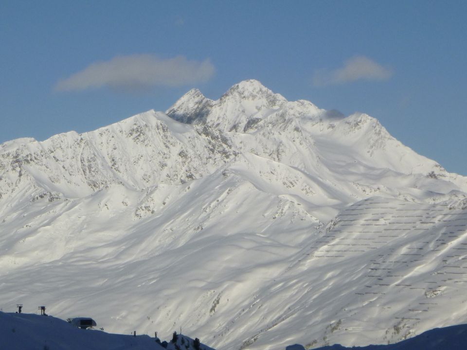Vom Berg hat man Aussicht zum Skigebiet Ischgl, wo sich die Versulspitze abhebt. Weiter im Osten erblickt man die Verwallgruppe.