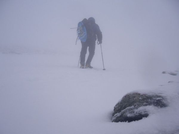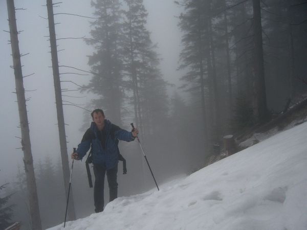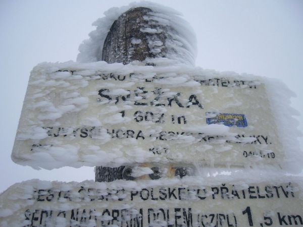 Als um 5 Uhr der Wecker klingelte prasselte der Regen aufs Dach. Zum Glück liess er bald nach und so lief ich um 6 los. Gleich beim unteren Dorfende beginnt der bestens beschilderte und gut ausgebaute Wanderweg. Er führt etwa 400 Höhenmeter durch dichten Wald zur Bergbaude (Pension+Restaurant) Ruzohorky hoch. Ab 1000m lag eine geschlossene Schneedecke und der Weg war vereist, aber es ging auch etwas mühsam ohne Steigeisen. Weitere 100m weiter oben hatte es dann schon über 1m gut verfestigter Schnee und ich erreichte so problemlos die Bouda Ruzohorky (1280m). Nun ging es fast eben durch eine alleeartige Strecke zur geschlossenen Mittelstation der Snezka-Sesselbahn Ruzova hora (1354m). Nach der Mittelstation ging es zunächst noch fast eben weiter, jedoch nahm der Schnee zu und die frisch verschneiten Bäume wurden immer kleiner und verkrüppelter. Auch verdichtete sich der Nebel und es begann wieder an zu schneien. Zum Glück markieren hier hohe Holzstangen den Weg und leiteten mich zum P.1389m mit einem luftigen roten Wegweiser. Hier beginnt der steile Gipfelaufstieg wo an dem Wind ausgsetzten Stellen eine Treppe zum Vorschein kam, zuletzt irrte ich bei stürmischem Wind im völligen "White-Out" direkt nach oben wo plötzlich die Gebäude auf dem Gipfel auftauchten. Der höchste Punkt war schnell gefunden, danach ärmte ich mich in der bewarteten polnischen Hütte (Restauracja i obserwatorium na Sniezce), im Volksmund UFO genannt, bei einem Kaffe und einem Bier auf. Nach einer halben Stunde Rast in der polnischen Hütte begann ich mit dem Abstieg. Da das Wetter nun noch schlechter geworden war, beeilte ich mich und war nach insgesammt 5½ Stunden wieder im Hotel.