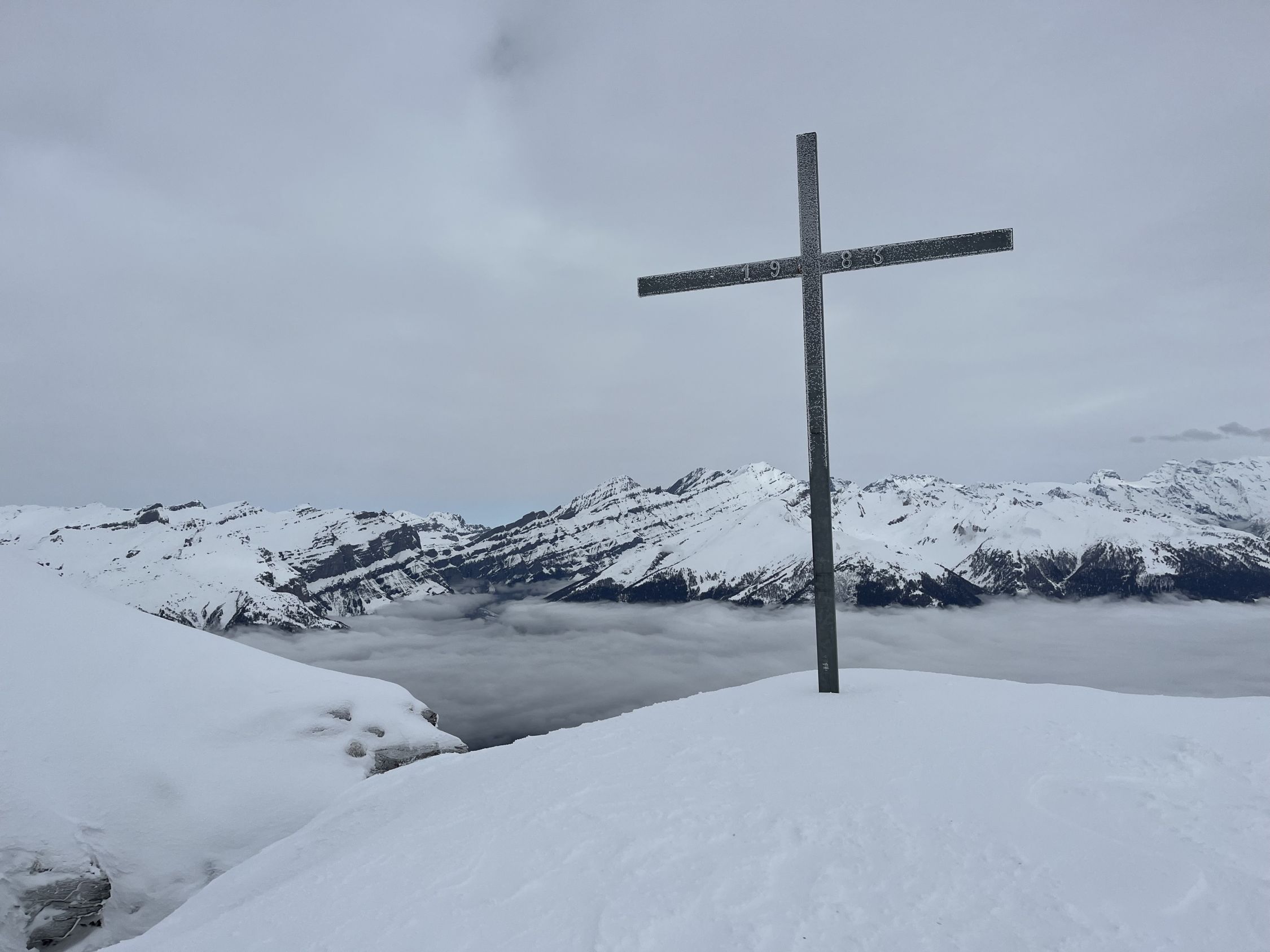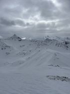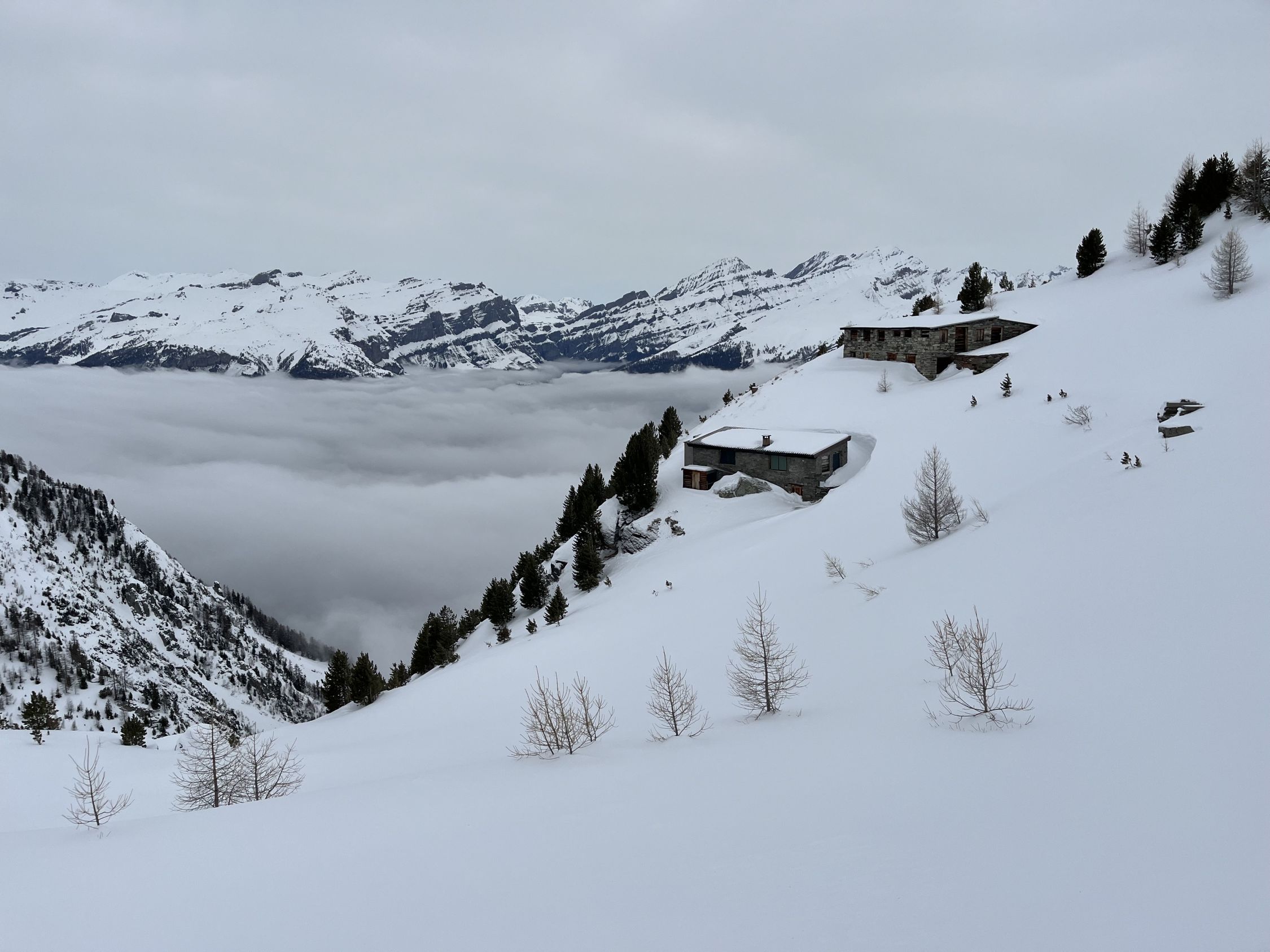 Nebelschicht auf ca 1500/1700 m, darüber bewölkt (ab Mittag zunehmend Aufhellungen). Schnee ab ca. 1400 m (Expo N), Pulverschnee auf meist tragender Unterlage, aber bereits recht schwer. Andere Expositionen werden wohl bald einen Deckel haben.