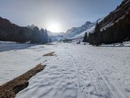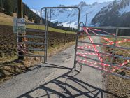 Tragepassage ab vorderer Fildrich bis zum Pkt. 1'391m. Ab dort hat's Schnee, wobei apere Stellen bis zirka 1'600m zwischendurch vorkommen. Die Strasse ab Fildrich ist übrigens durch eine "Barriere" abgesperrt (Fahrverbot, siehe Foto).