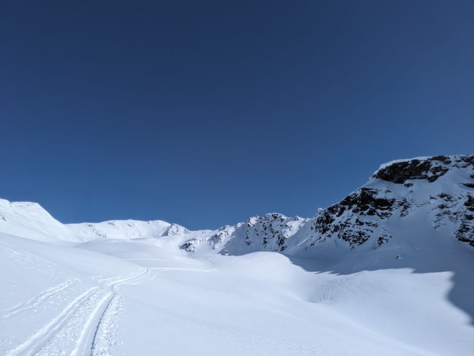 Gut fahrbar. Windgedrückter Pulver, manchmal mit einem Deckel. Ganz oben am kleinen Grat bis zum Gipfel ist es hart, aber nicht eisig. Unten an einigen Stellen sulzig.