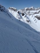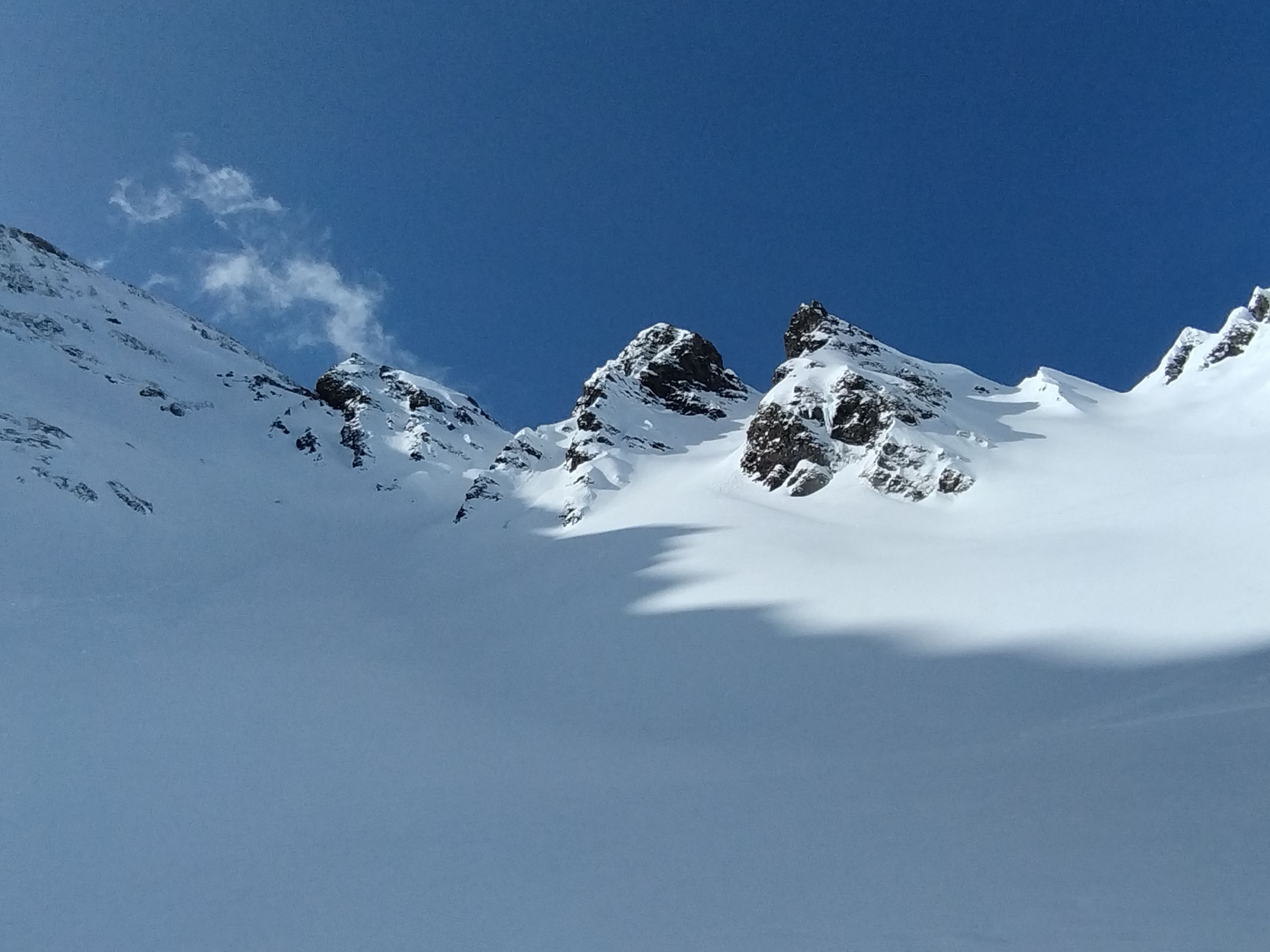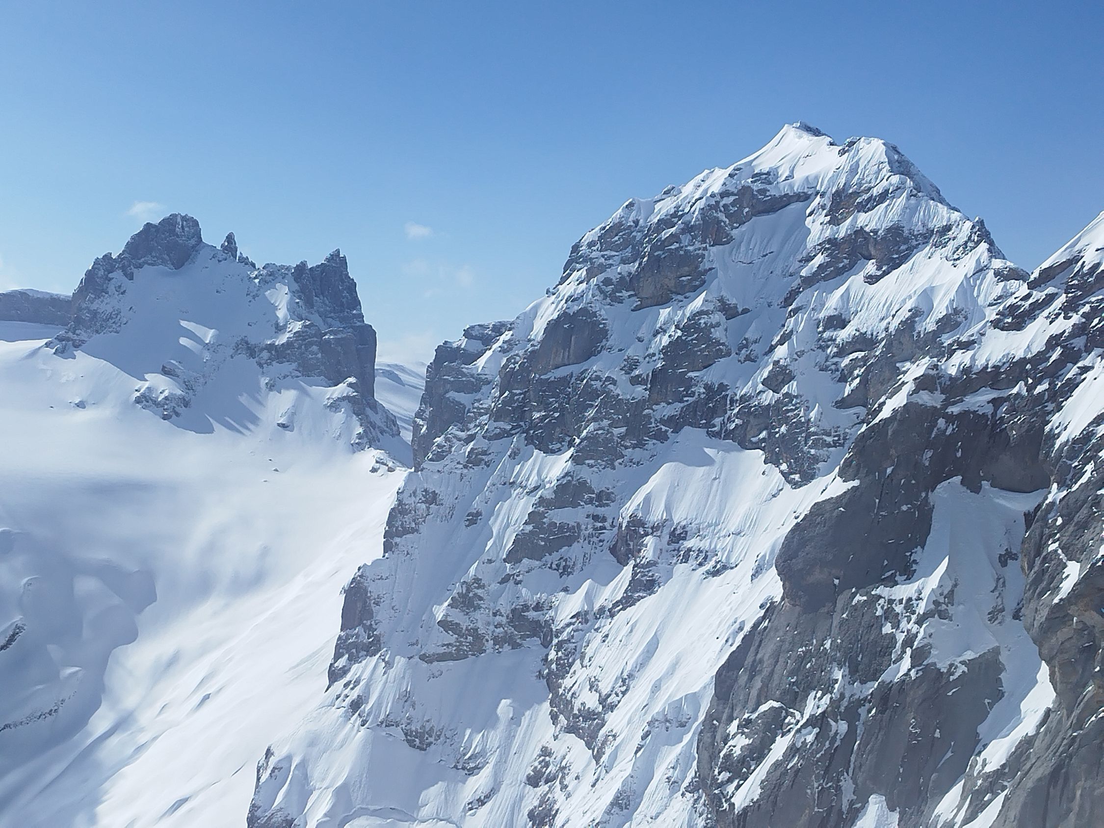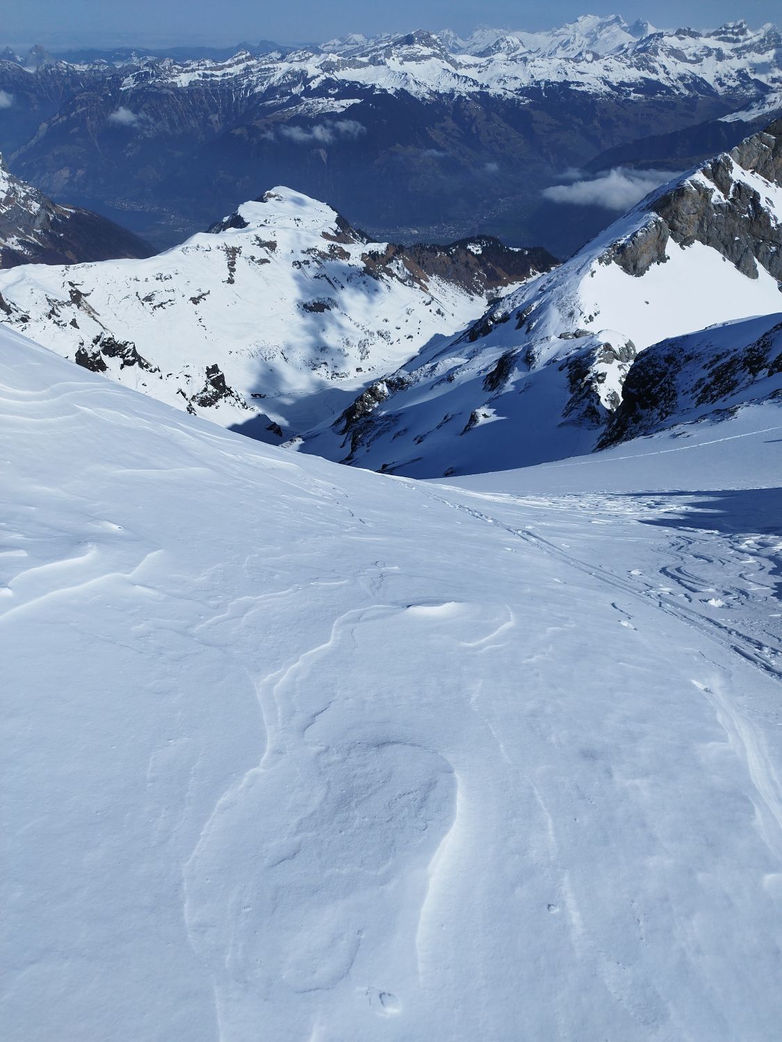 Vorab die Überschreitung habe ich nicht gemacht. In den "Nordwänden" (für mich gibt es keine Wände nur Flanken aber hat sich im alpinen Sprachgebrauch etabliert) von Hinter Schloss und Vorder Schloss fehlt definitiv der Schnee. Ziemlich abgeblasen die ganzen steilen Nordflanken wo der Wind sehr oft über den Surenenpass bläst. Von Brüsti nach Waldnacht fehlte auch der Schnee, so dass ich dort das aller erstemal zu Fuss den Waldweg runterlaufen musste. Es schien zwar den ganzen Tag die Sonne aber es windete auch ziemlich arg und somit bin ich ohne Pause aufgestiegen. Zur Überraschung es war windstill auf dem Gipfel. Es war eine einsame Tour und Spuren hat es überhaupt gar keine gehabt. Meine einzigen Bedenken waren Triebschneeansammlungen auf dieser Tour in den oberen sehr steilen Bereichen/Kuppen. Aber letztendlich war alles entspannend. Ab Pkt 2775m war Skidepot. Der Punkt 2872m war sehr gut in der steilen Südflanke mit tollen Tiefblicken zu umgehen. Mit dem Einsatz des Pickels ist man auch wieder auf den Grat gekommen. Dort war es kurzeitig über 60 Grad steil und ich musste mich dort regelrecht auf den Grat hochwühlen. Bis zum Gipfel zieht es sich dann noch ziemlich am Grat entlang. Am besten immer einen gebührenden Abstand zu den Monsterwechten halten. Ich brauchte hin und zurück über 1 1/2Std. Tolle Tour wenn man die Überschreitung machen kann ohne nochmals den Rückweg zum Skidepot machen zu müssen. Der Rückweg war durch die jetzt vorhandenen Spuren einiges angenehmer. Press Powder zu Anfangs in der Abfahrt machte die Schwünge nicht locker flockig aber dennoch im geniessbaren Bereich. Ab Guggitaler Schnee harter Schnee der pistenähnliches Abfahren ermöglichte. Und zu guter letzt der ungewohnte Aufstieg zu Fuss zur Seilbahnstation Brüsti.