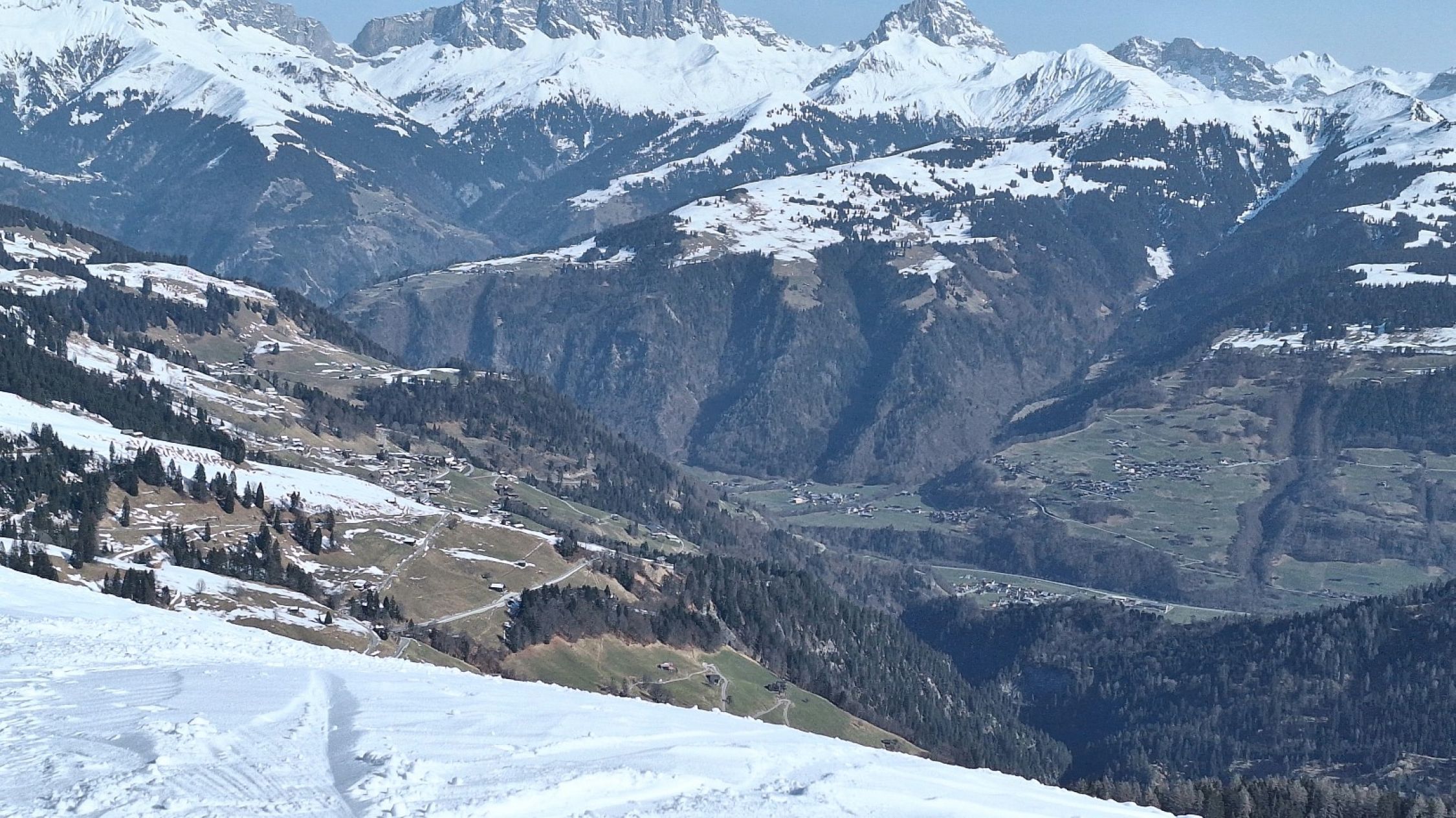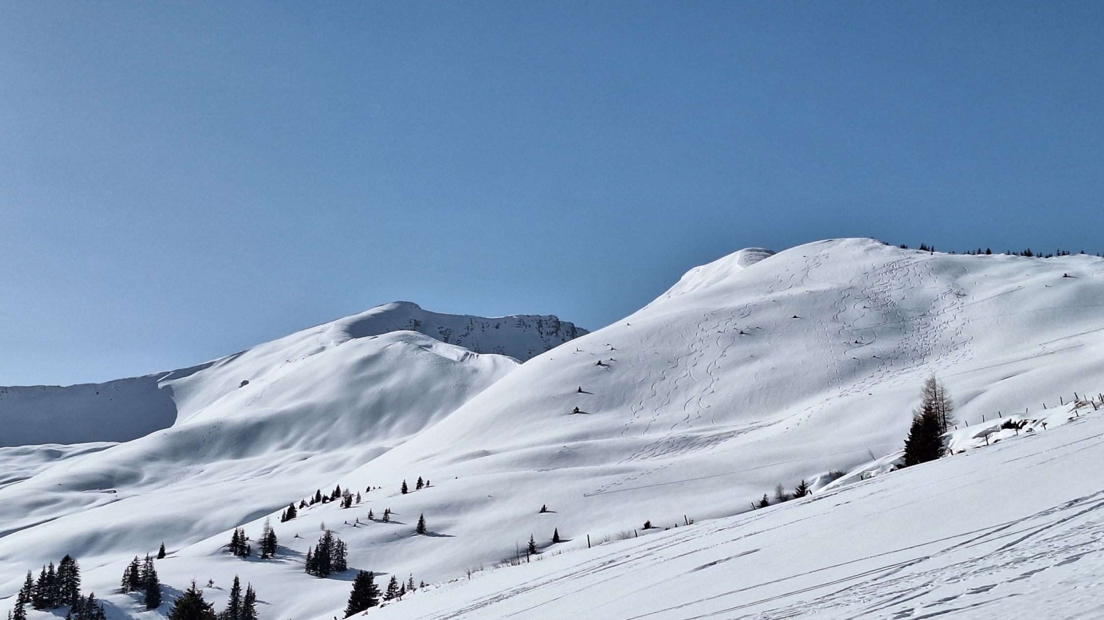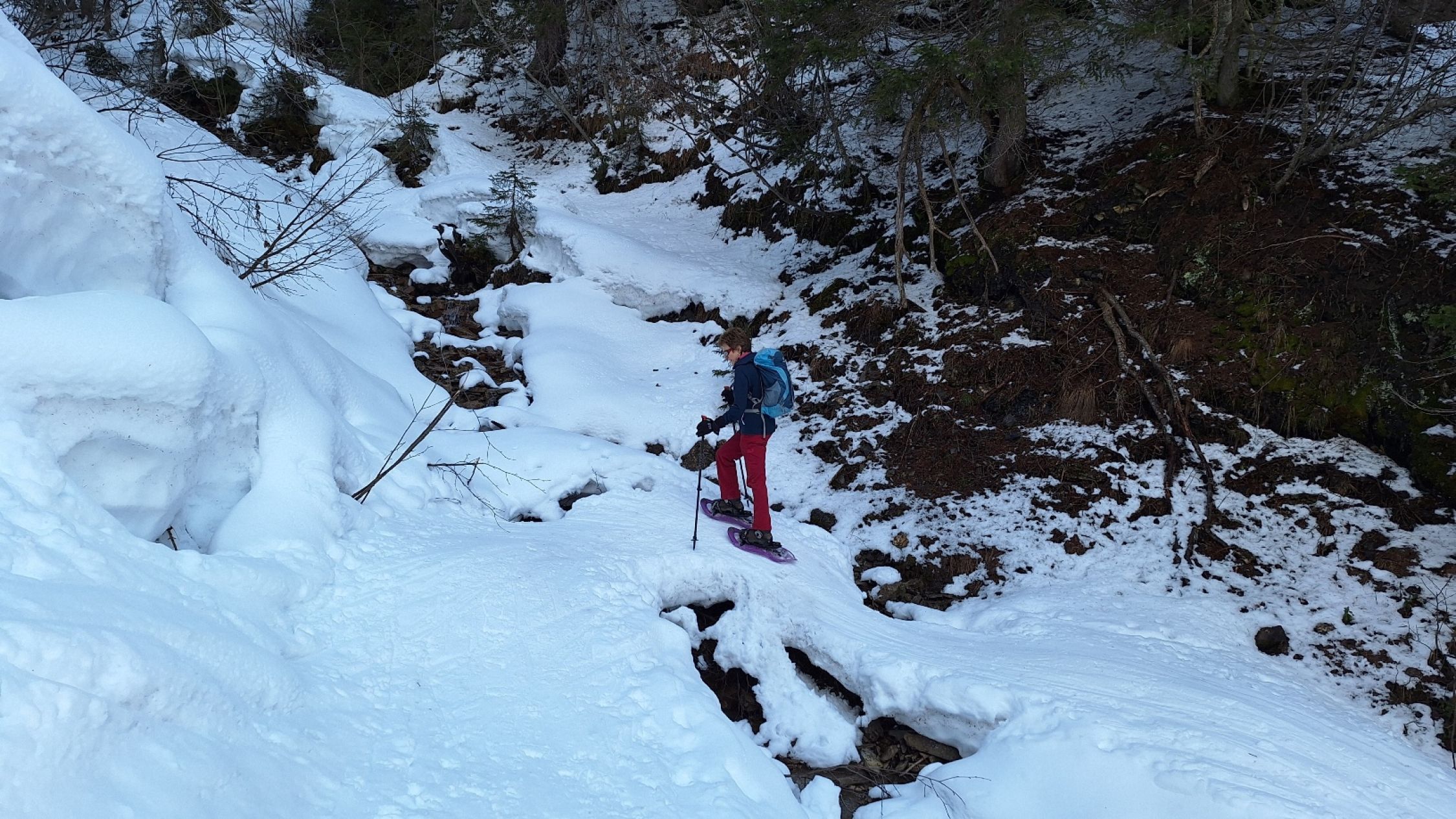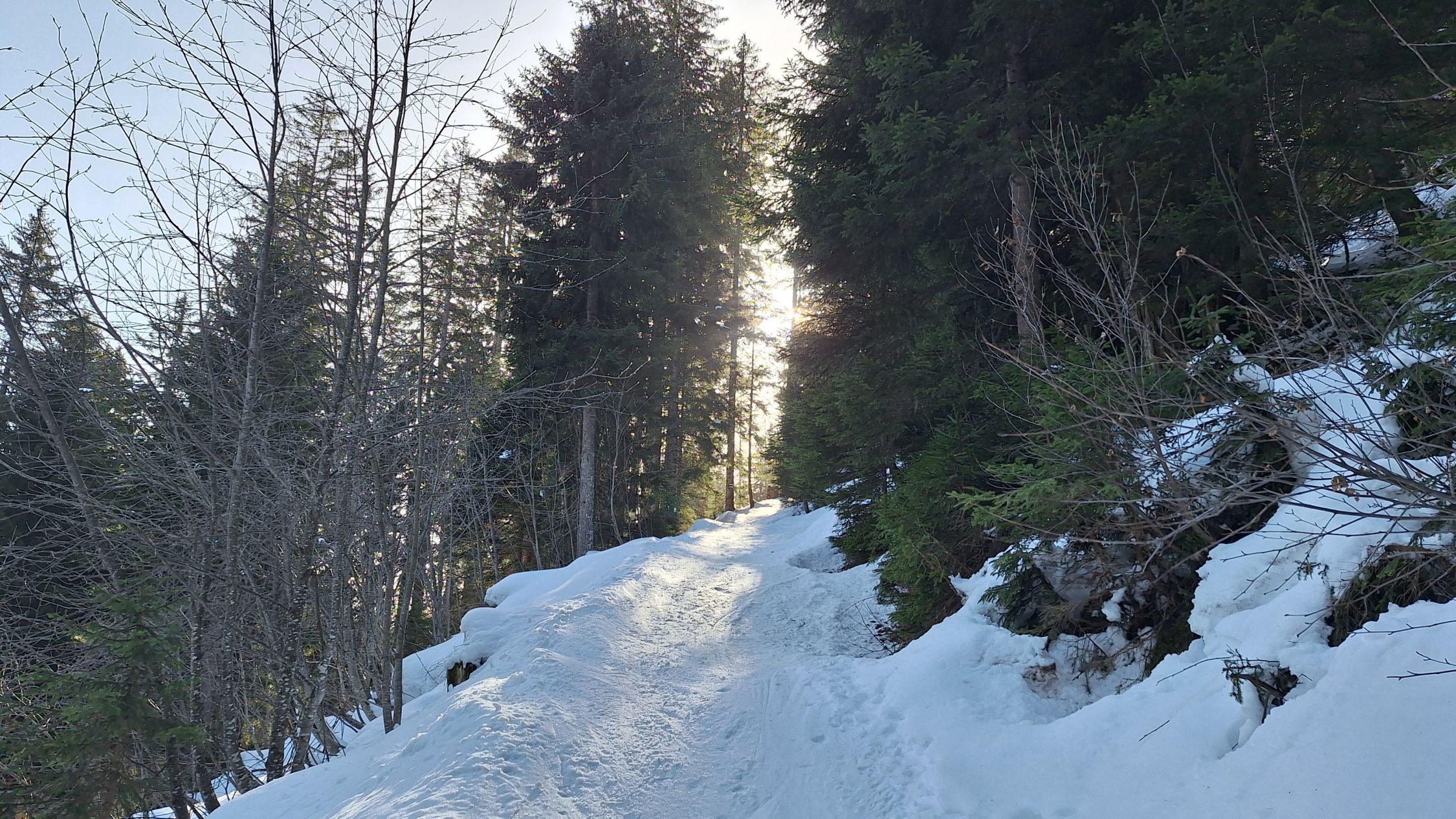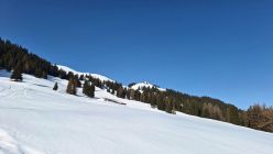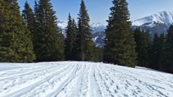 Die Route war erwartungsgemäß gut gespurt. "Im grüenen Wald" im unteren Teil ein paar Stellen unter Bäumen, wo wenig Schnee lag. Ansonsten sehr gute Schneelage im Gebiet mit Nord- oder Ostexposition.