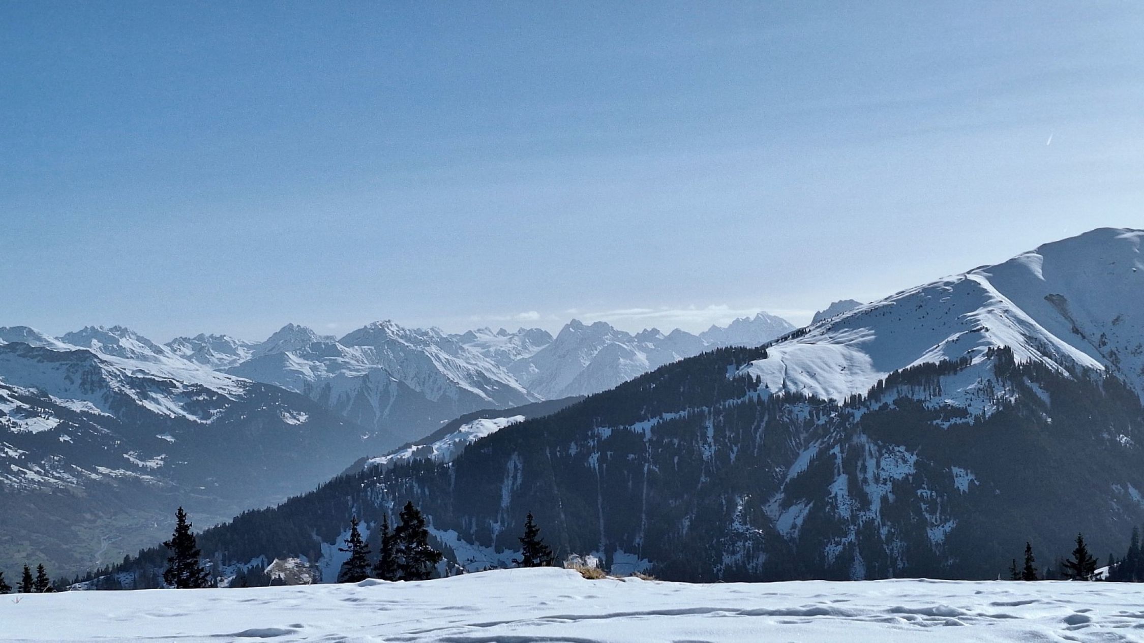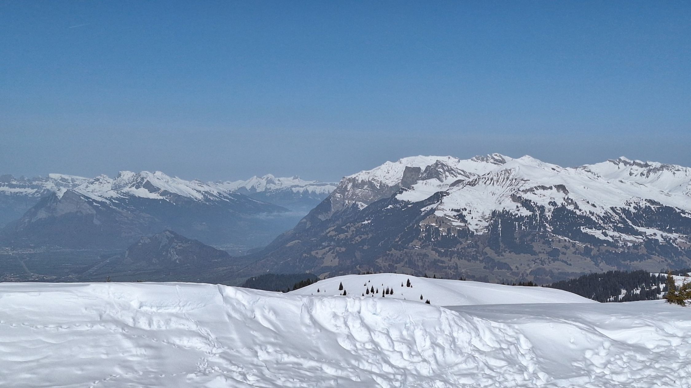 Frühlingshafte Verhältnisse mit Temperaturen im Plusbereich schon am Morgen. Wolkenlos, aber diesig (Saharastaub?). Am Gipfel Südwind.