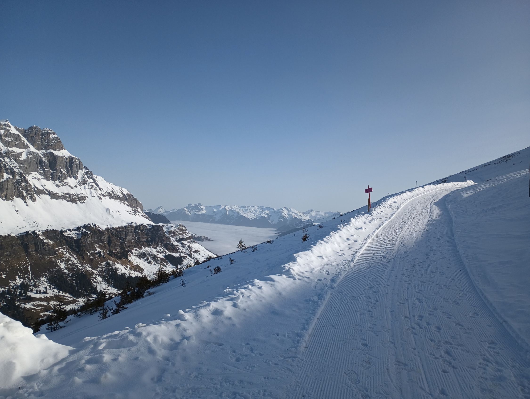 Sind von Bergstation auf 1970 m gestartet, und auch wieder mit der Bahn runter, da uns die Tour Energie gekostet hat. Man hätte bis Urnerboden runterfahren können. Drei grosse Gruppen mit Führer und je 8 Leuten gleichzeitig unterwegs. Sie fuhren runter.
