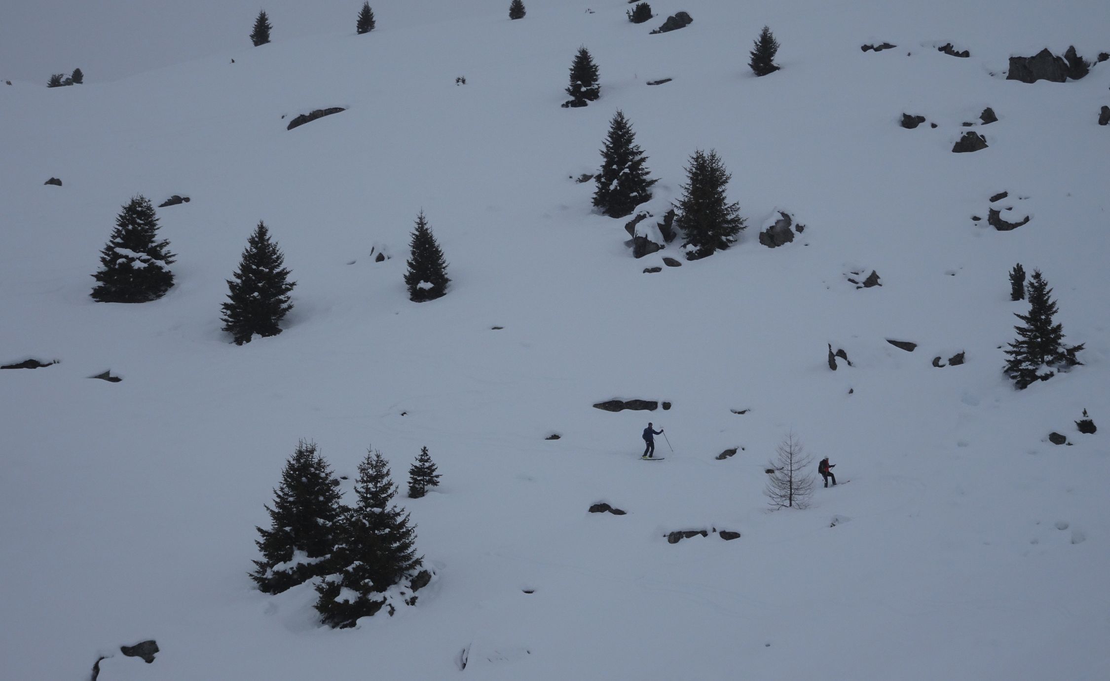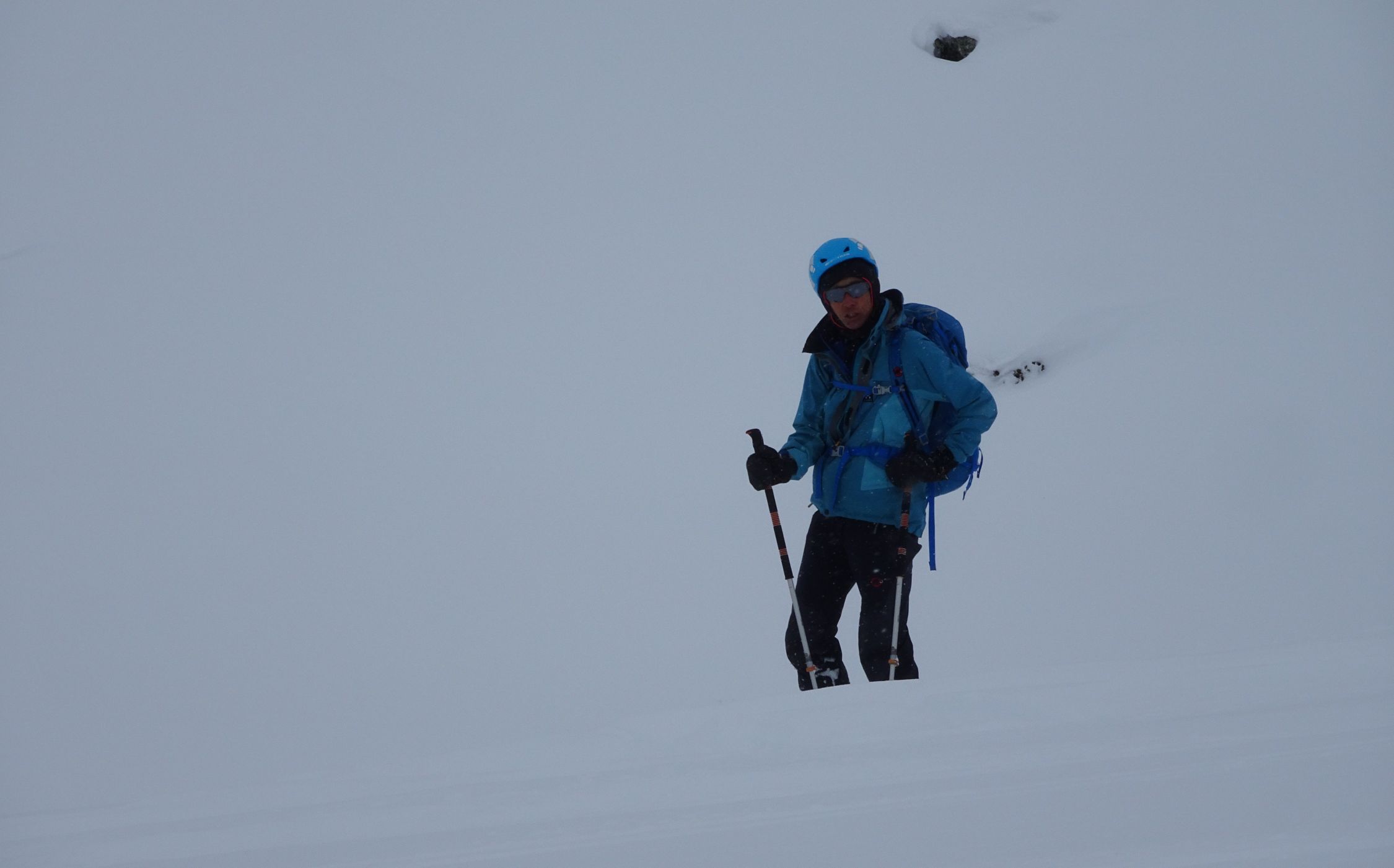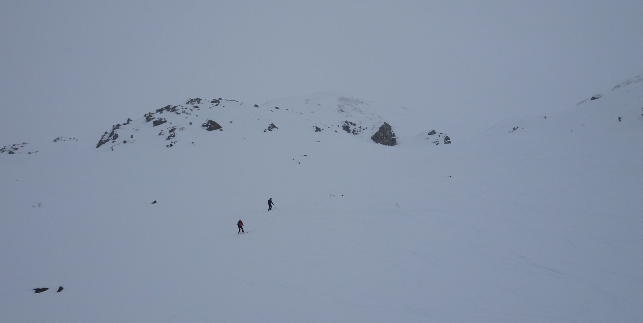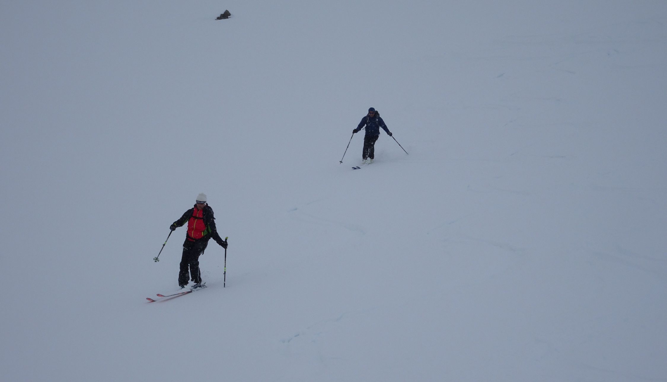 Die Witterungs- und Sichtverhältnisse waren im Aufstieg wie bei der Abfahrt schwierig. Glücklicherweise war im Aufstieg eine frische Spur vorhanden, was die Orientierung einfacher machte. Die Abfahrt war wie "blinde Kuh".