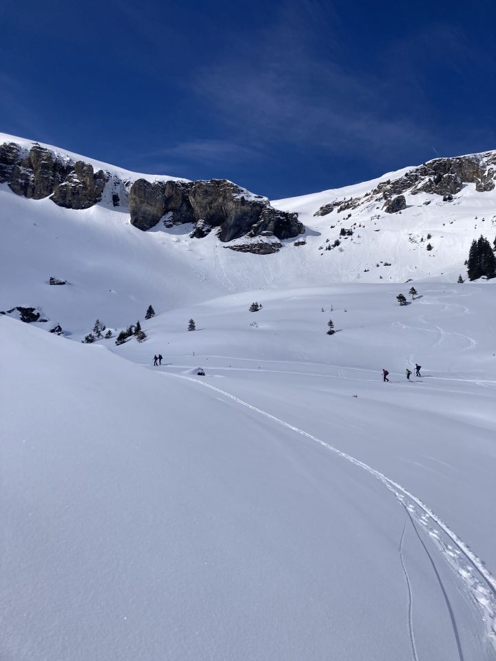 Start knapp unter P1430. Ab da durchgehende Schneedecke. Passage kurz vor Chamhüttli einige Oberflächenrutsche, aber keine Schwierigkeiten.