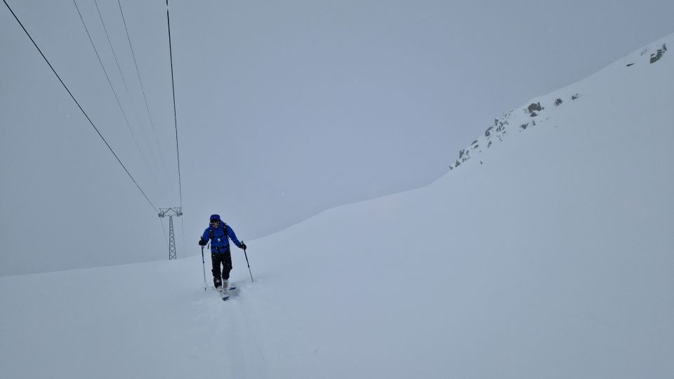Abfahrt oft in der Aufstiegsspur, da man im Tiefschnee gebremst wurde. In den steileren Hängen im unteren Teil waren Kurven mit viel Kraft möglich.