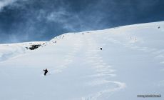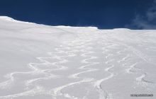 Abfahrt: Bis zur Tannalp einige schöne, kurze Pulverschneehänge gefunden. Dann erneuter Aufstieg auf Chringen, oben steile aber gut angelegte Spur, und Abfahrt auf der Piste bis nach Stöckalp hinunter. Piste hart, später schön sulzig, durchgehend Schnee bis zur Talstation.
