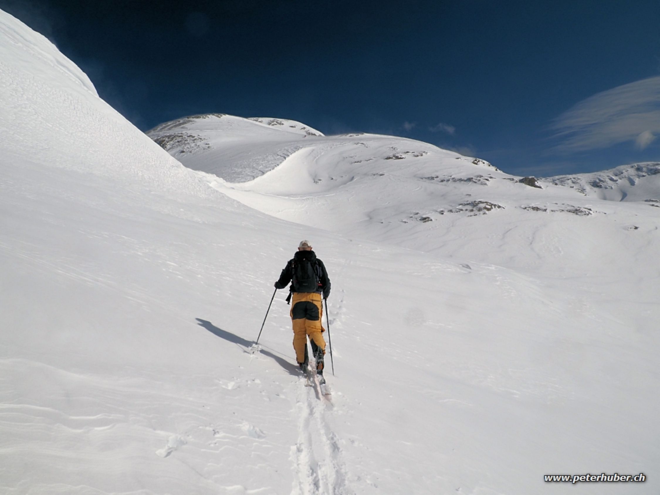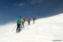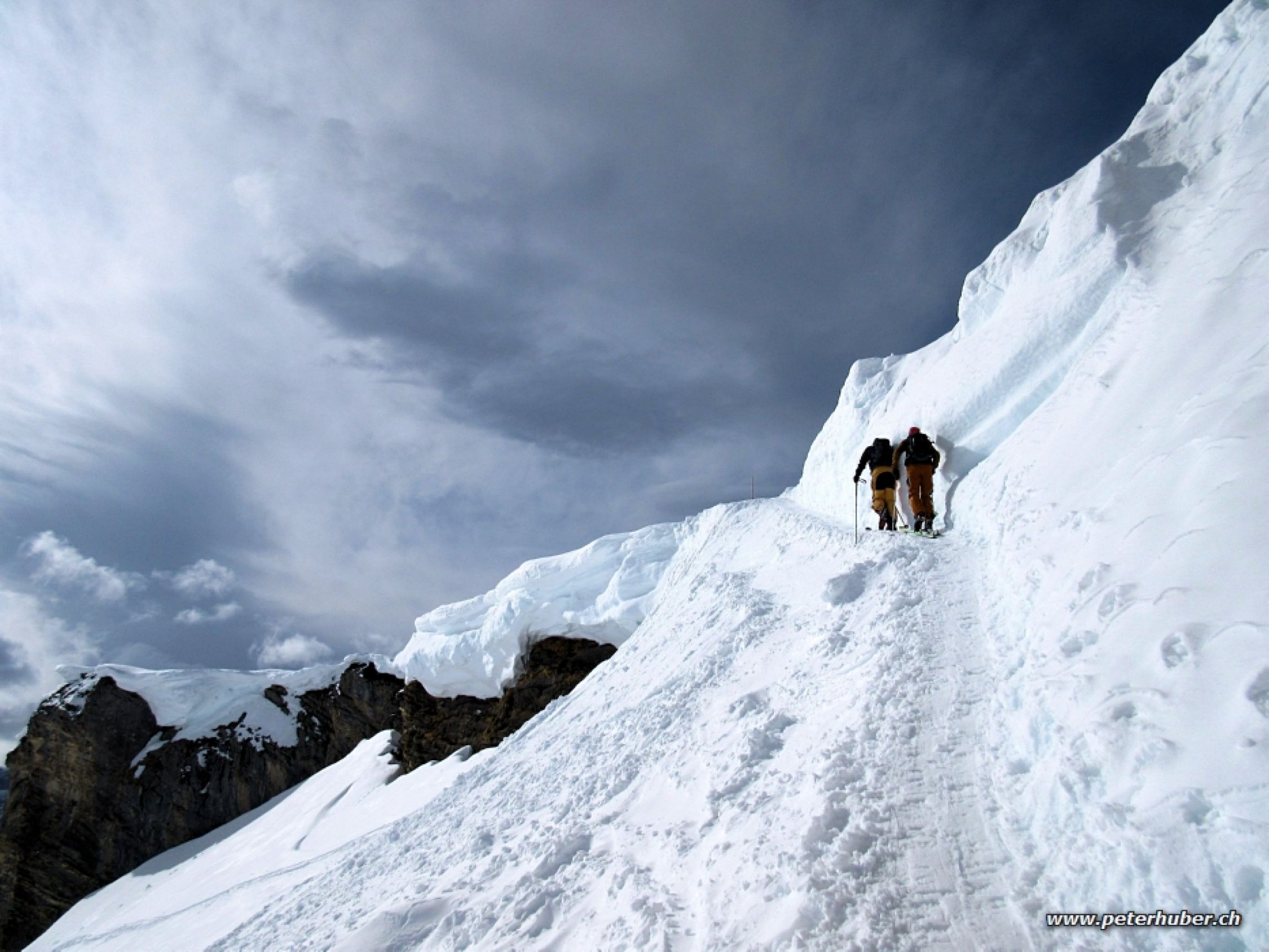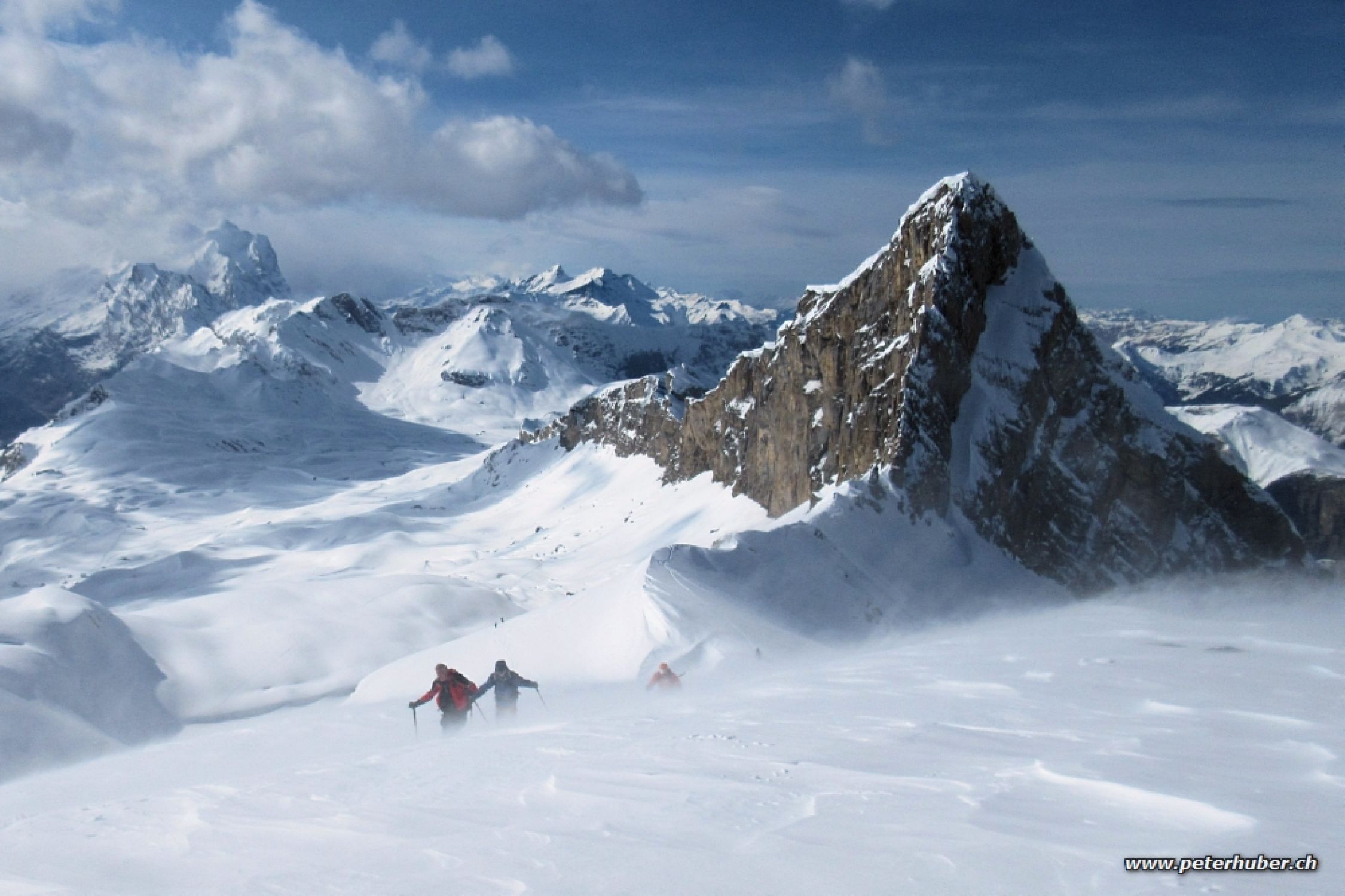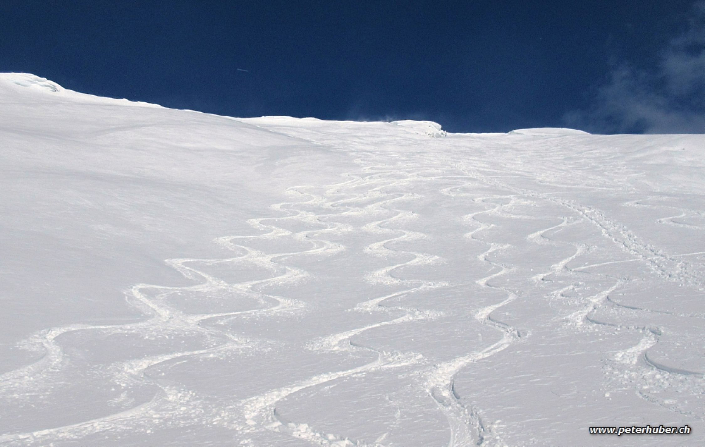 Meist sonnig. Von Süden drückten die Wolken bis zu den Wendenstöcken. Oben starker, eisiger Wind (Böen bis ca. 80 km/h). Ab Mittag mehr Wolken. Es hat ca. 10 cm Neuschnee gegeben, auf gut tragender Unterlage. Ab Mittag wurde der Schnee in den Sonnenhängen leicht feucht.