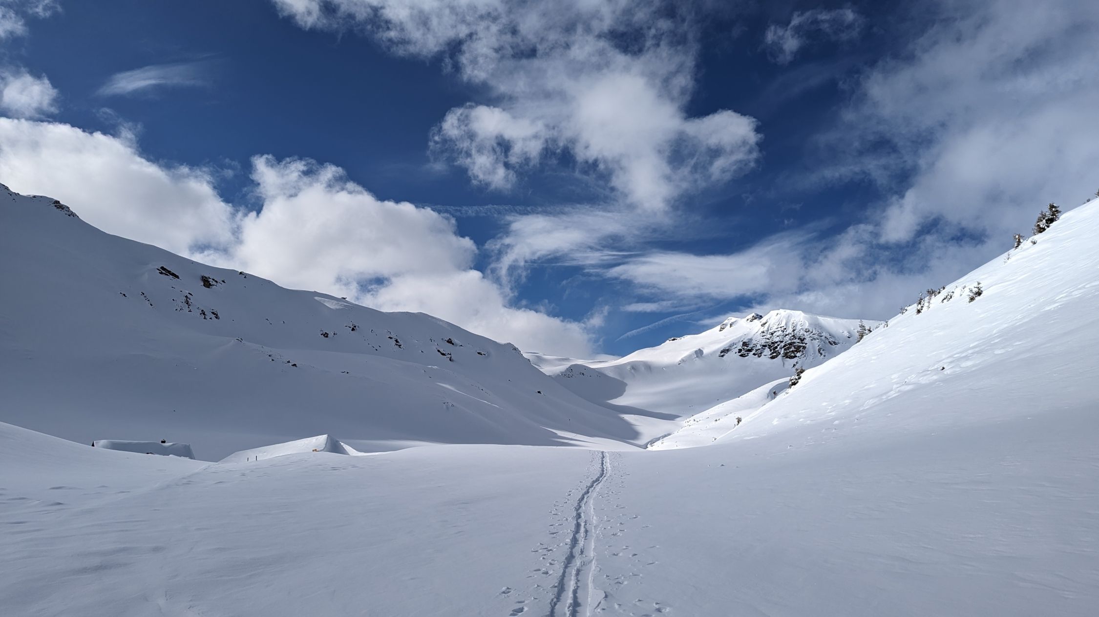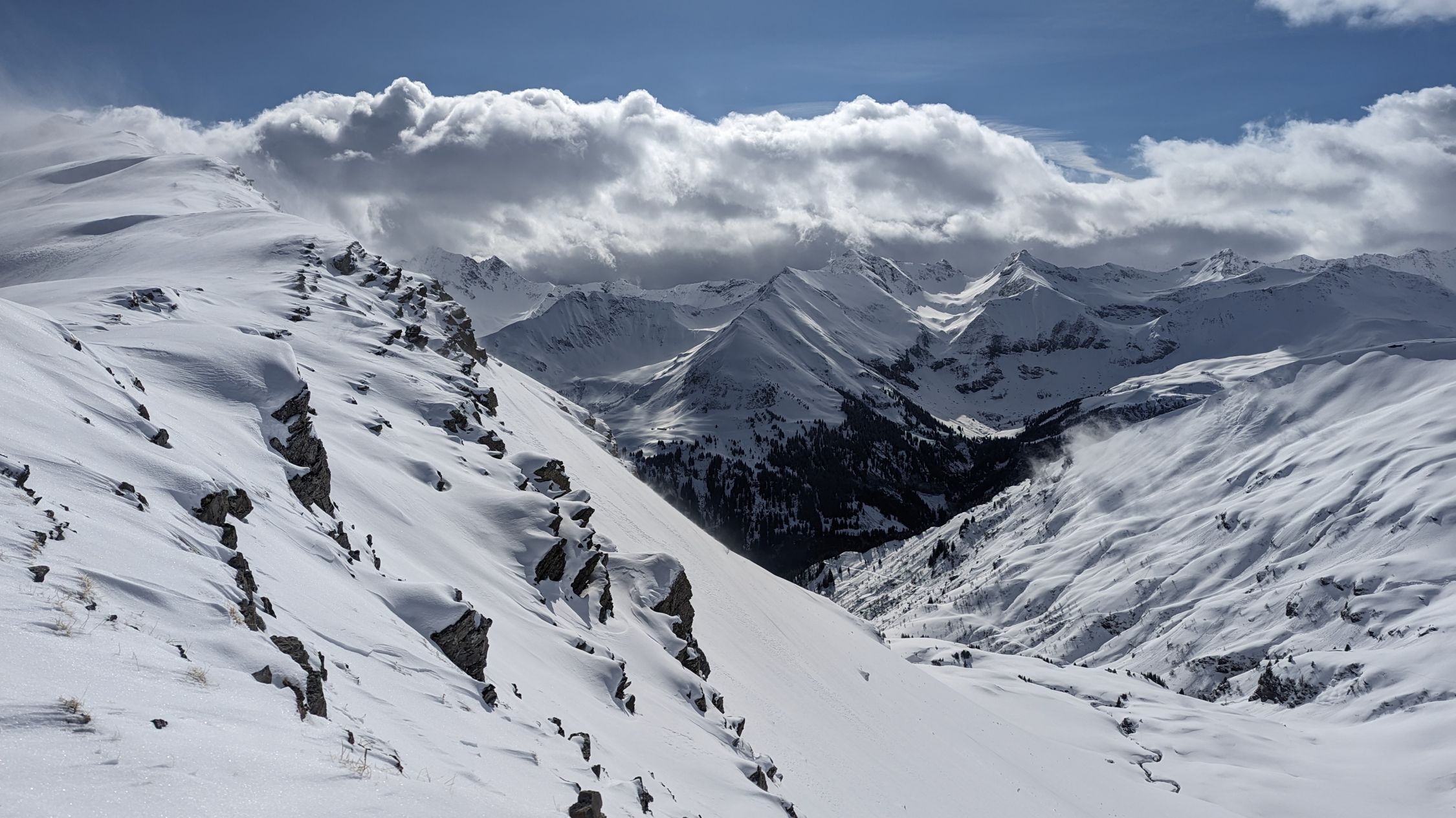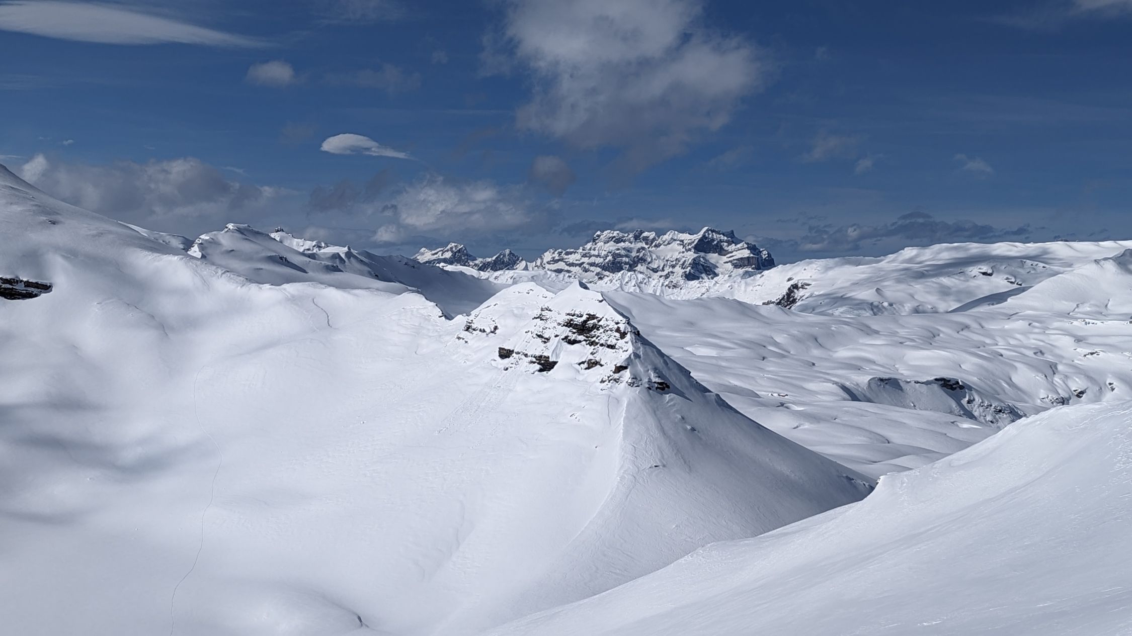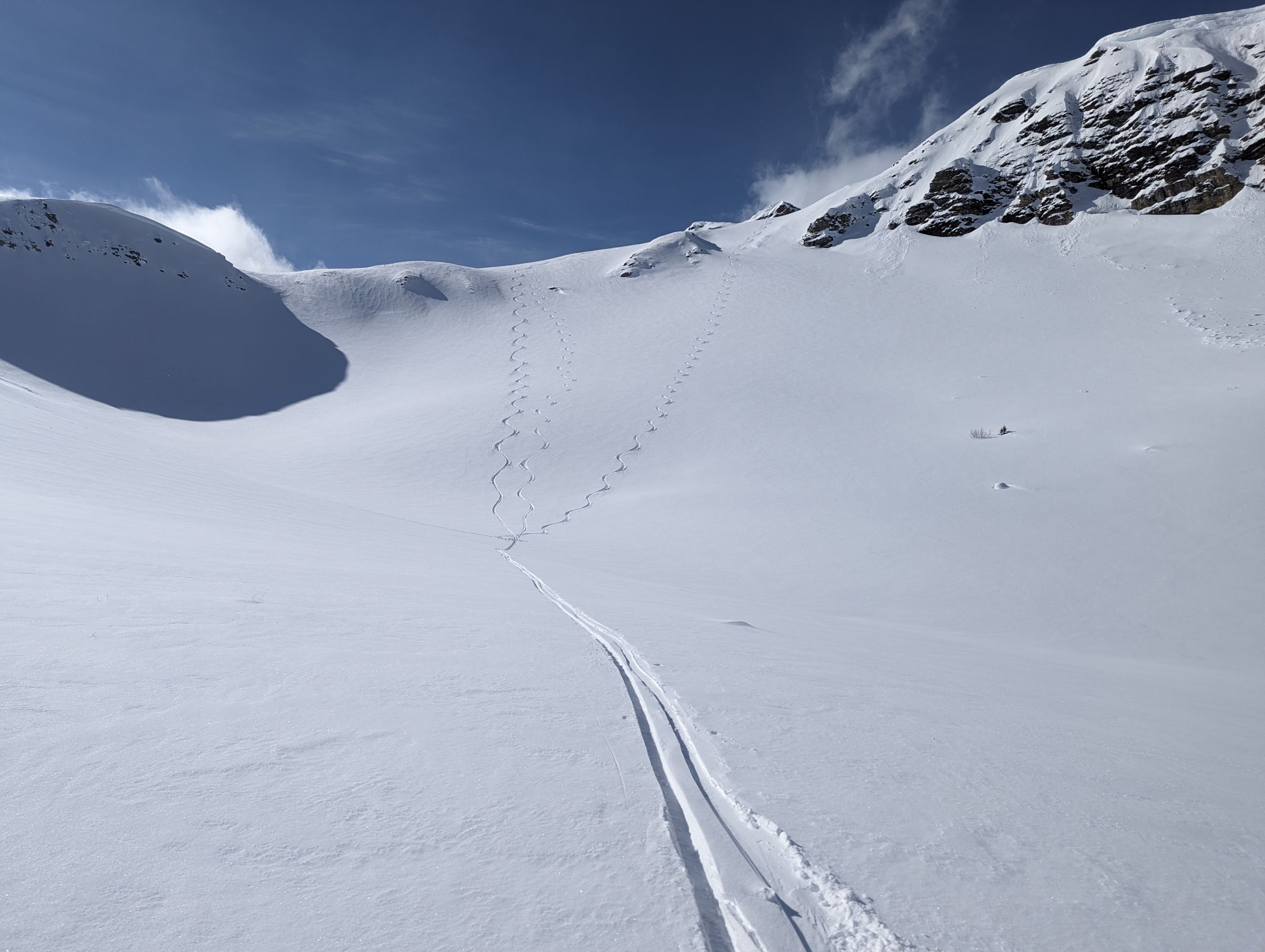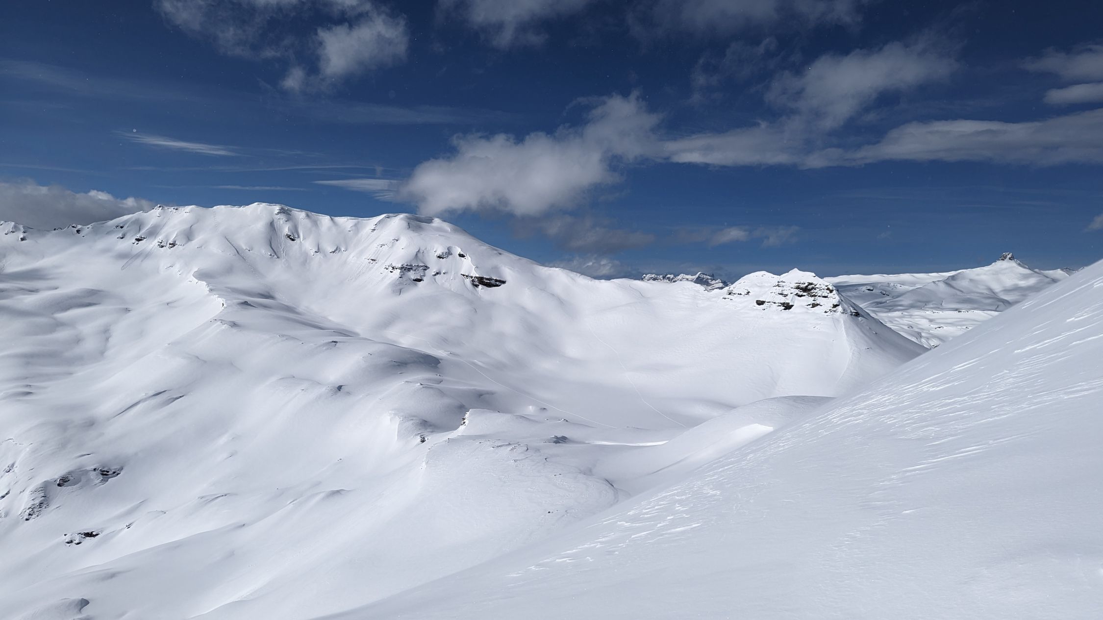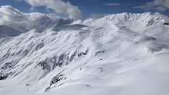 Anfahrt direkt vom Gipfel, Einfahrt kurz nach Norden hinab, ebenso Rot Stein, toller Pulver, leicht gepresst. Bis zum Mittelsäss wirklich schöne Abfahrt, dann wurde der Schnee nass und bremste trotz Spur ziemlich ab.