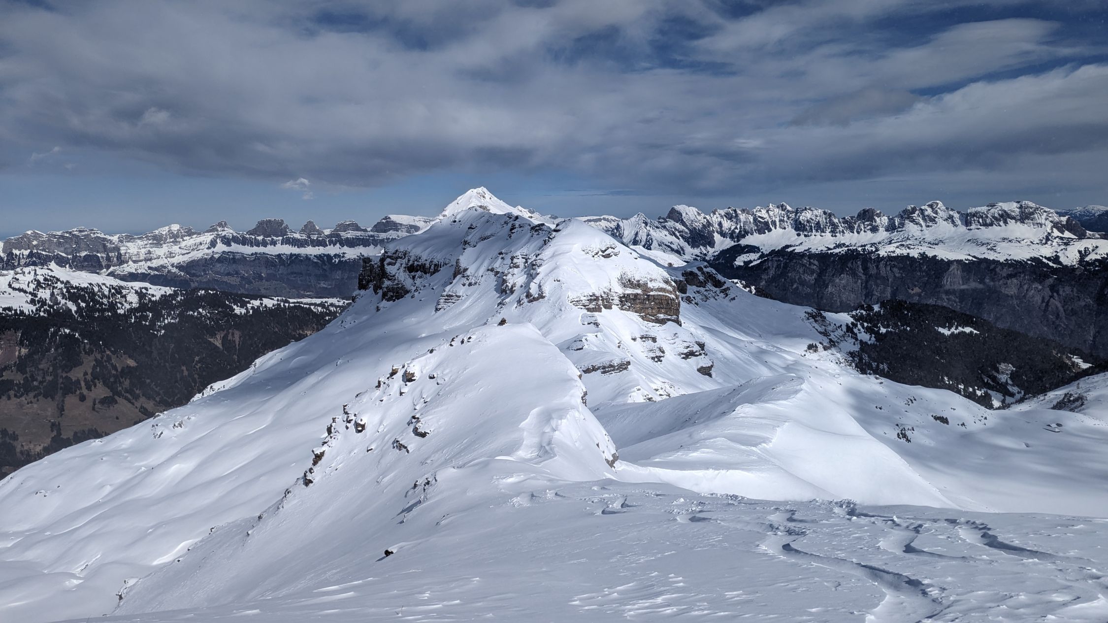 Unten auf fester Unterlage etwas Neuschnee, war schon zusammengefroren. Ab der Stufe hinauf zum Chläui auch pulvrig vllt 5cm, im Übergang dann eingeweht und bis zum Gipfel eher 10-20cm Pulver, windbeeinflusst. Ab Chläui auch mehr Sturm. Die Spur war damit leider nicht mehr besonders stabil.