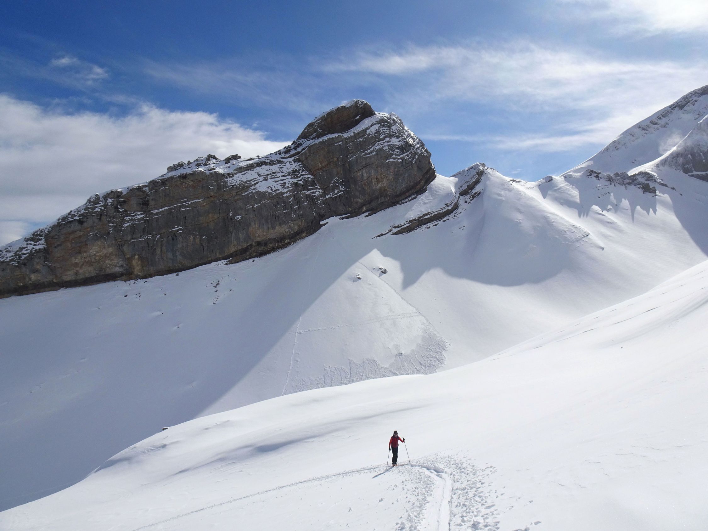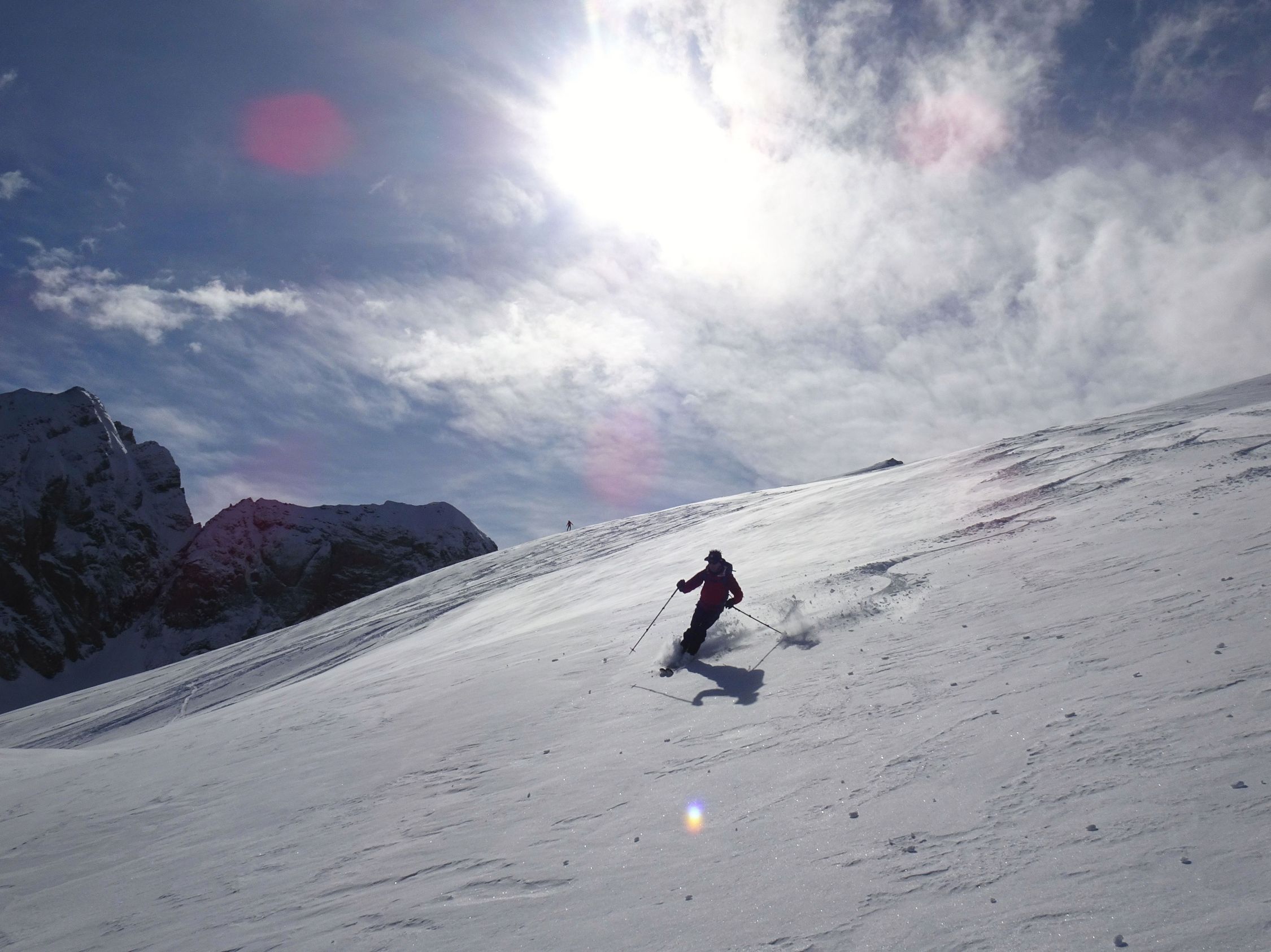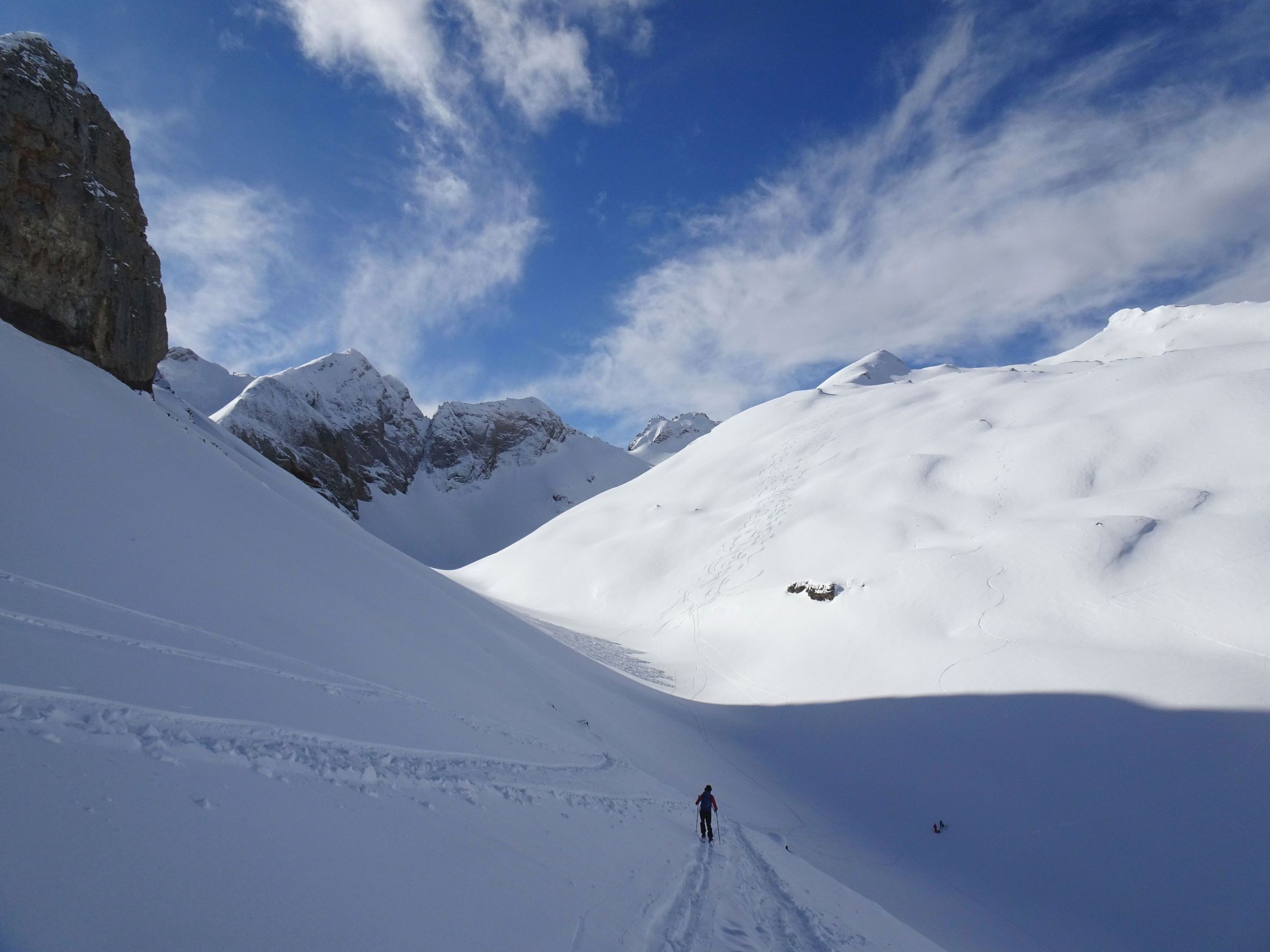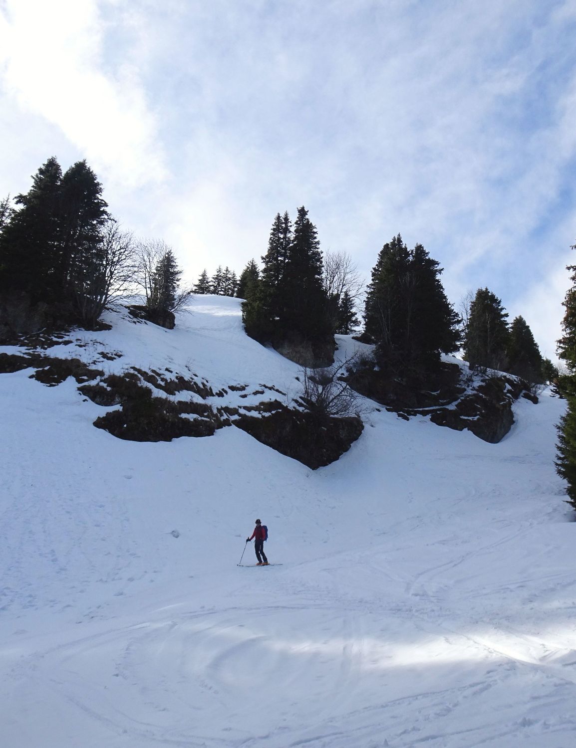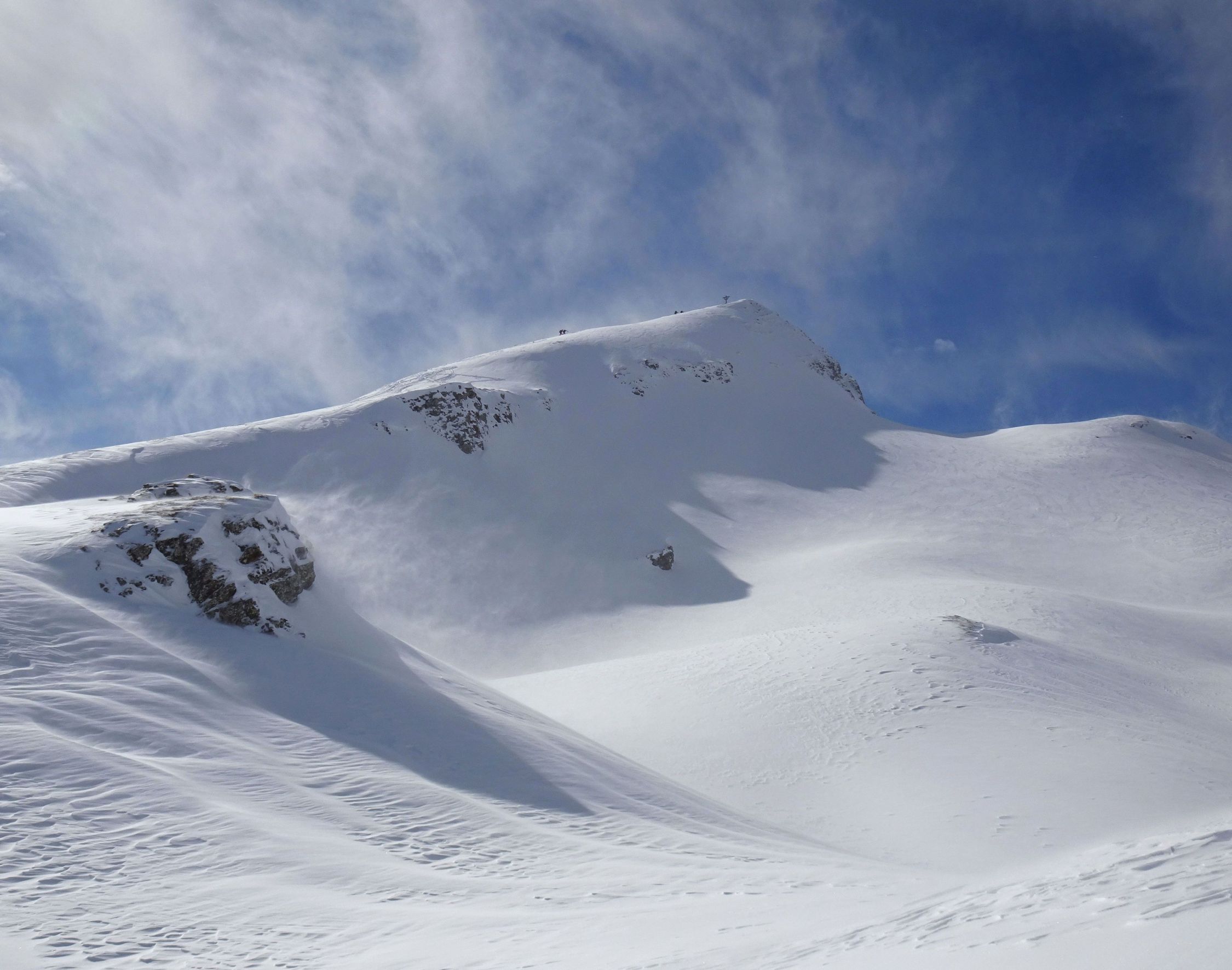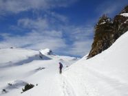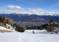 Abfahrt deutlich besser als erwartet, oben windgepresster Schnee, aber gut fahrbar. Trotz einiger Spuren noch genügend Platz vorhanden. Nach unten hin Schneedecke zunehmend feucht, teilweise firnartig. Insgesamt durchaus lohnend.