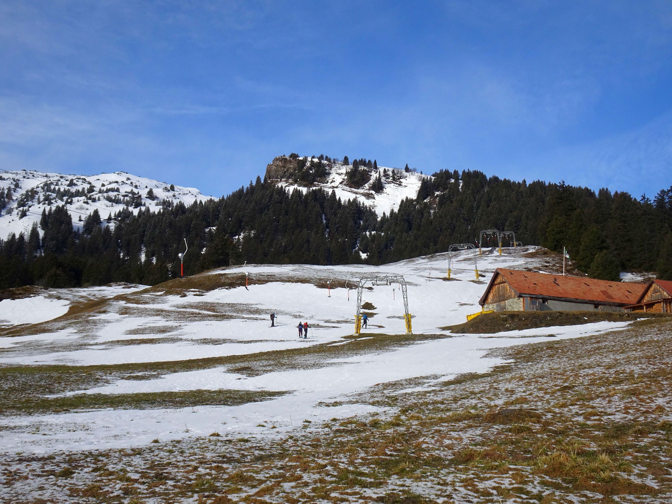 Ohne nennenswerten Neuschnee weitere Ausaperung der Piste und der kurzen Waldpassage. Oberhalb noch länger gut.