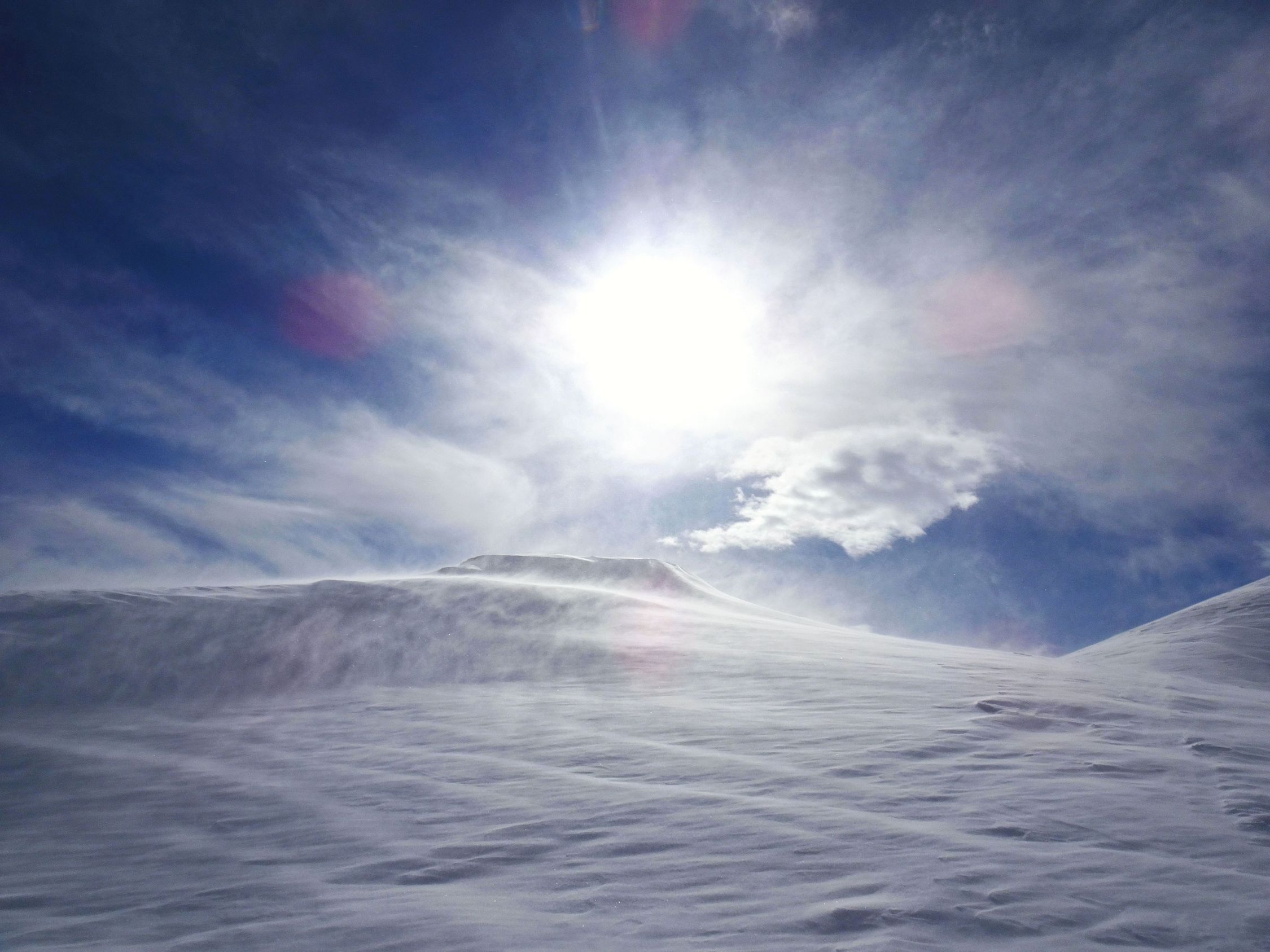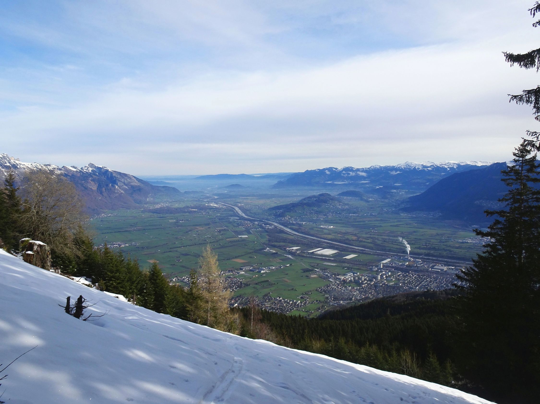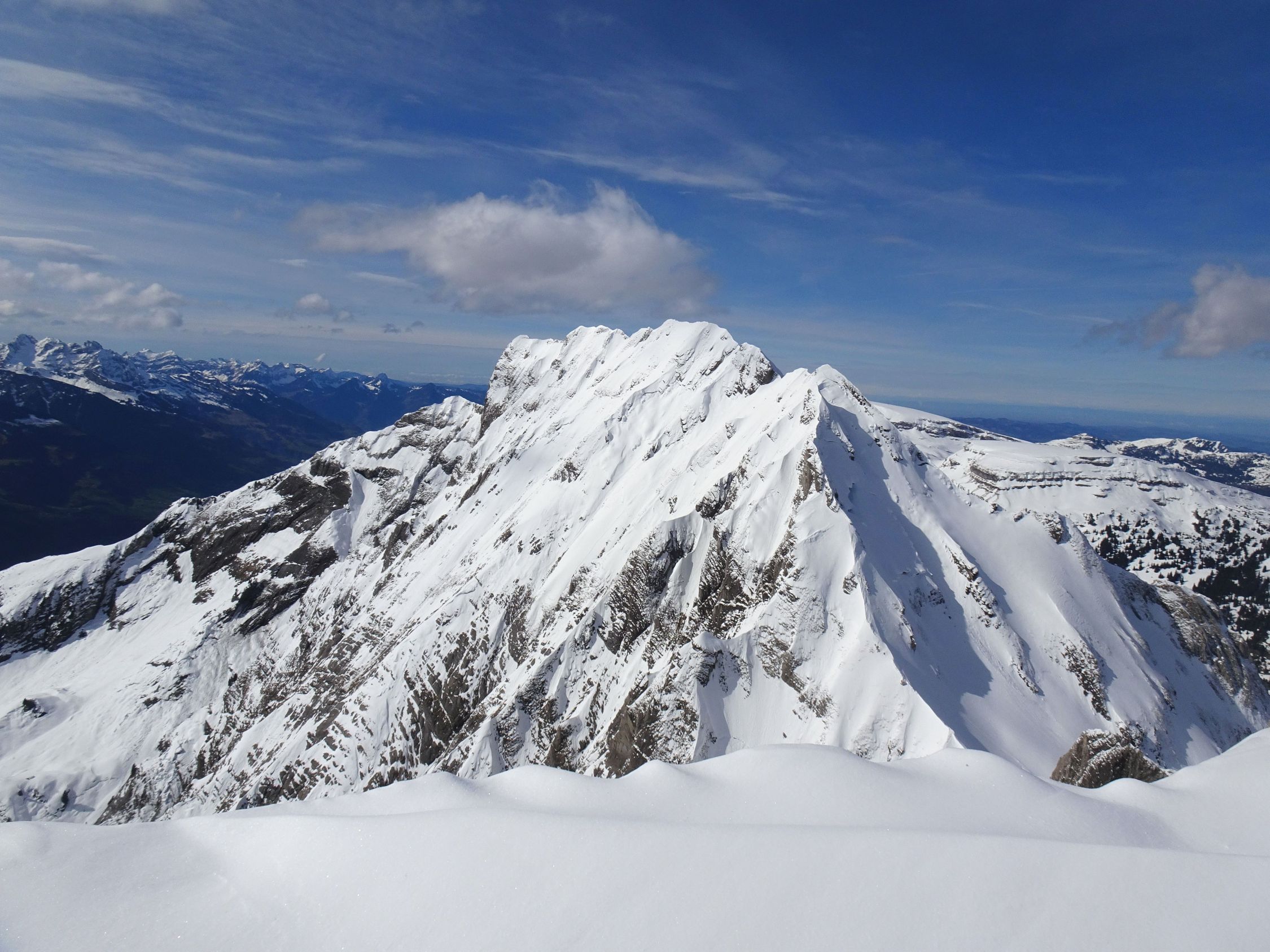 Wetter schon vormittags stürmisch, vor allem in den Hängen unterhalb des Gipfels. Am Gipfel selbst dann erstaunlich wenig Wind und verhältnismässig warm. Durch den Föhn sehr sonnig und gute Fernsicht.