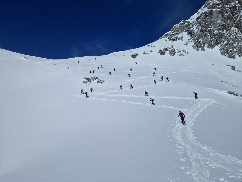 Nein, mein Fokus gilt der Sensibilisierung für das Verhalten am Berg bei großen Ansammlungen. Als ich von der Botaloch-Seite her die schmale Rinne (ein paar Schritte mit den Ski am Rucksack im kompakten Trittschnee, ging sehr gut) zum Sporaturm kam, wurden meine kühnsten (negativen) Erwartungen bei weitem übertroffen. Eine Karawane von Skitourengehern zog vom Tiergarten her. Alle mit dem gleichen Ziel. Möglichst schnell auf einem der beiden Türme zu stehen. Vor dem rund 35° steilen Hang zur Einsattelung, von welcher dann der Schlusshang zum jeweiligen Gipfel führt, nahmen die Ereignisse dann ihren Lauf. Nein, es ist zum Glück nichts passiert, die Katastrophe nicht eingetreten. Aber: Ungeachtet der um Entlastungsabstände bittenden Damen und vorsichtigen Herren zog die Menschenmenge ihre Spuren (insgesamt derer vier!) durch den Hang. Kreuz und quer. Zum Teil führten sie dann in der Mitte wieder zusammen, sodass sich plötzlich sechs, sieben Bergbegeisterte auf einem Fleck wiederfanden. Was für ein Schauspiel! Ich reihte mich schließlich gegen Ende ein (echtes Rolltreppenfeeling wie in einem Einkaufszentrum) und machte mich schon bei der oben angesprochenen Einsattelung bereit zur Abfahrt. Dort noch schnell ein Foto von der Teilmenge der Aspiranten. Dann gönnte ich ihnen das Gipfelerlebnis und mir dafür die first line bis zur Lindauer Hütte.