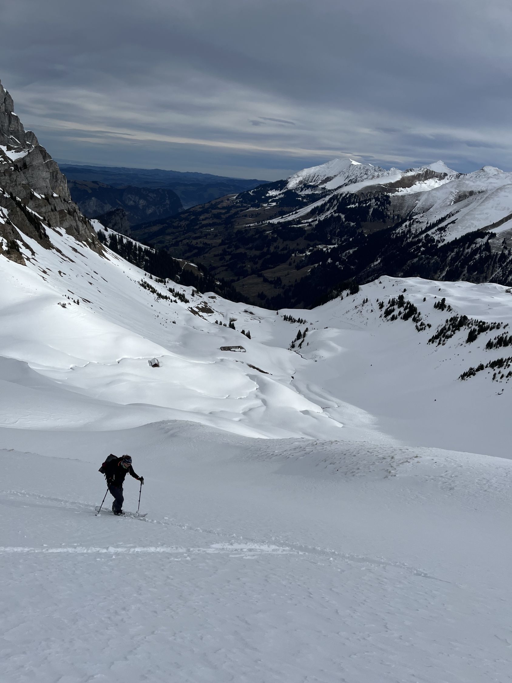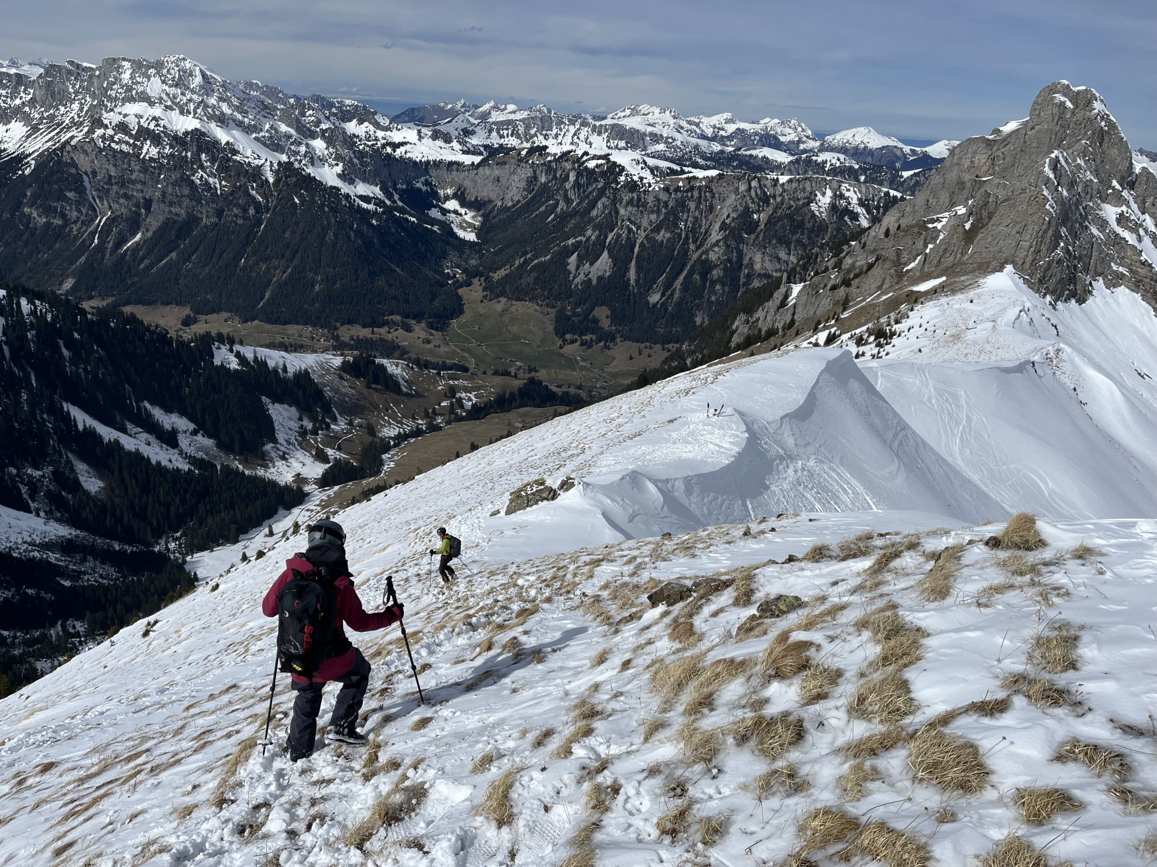 Zu Beginn (Ramse) knappe Schneemengen. Aber bereits wenige hm später gute Schneeverhältnisse. Oben verfrachteter Pulverschnee. Grat leicht abgeblasen. Abfahrt der Aufstiegsroute entlang bei guten Schneeverhältnissen. Wir haben den Gipfelhang zweimal gemacht.
