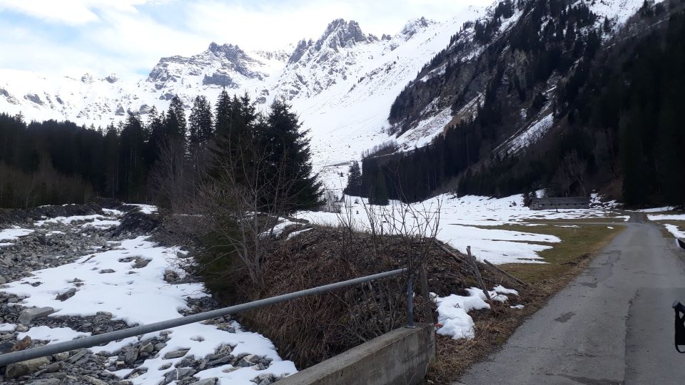 Suffisamment de neige pour descendre à ski jusqu'au lieu de départ. Nécessite de déchausser plusieurs fois pour traverser la route sans neige.