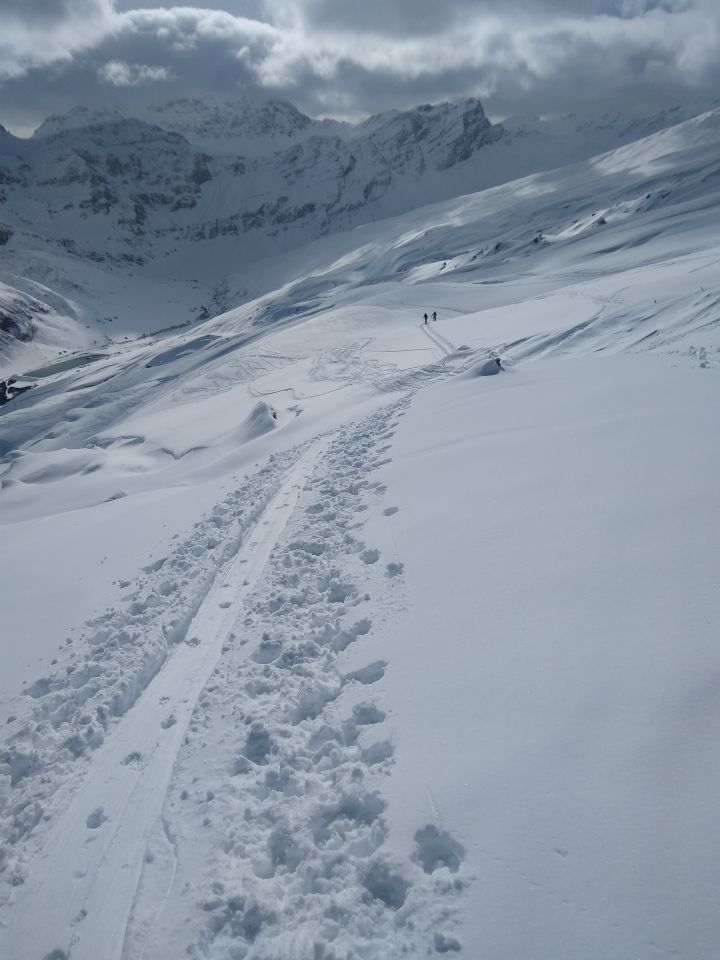 Frühjahrsneuschnee auf tragender Unterlage. Stellenweise etwas windbearbeitet
