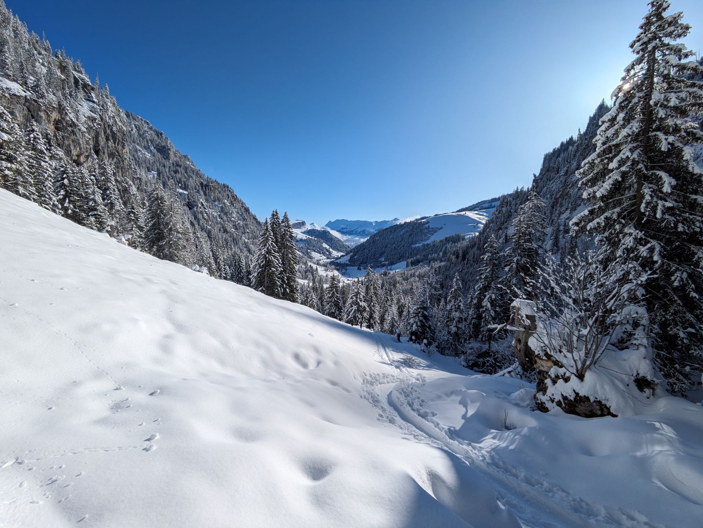 Toller Neuschnee im ganzen Gebiet! Im Meniggrund lagen heute um 9 Uhr über 20cm Pulverschnee (ohne Unterlage). Daher Aufstieg problemlos ab Parkplatz möglich. Ab Brätliplatz dann mit Unterlage und mit noch mehr Neuschnee, zirka 30cm an den höheren Lagen.